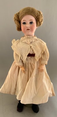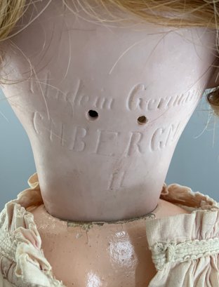 23” CM Bergman, blue glass sleep eyes with lashes (reset), OM with teeth, blonde mohair wig, BJCB, off white dress (stains)