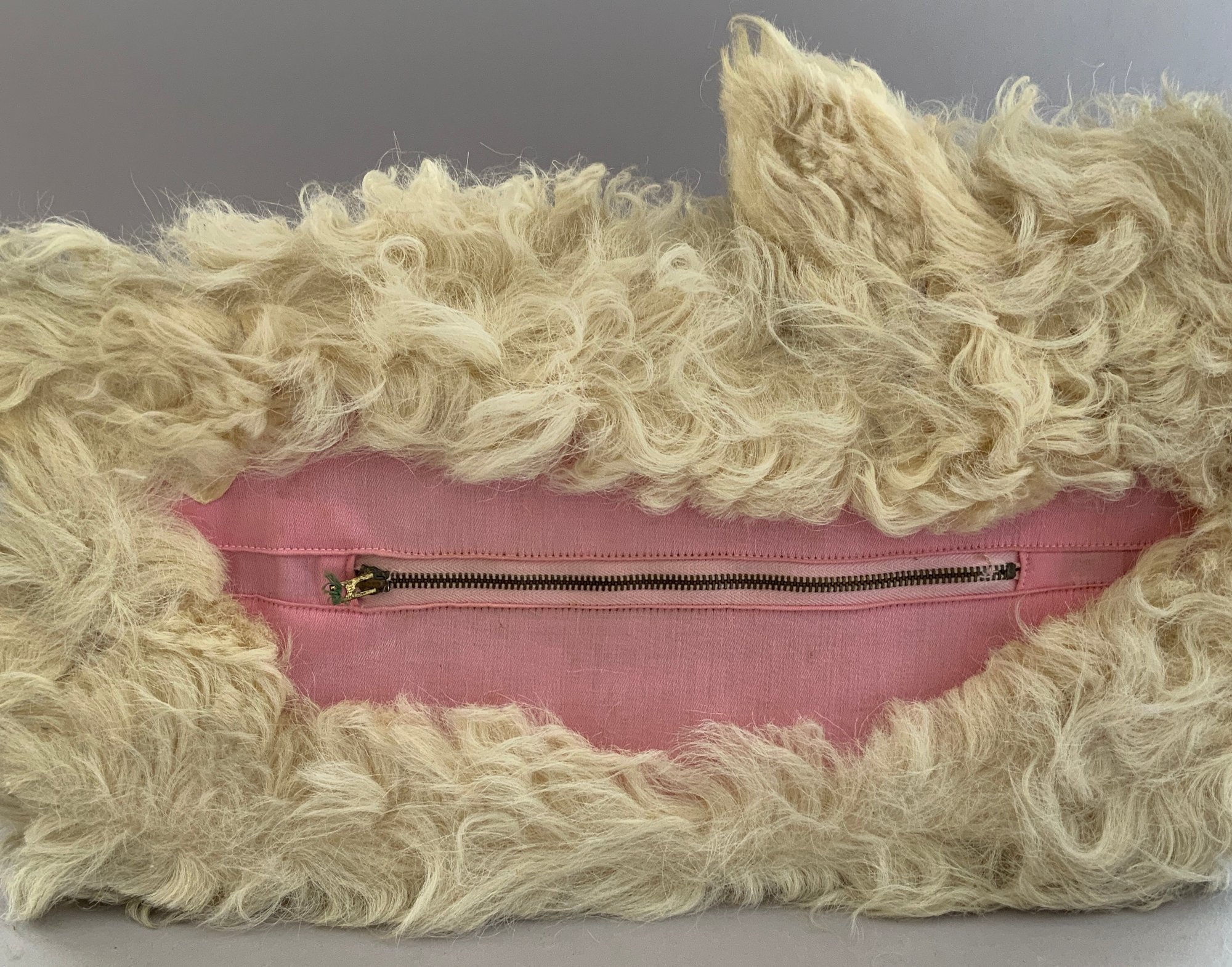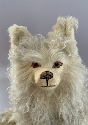 23” French pajama dog, white mohair fur, glass eyes, zipper pouch on bottom of dog, skin face