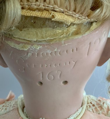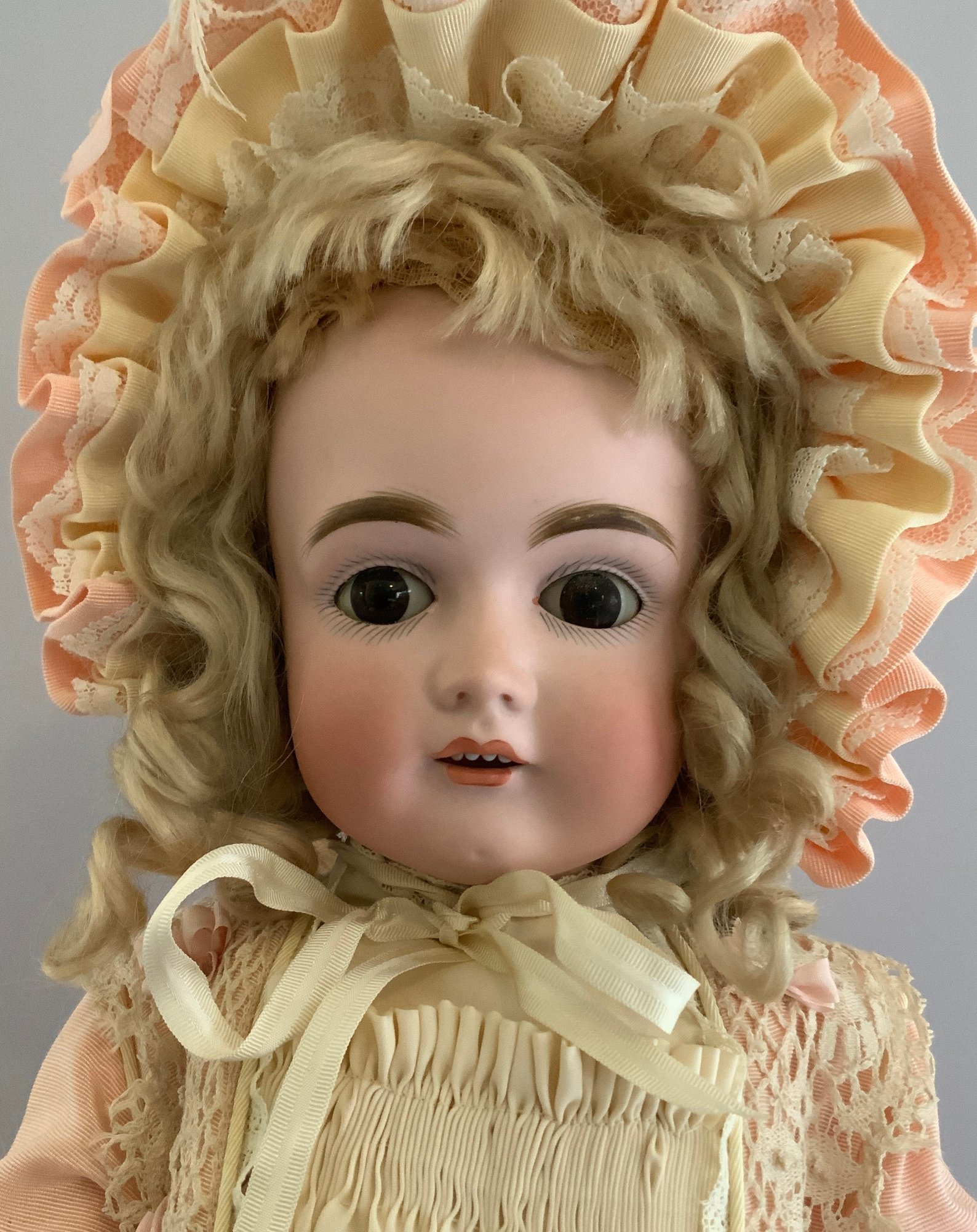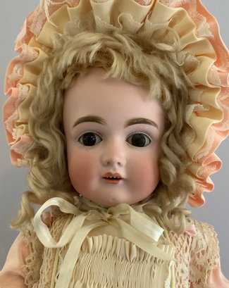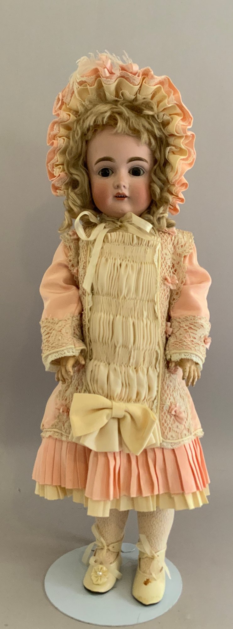 23” Kestner 167, brown glass eyes, OM with teeth, blonde mohair wig, BJCB, peach/white dress