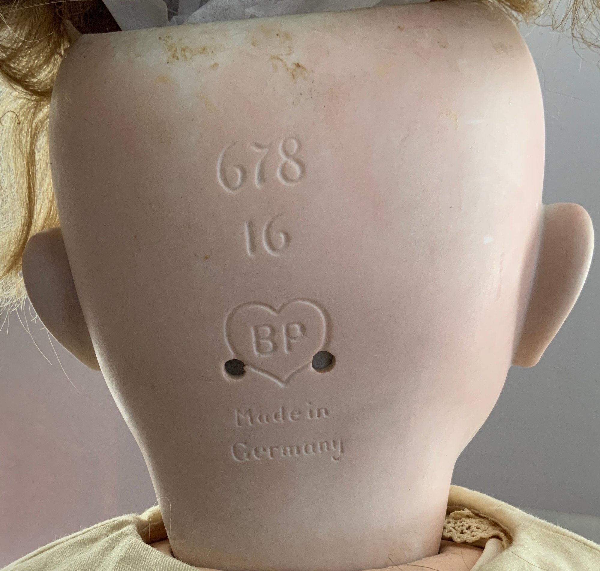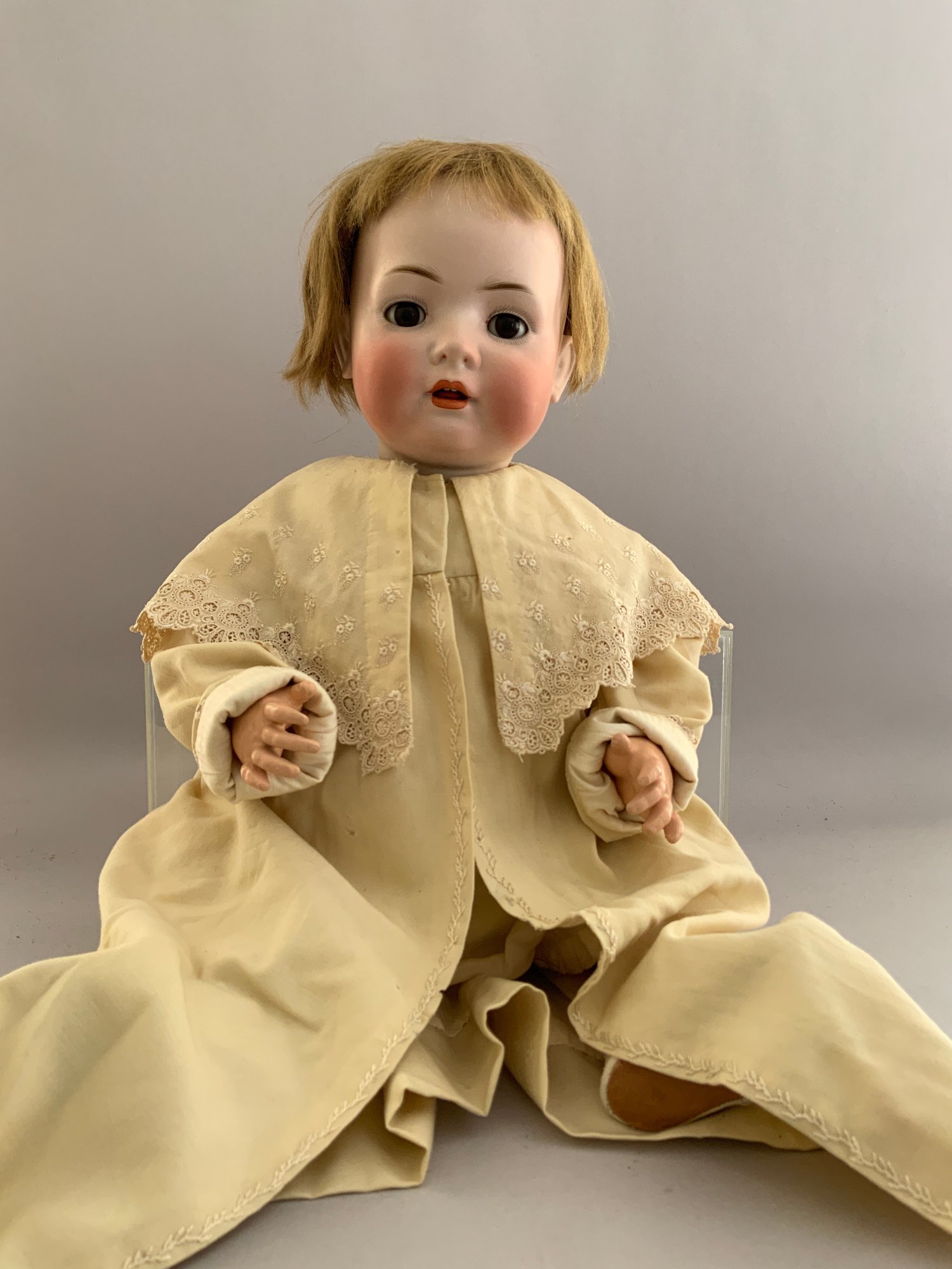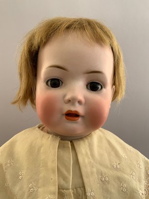 24” Bahr & Proschild 678 16, brown glass sleep eyes, OM with teeth/tongue, blonde mohair wig, compo baby body, off white outfit (few holes)