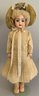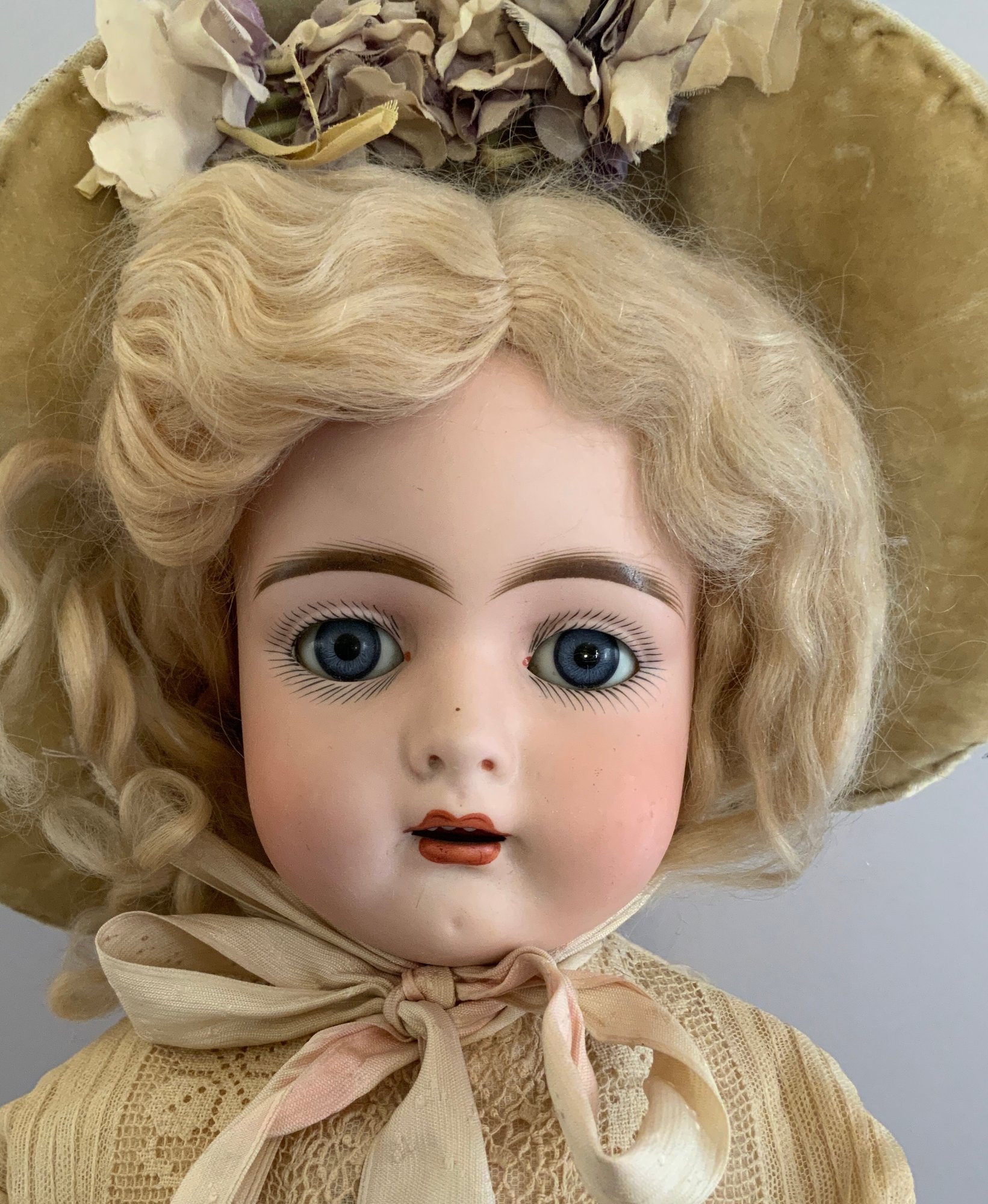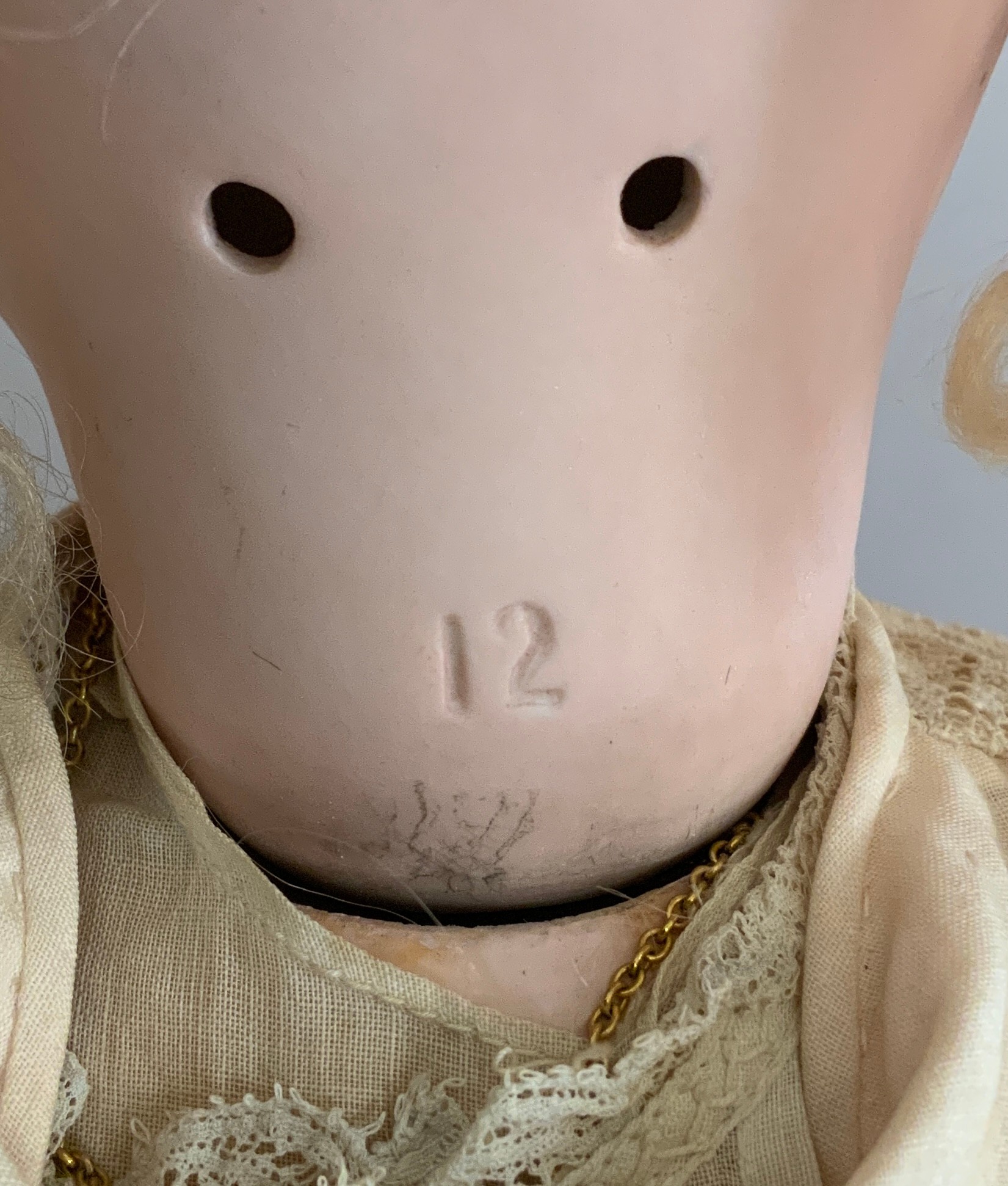 24” Bisque 192 12 child doll, blue glass eyes, OM with teeth, PE, blonde mohair wig, BJCB, off white lace dress (stains, pink shoes