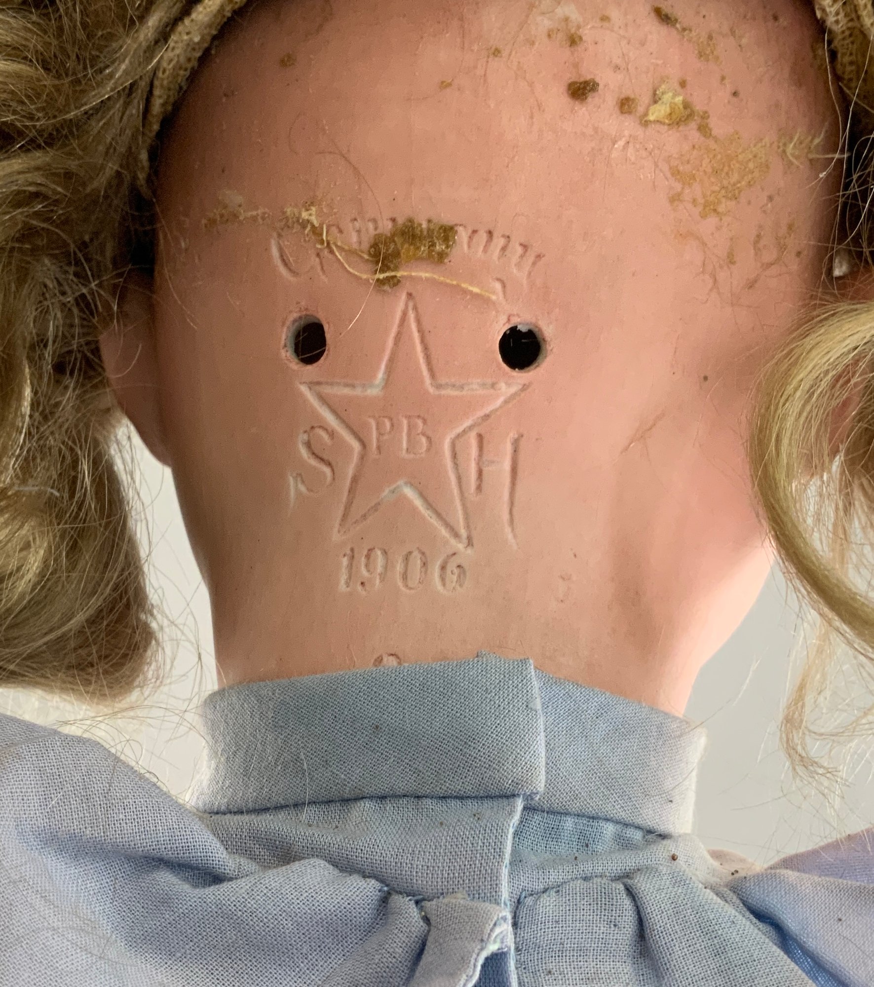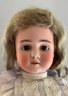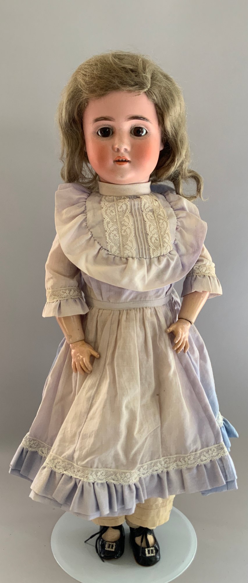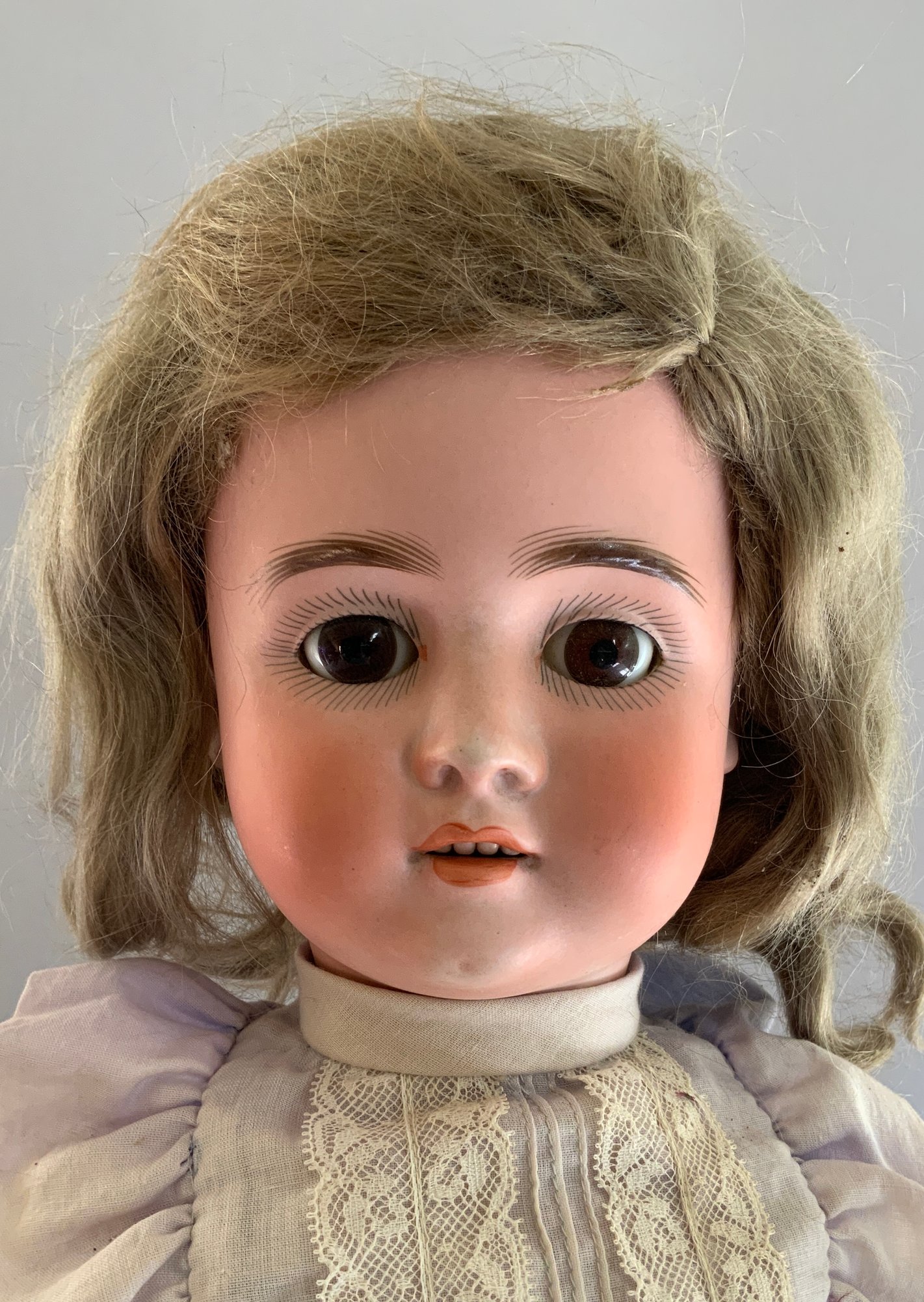 24” Bisque S&H PB 1906, brown glass eyes, OM with teeth, blonde mohair wig, BJCB, faded blue dress