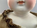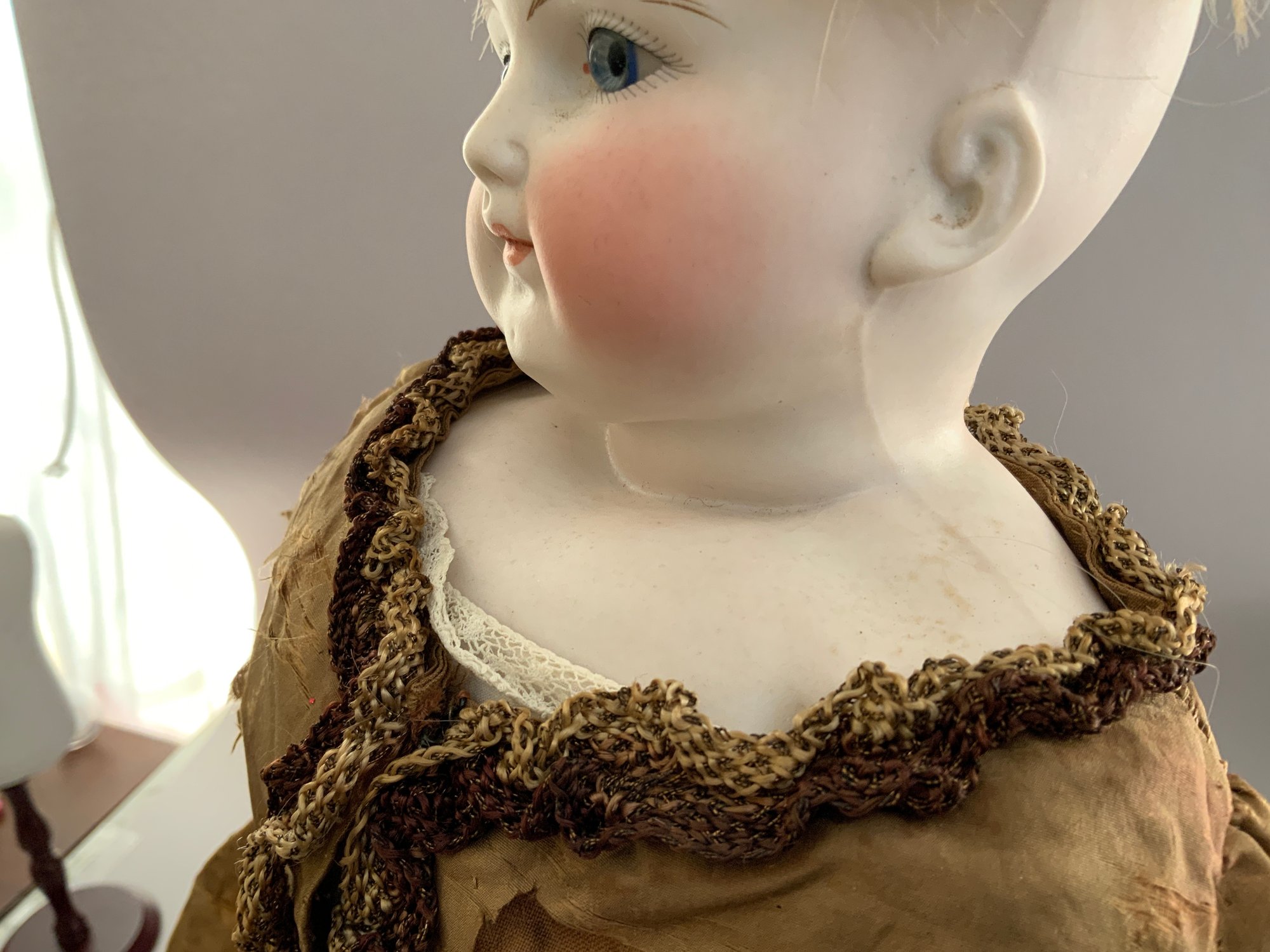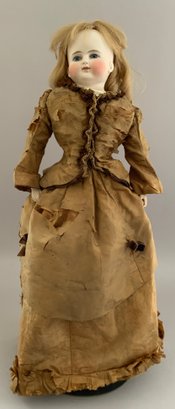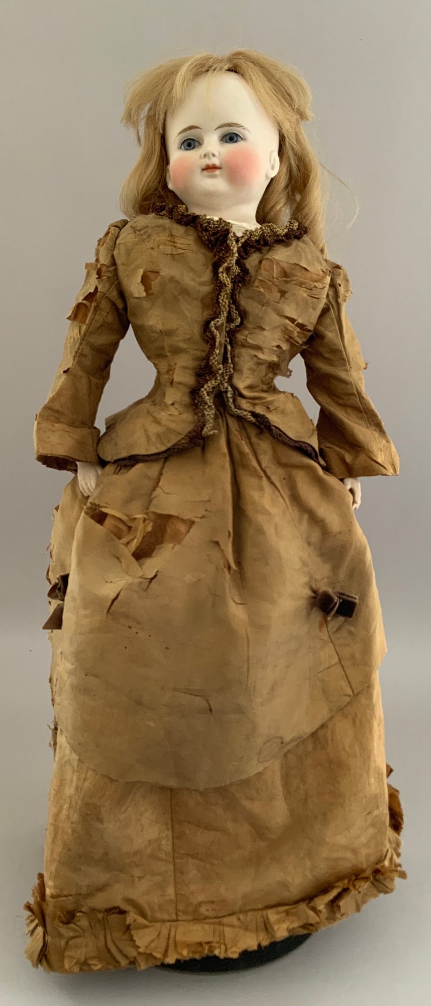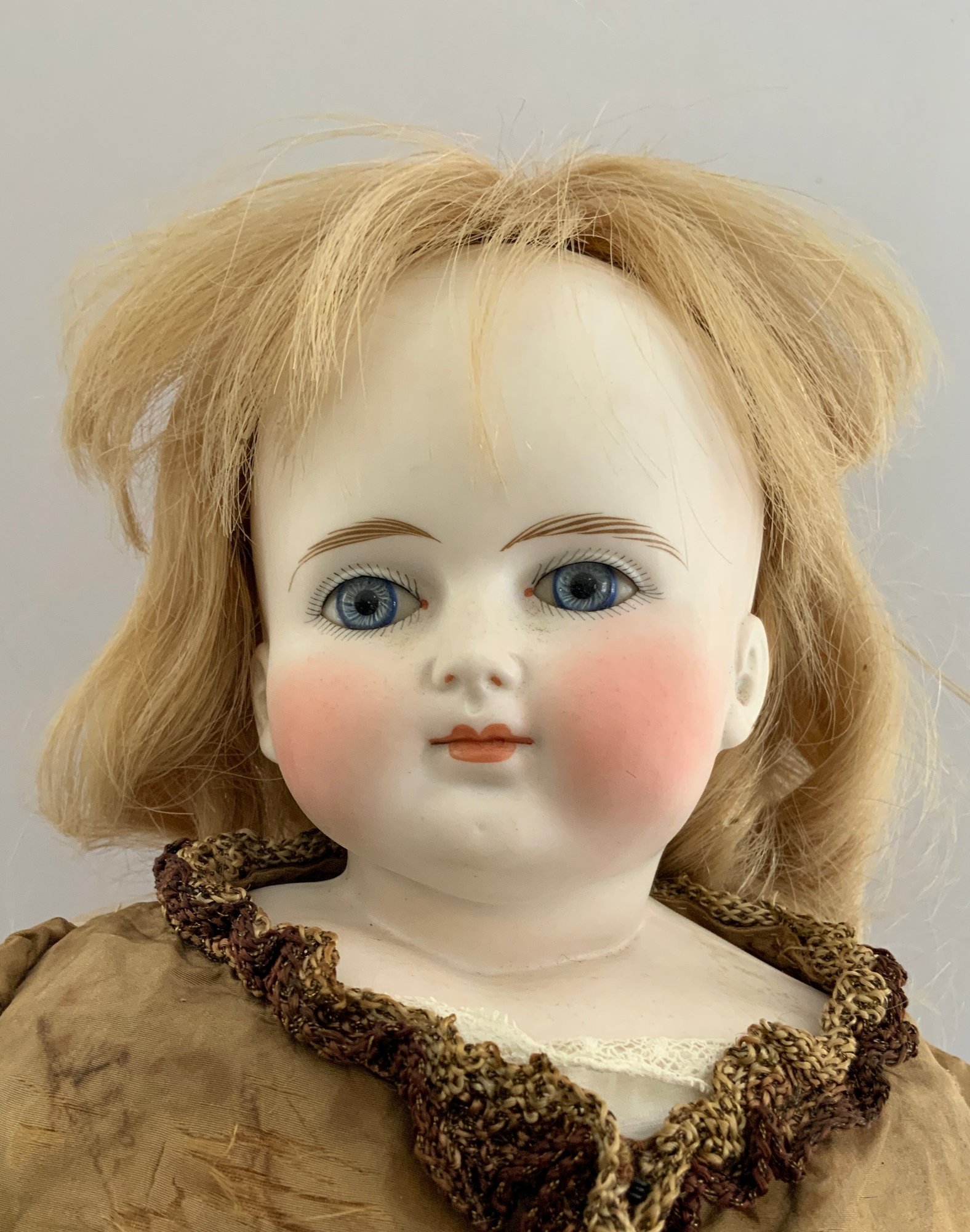 24” Bisque turned shoulder head dome head, blue glass eyes, CM, blonde mohair wig, cloth body with bisque limbs, brown silk dress (melting badly)