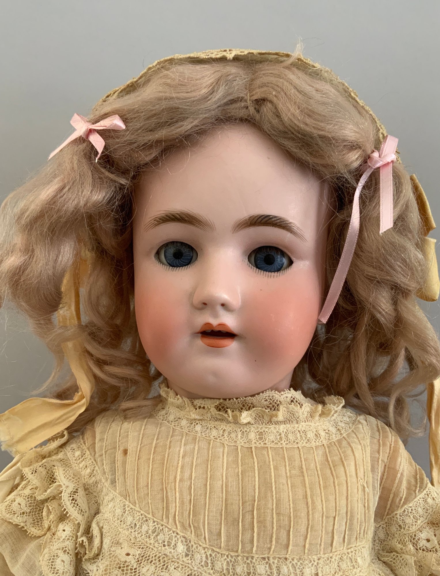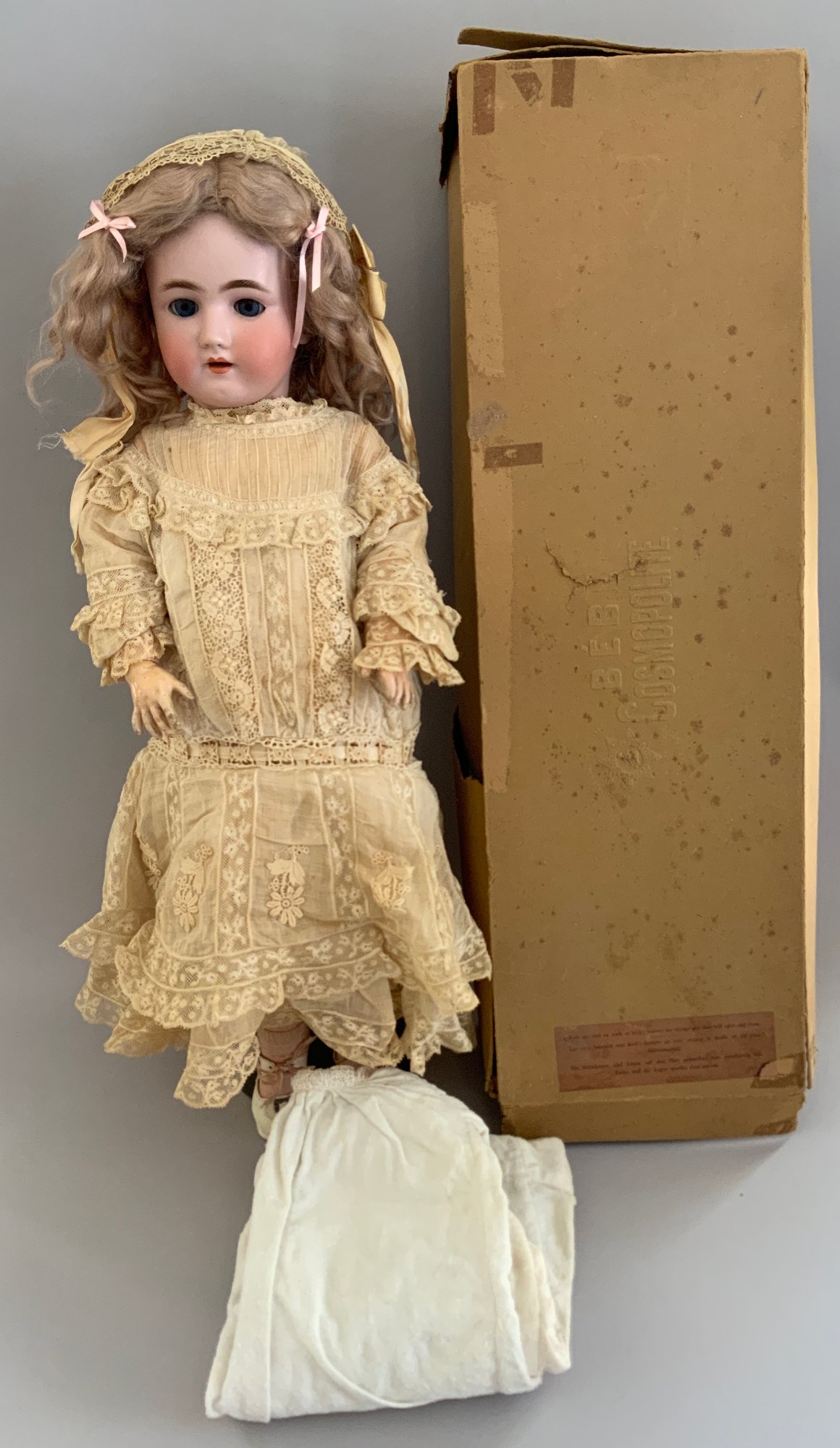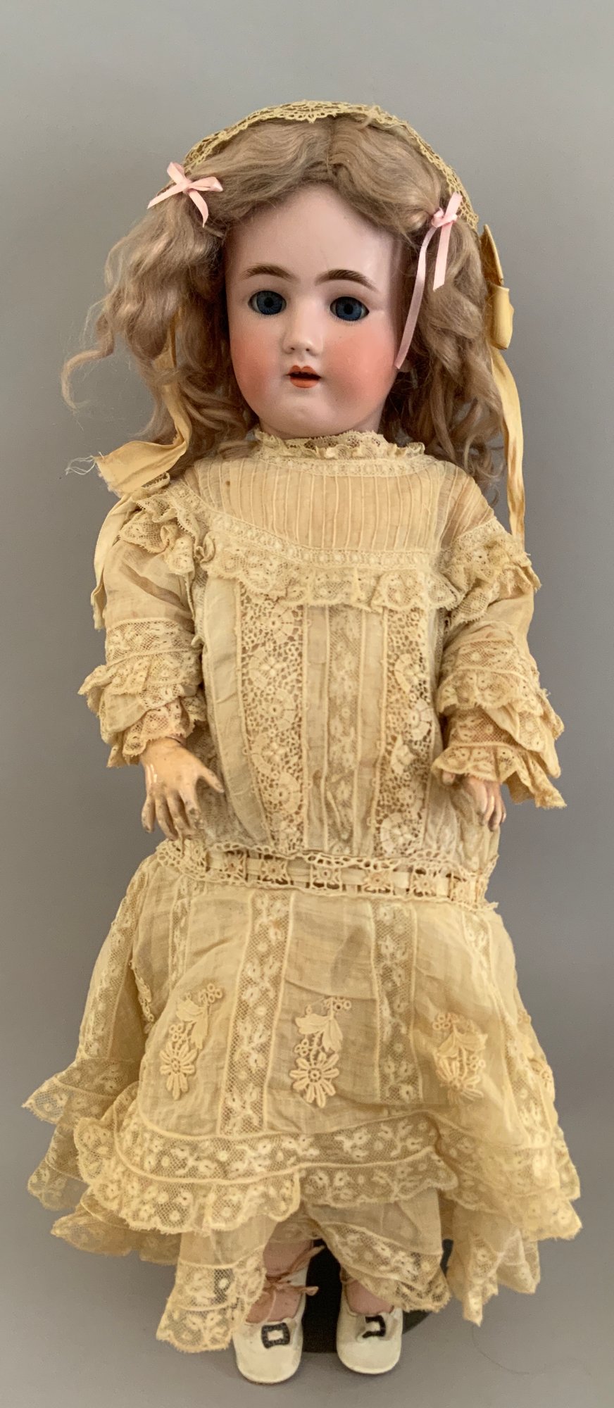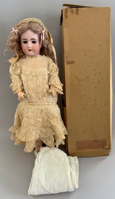 24” Heinrick Handwerck/Simon Halbig (W on forehead)11, blue glass sleep eyes, OM with teeth, PE (right nick), blonde mohair wig, pull string crier, white needle work dress (wear & stains), original box (as is), (rough fingers right hand)
