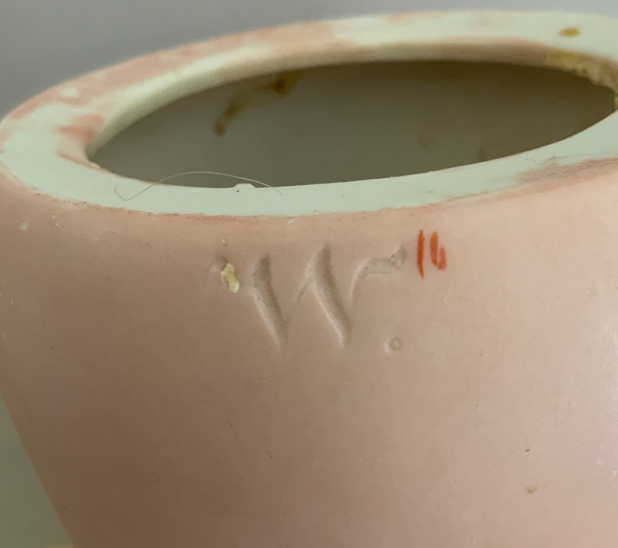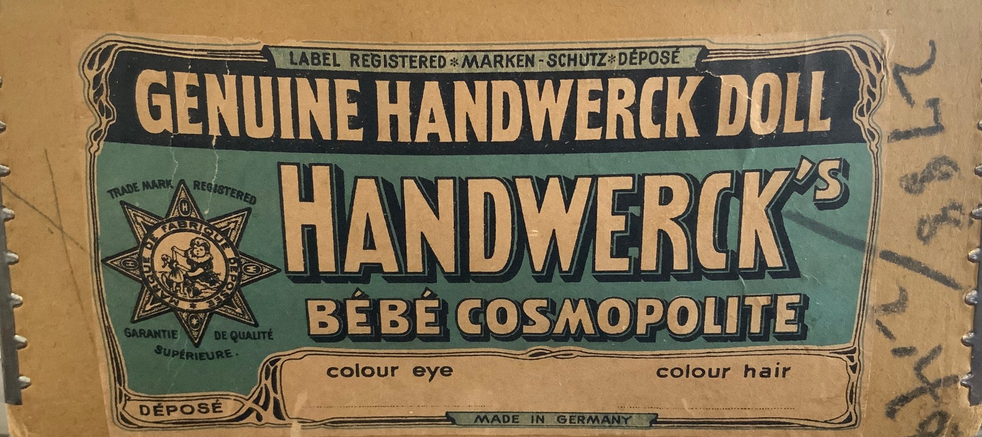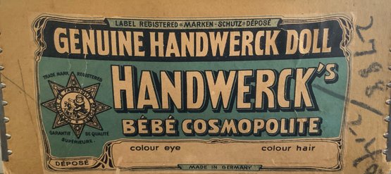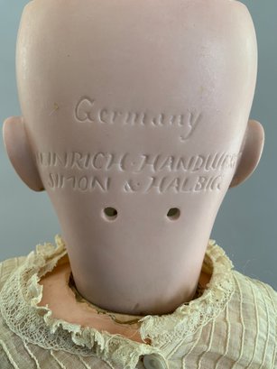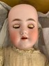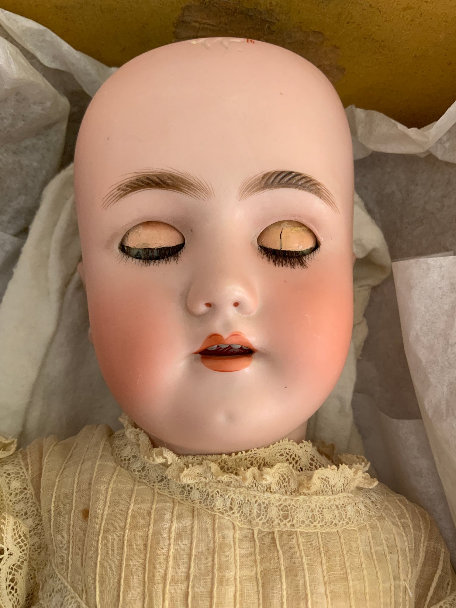 24” Heinrick Handwerck/Simon Halbig (W on forehead)11, blue glass sleep eyes, OM with teeth, PE (right nick), blonde mohair wig, pull string crier, white needle work dress (wear & stains), original box (as is), (rough fingers right hand)