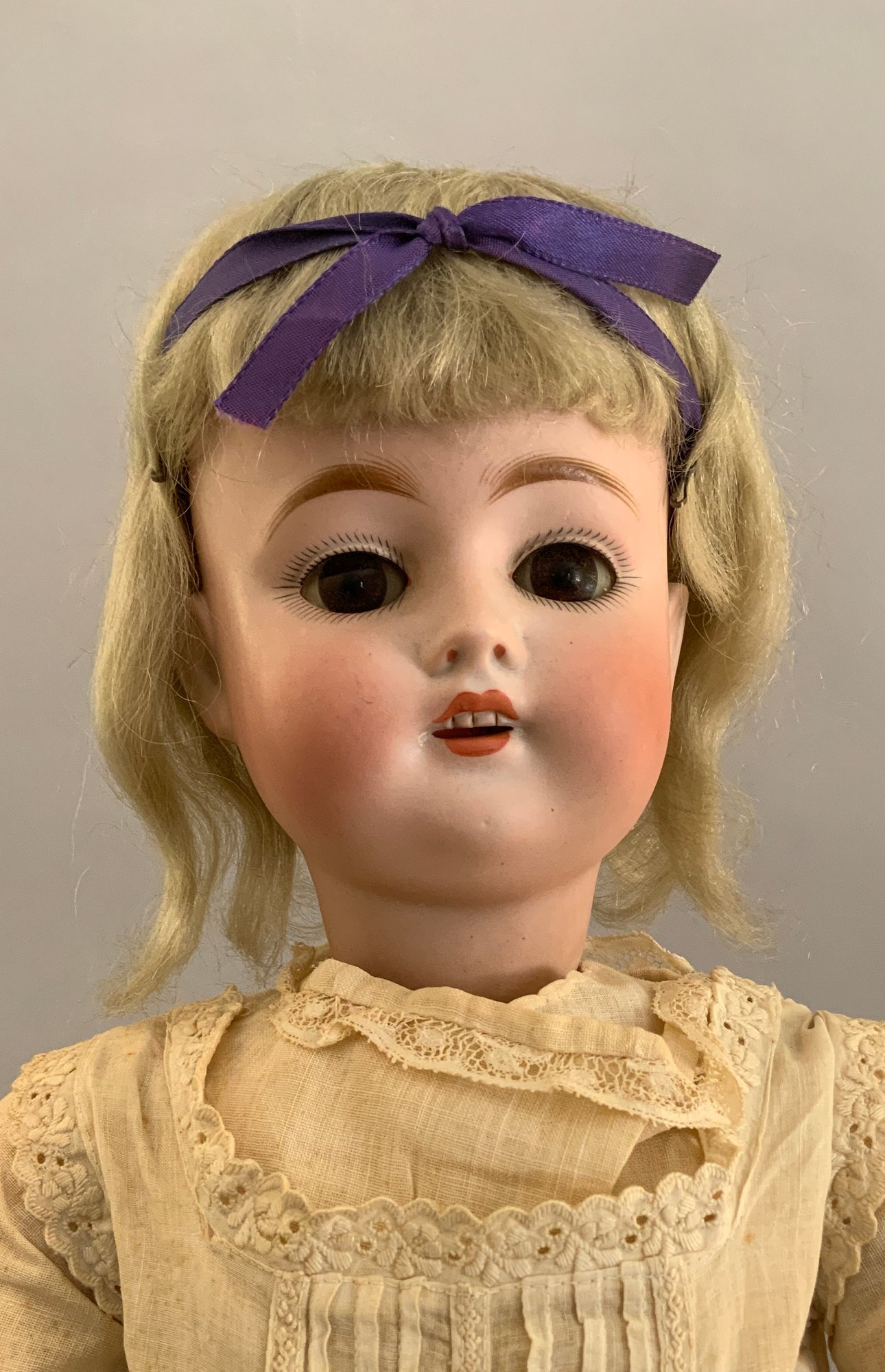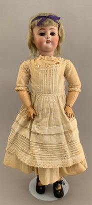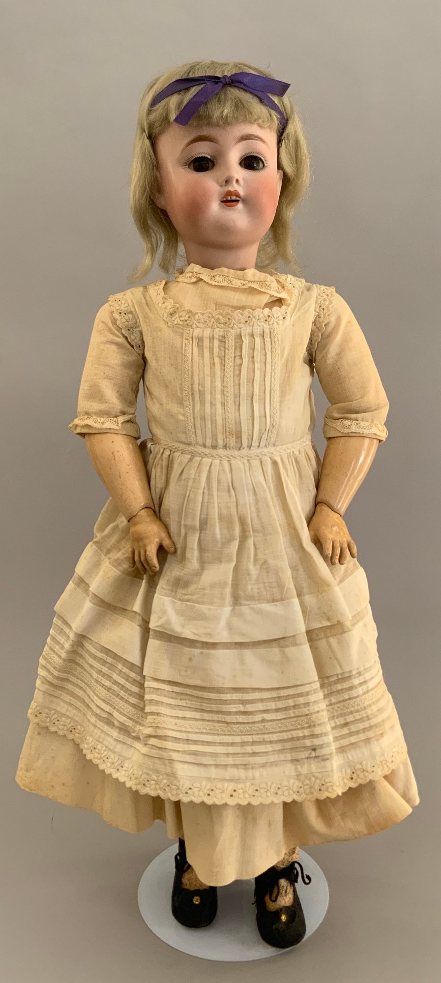 24” Kestner 168, brown glass sleep eyes, OM with teeth, blonde mohair wig, BJCB, white dress (stains)