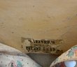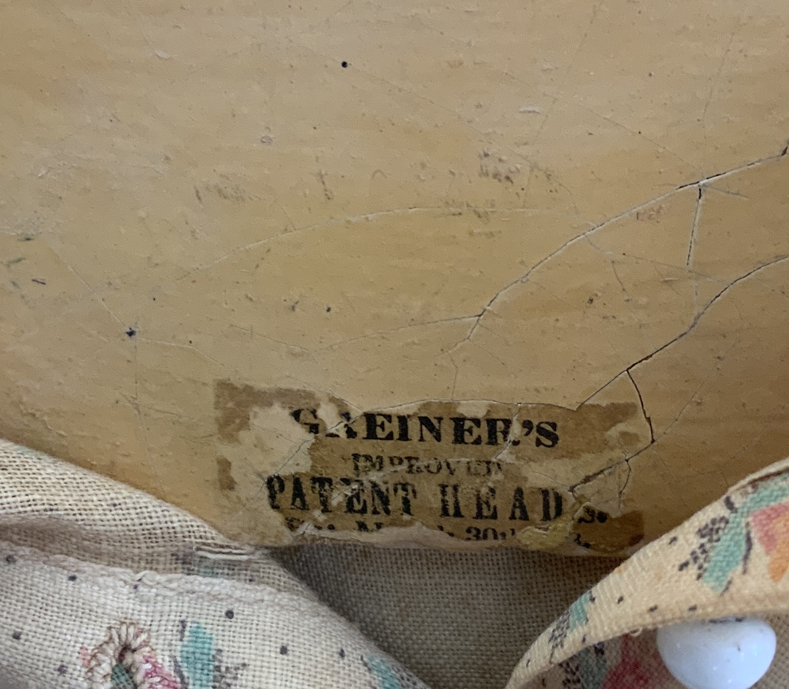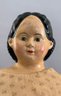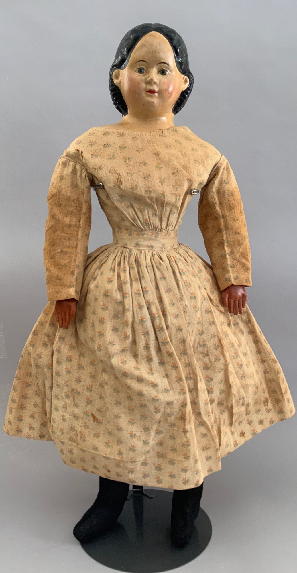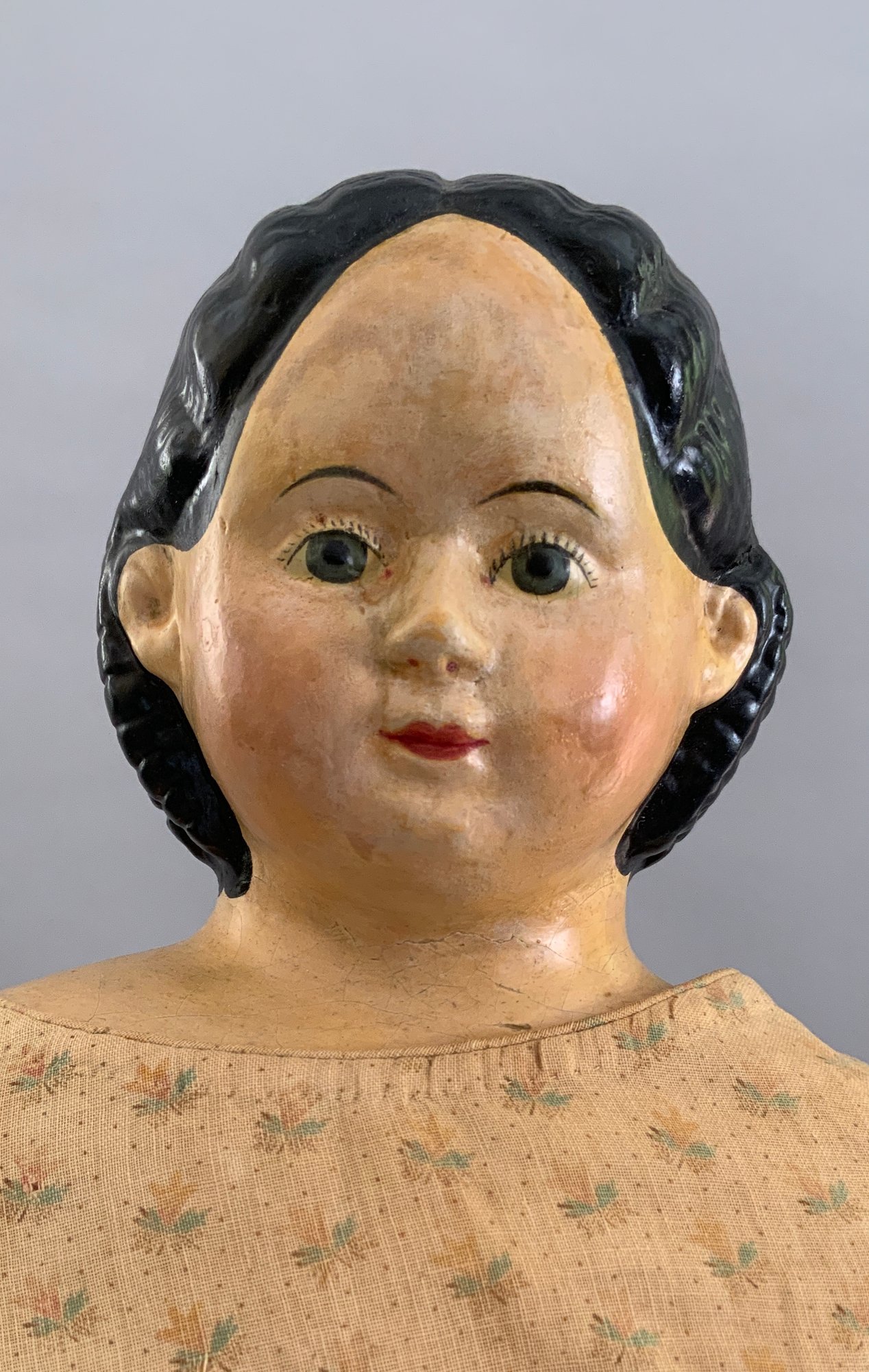 24” Paper mache shoulder head, painted features, black sausage curls, Greiner’s label, cloth body leather hands, early antique dress (as is)