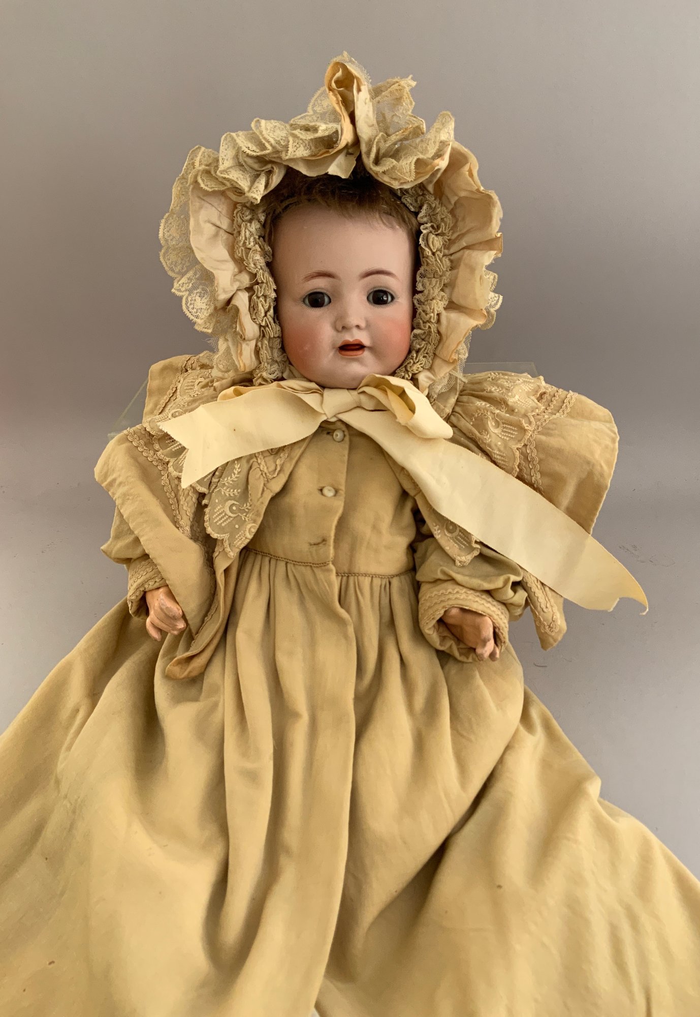 24” S&H K*R 128, brown glass sleep eyes, OM with teeth/tongue, brown mohair wig, Baby compo body, beige jacket (few holes), (head needs stringing)