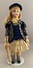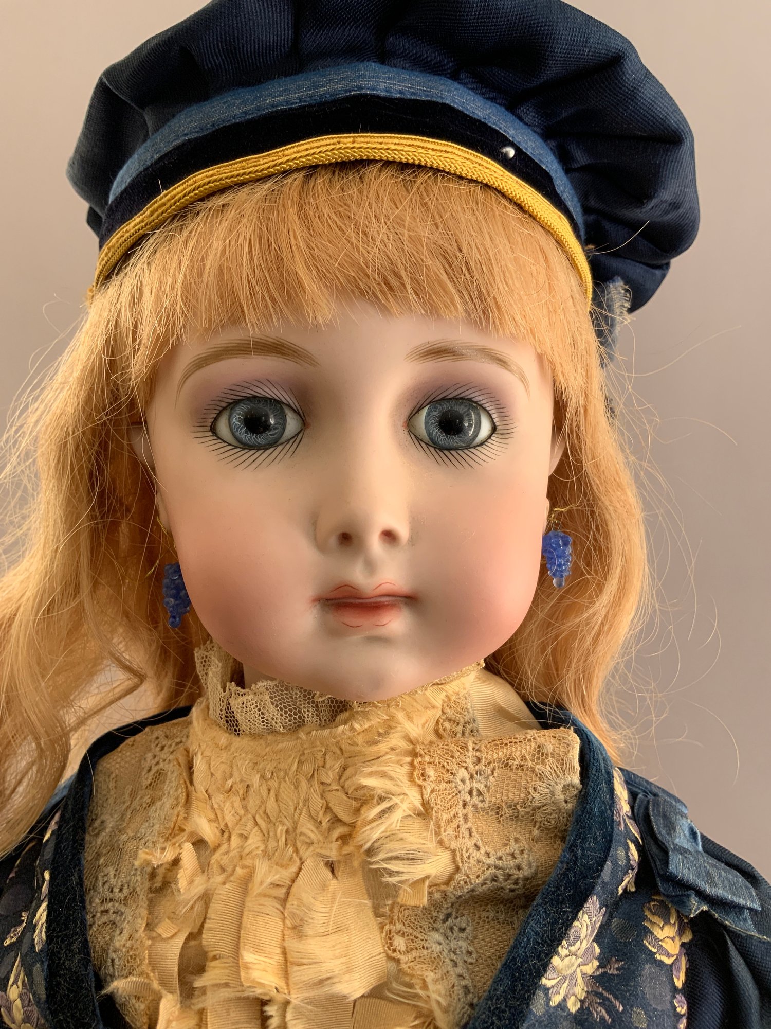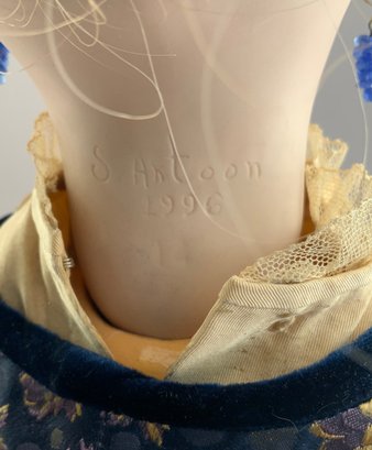 24” Shirley Antoon 1990 Artist Doll: Long Face Jumeau, blue paper weight eyes, CM, PE, blonde mohair wig, compo body, dressed in old fabric (melting) with a parasol