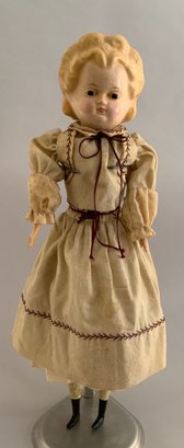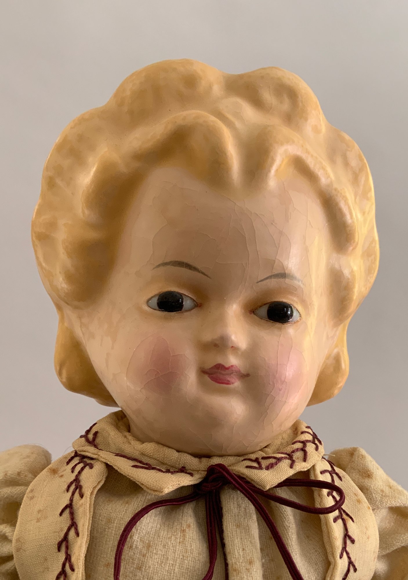 24” Wax over papier Mache, “pumpkin-type” Shoulder head (wax has crazing possibly restored), inset pupil-less glass eyes, c/m, molded hair w/ black ribbon, cloth body w/ wooden arms & legs, white wool dress w/ soutash braid, (as-is)