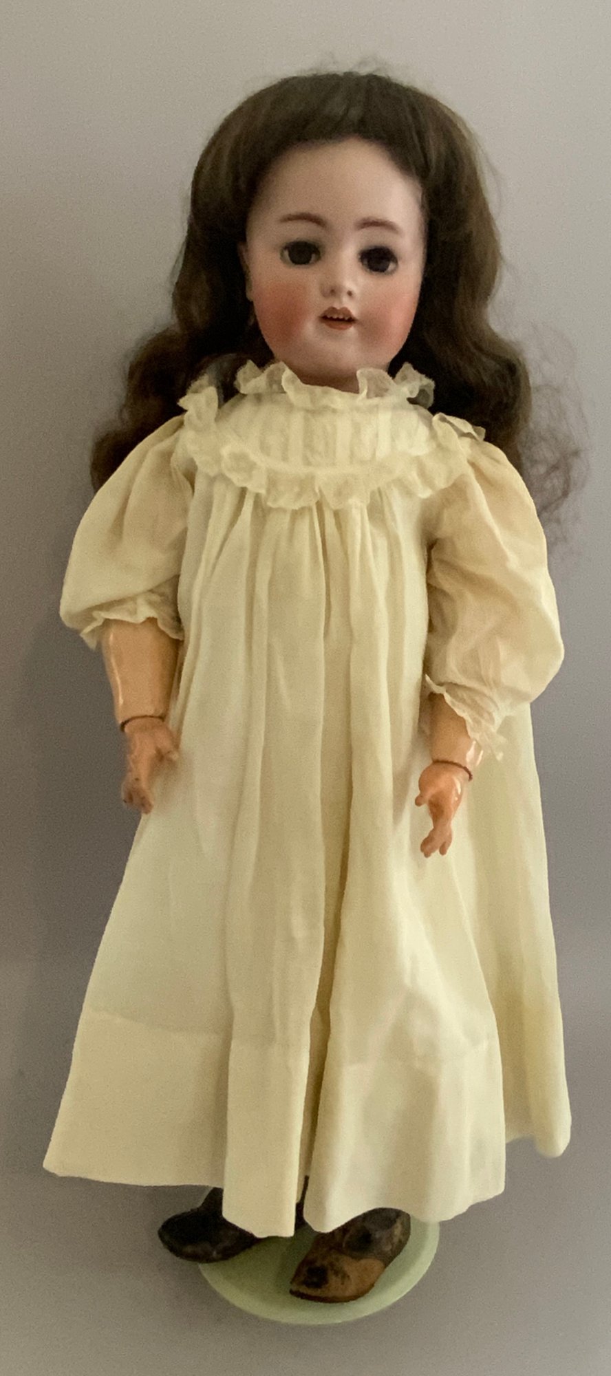 25” 1078, S&H 12, blue glass sleep eyes, OM with teeth, PE, brown mohair wig, BJCB, white outfit