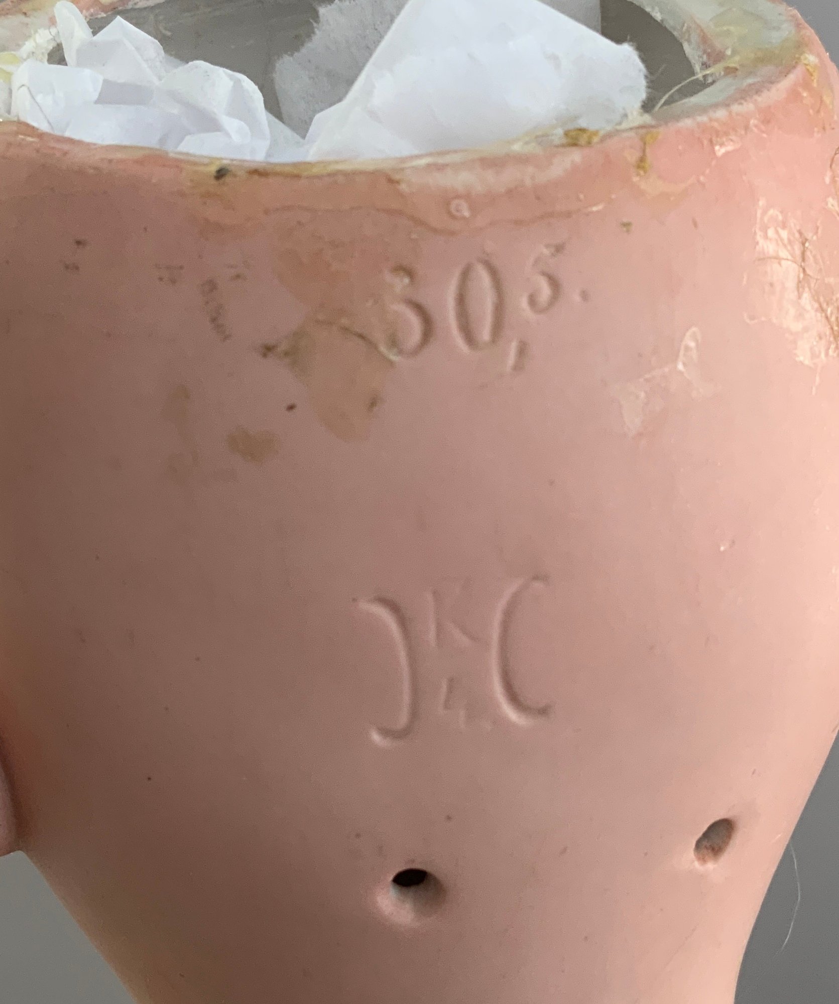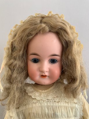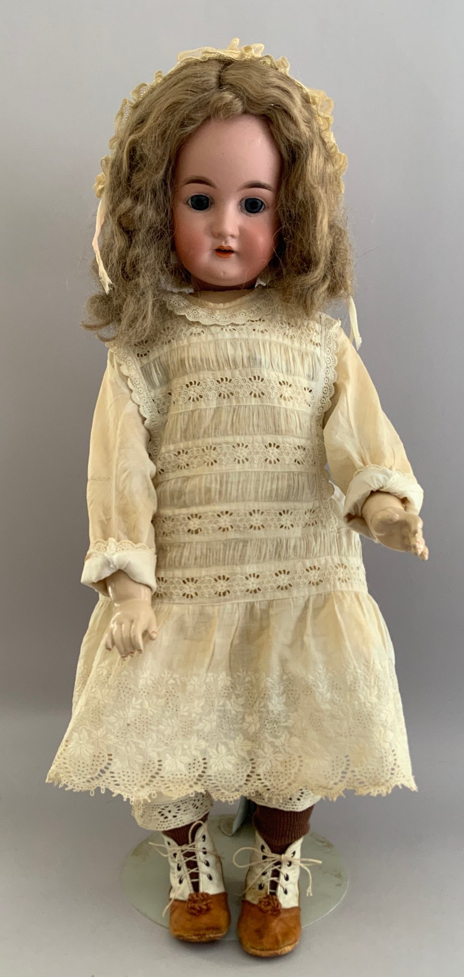 25” Bisque Karl Hartman 30, blue glass eyes (re-set), OM with teeth, blonde mohair wig, BJCB (repairs), white outfit