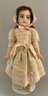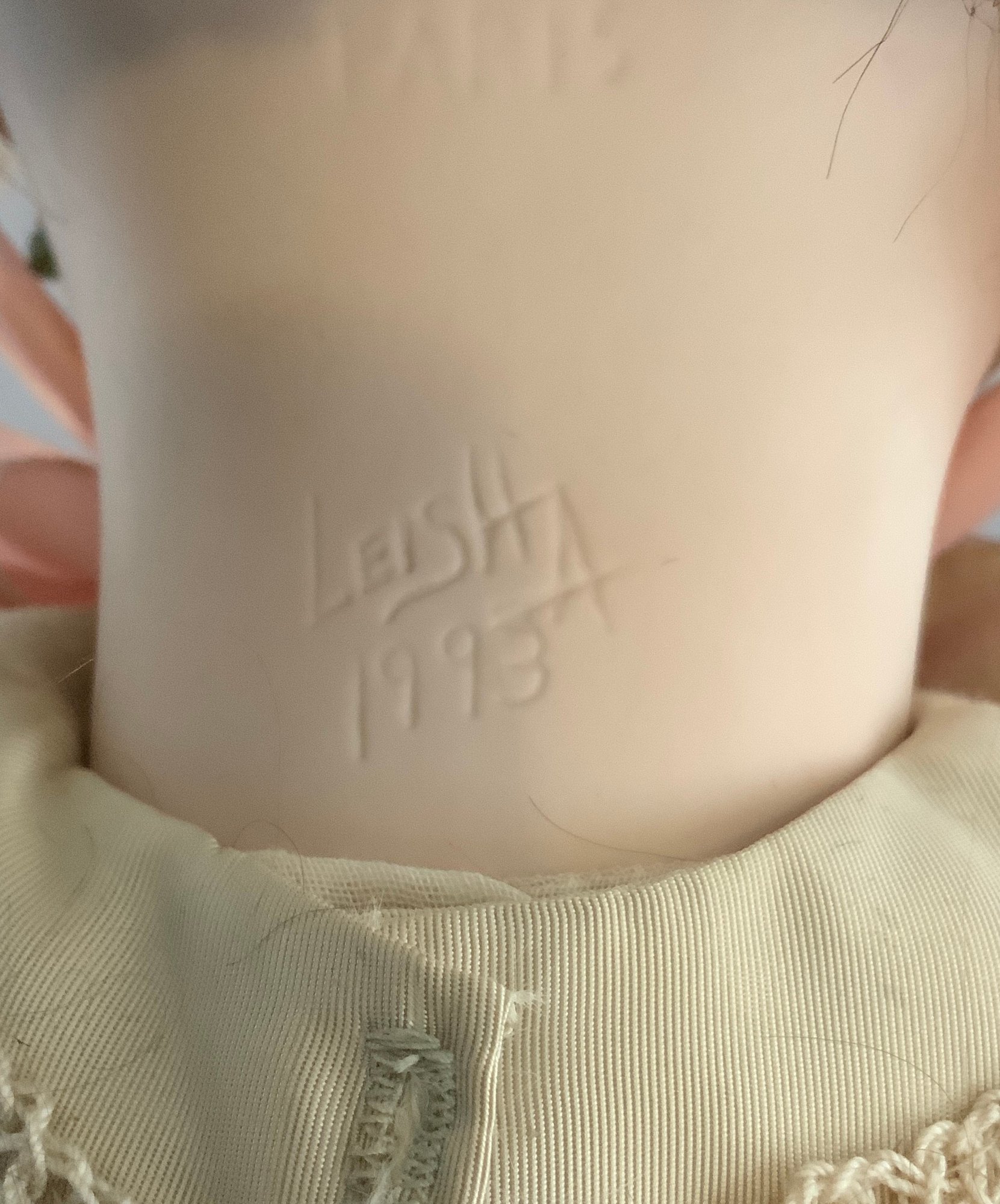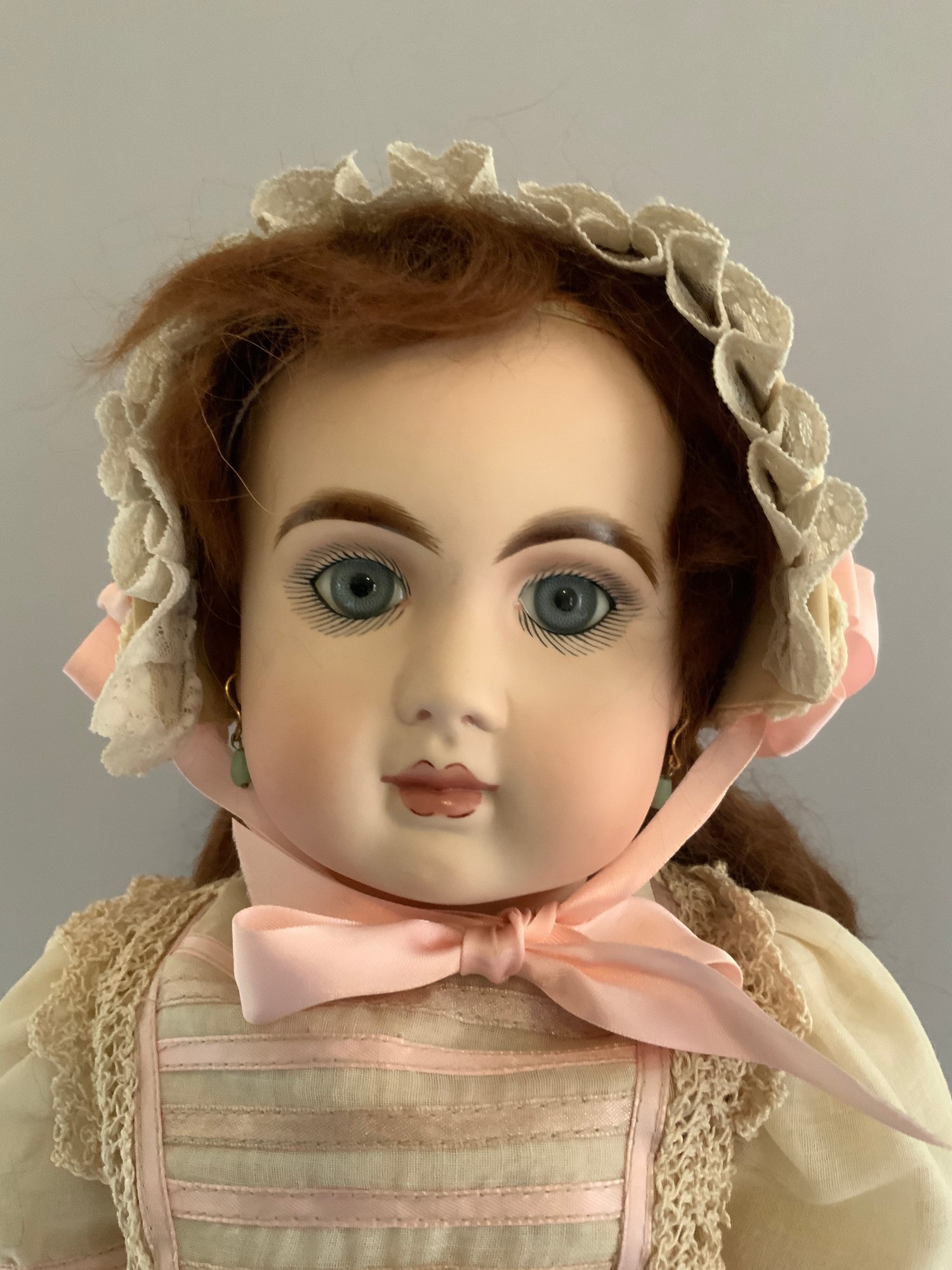 26” Bisque artist doll by Leisha 1993, blue glass eyes, CM, PE, red mohair wig, compo body, tan silk outfit