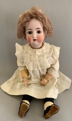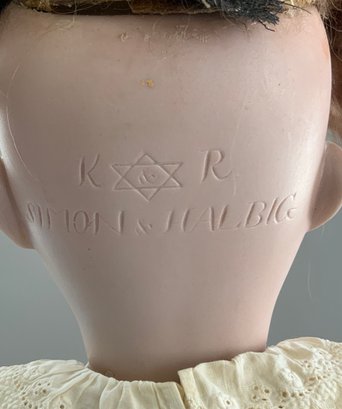 26” Bisque K*R Simon Halbig 0, brown sleep eyes with lashes, OM with teeth, brown mohair wig, BJCB, white dress, black/white boots