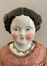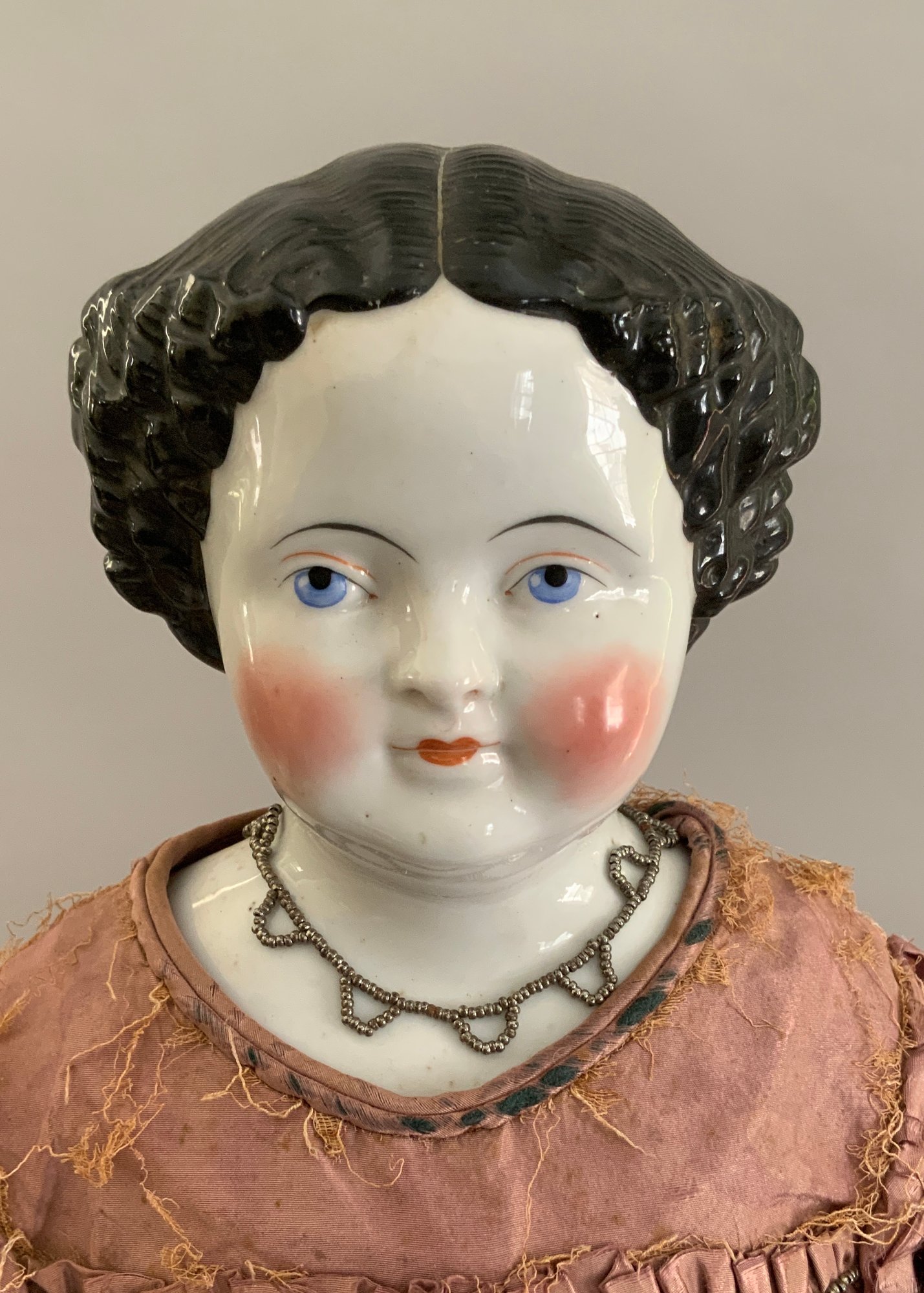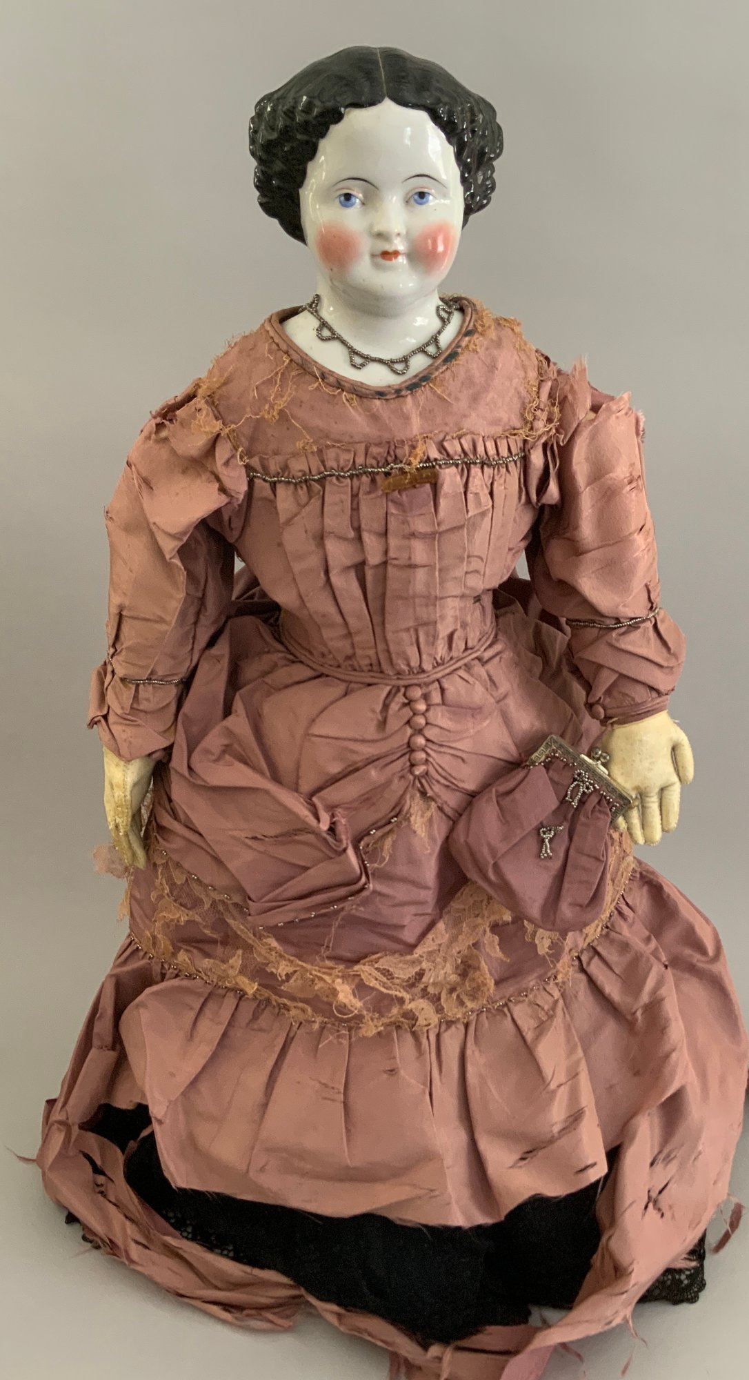 26” Black hair center part china, painted features, cloth body with replaced kid arms, antique silk mauve dress (melting badly), (some facial spots)