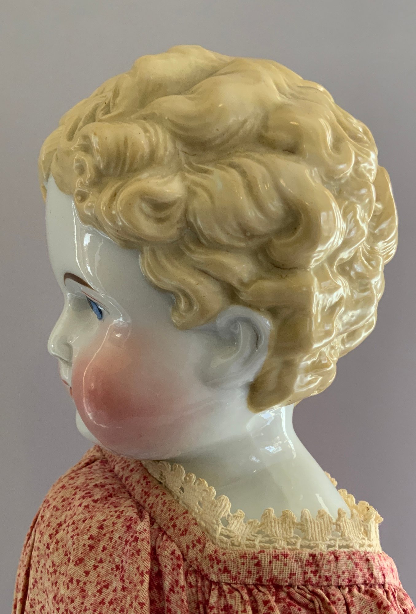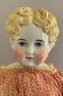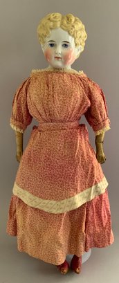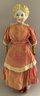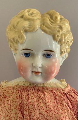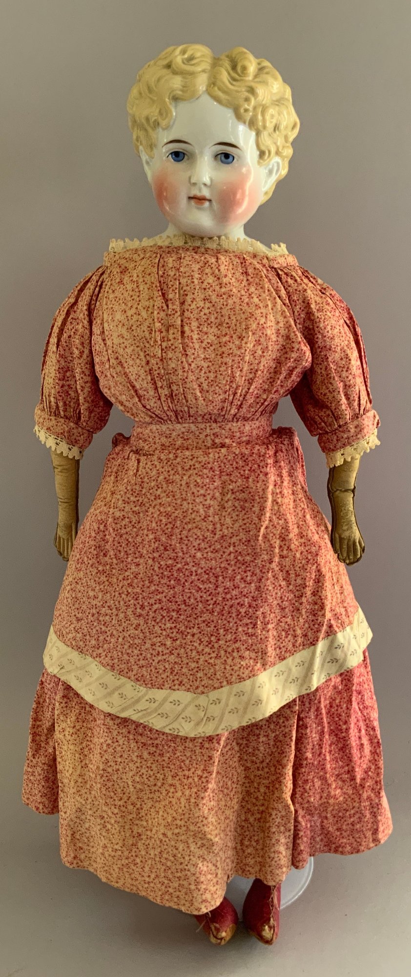 26” Blonde hair china shoulder head, painted features, sculpted hair, cloth body with leather arms, stitched red leather boots, red outfit (fading), in manufacture line back of shoulder plate