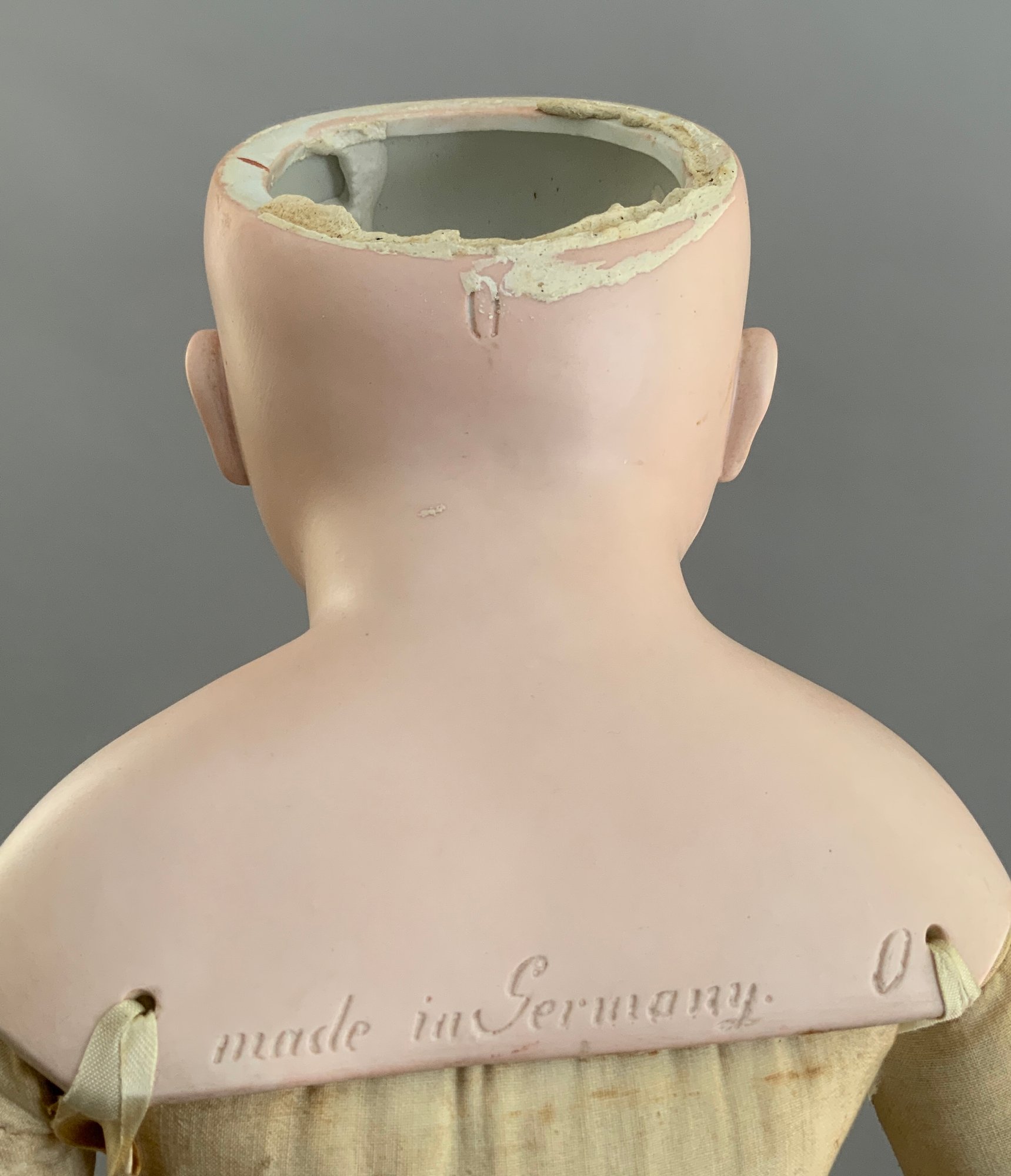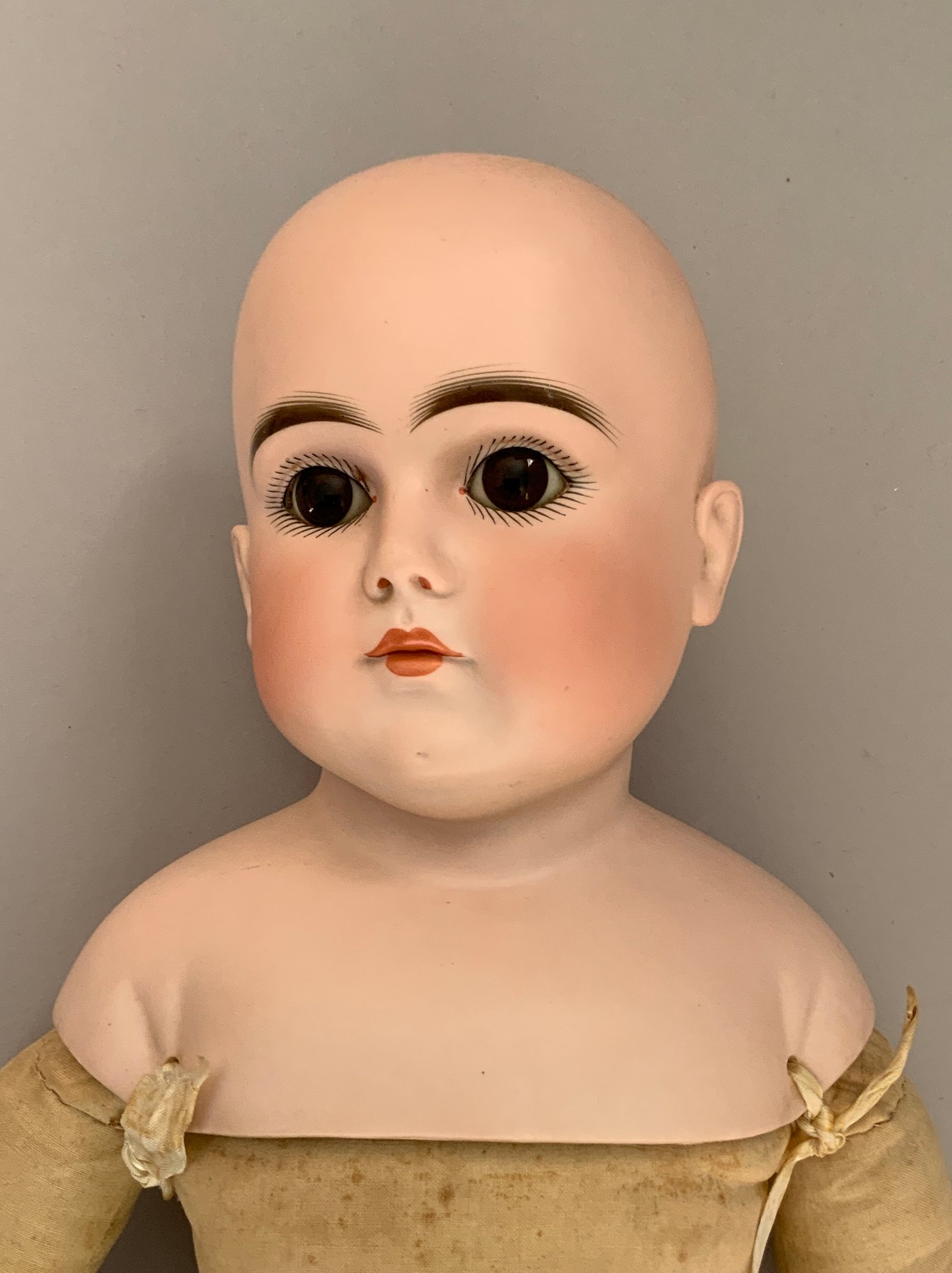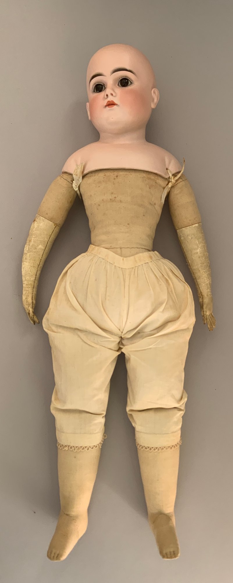 26” Kestner turned shoulder head 0, brown glass eyes, CM, cloth body with leather arms, no wig