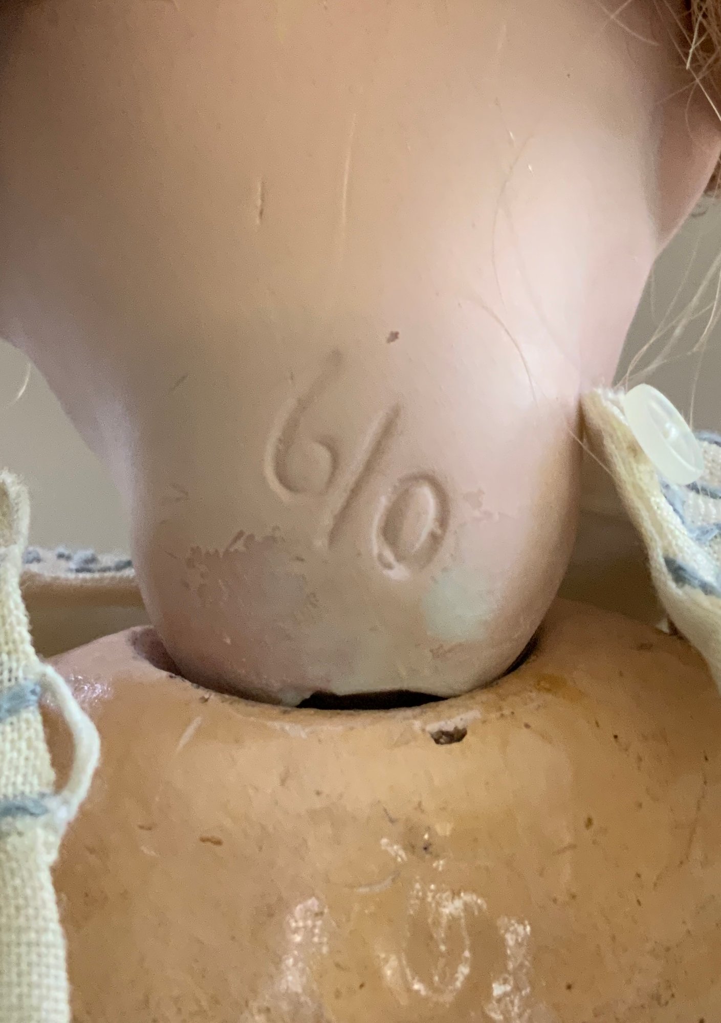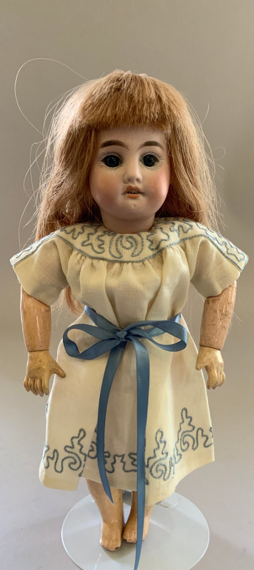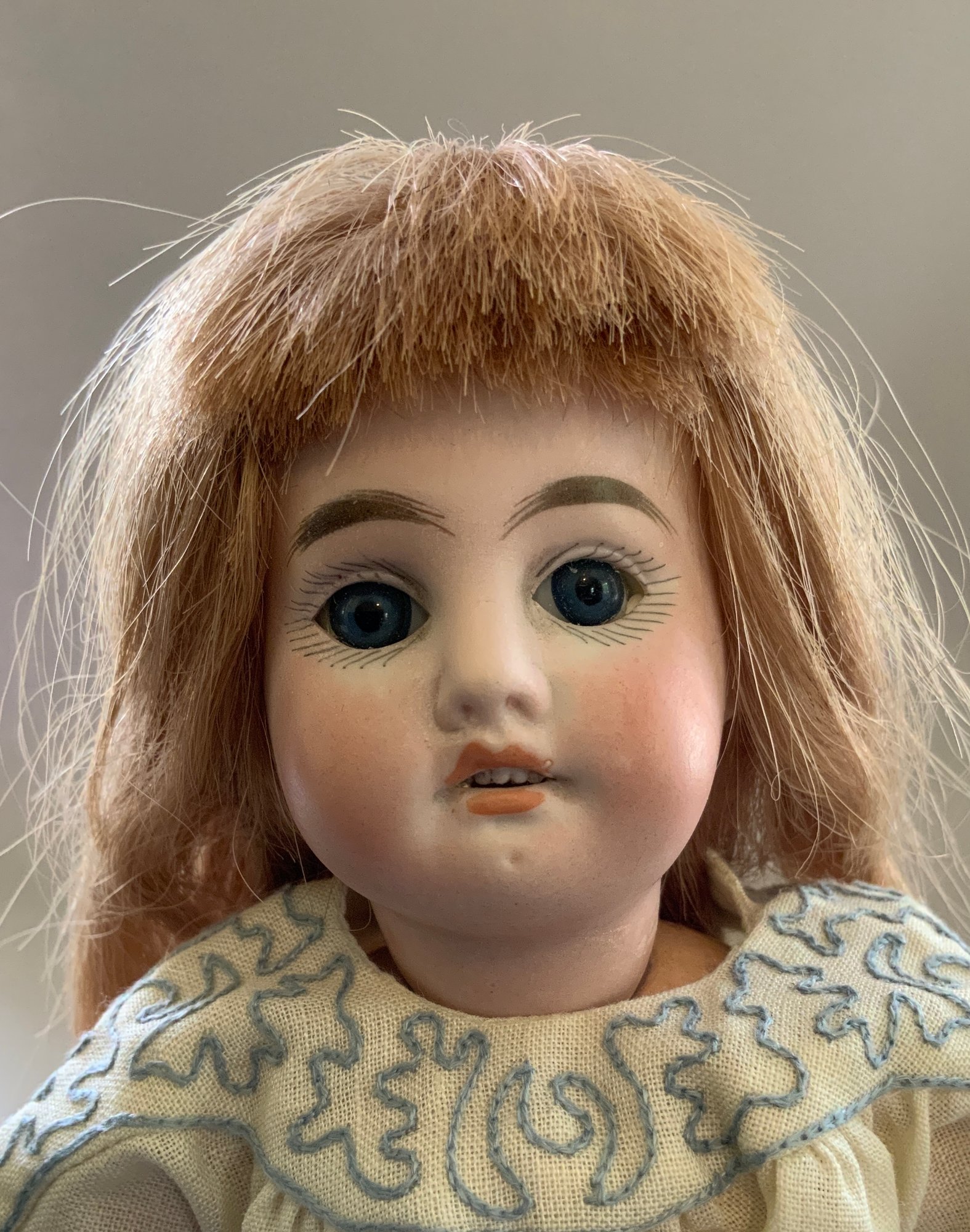 27 CM Bluette 6/0, blue glass eyes, OM with 4 teeth, Strawberry blonde HH wig, compo body (wear) 2 mark shoulder blades
