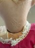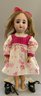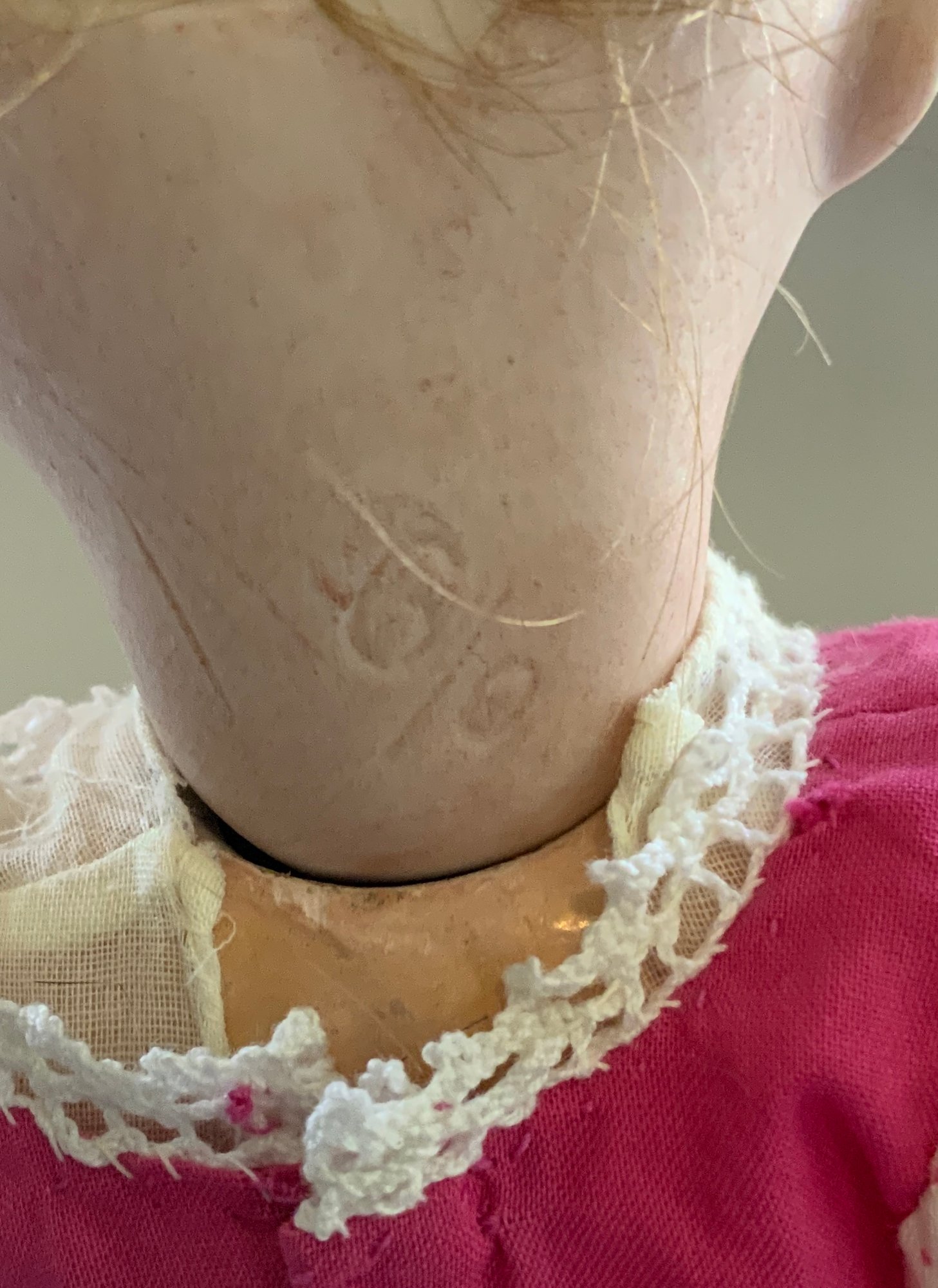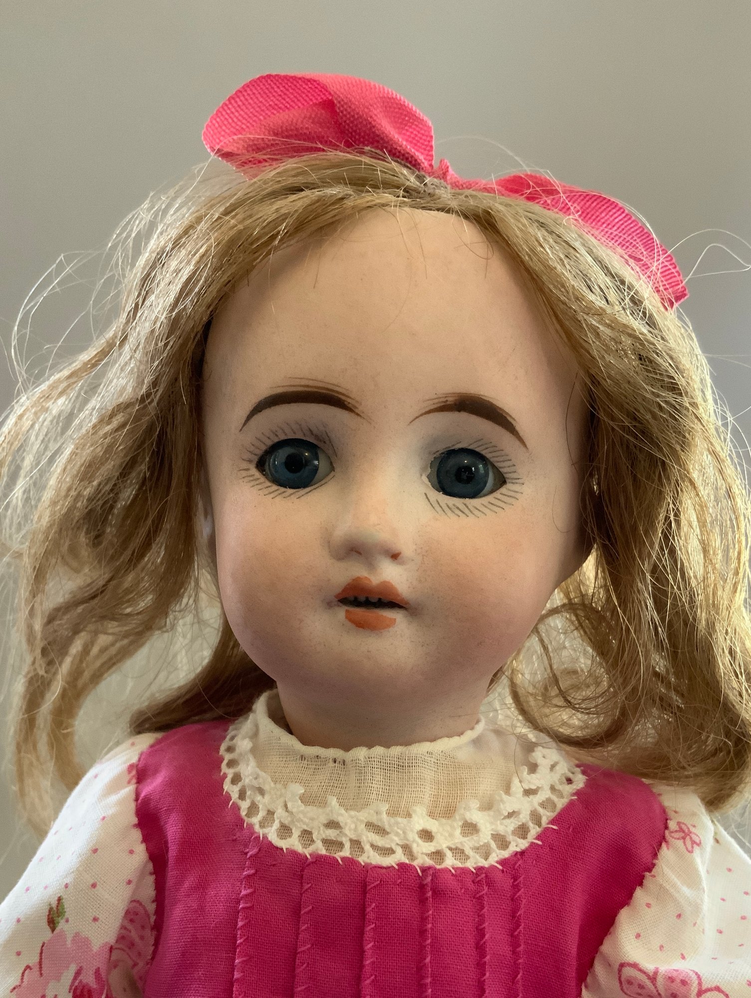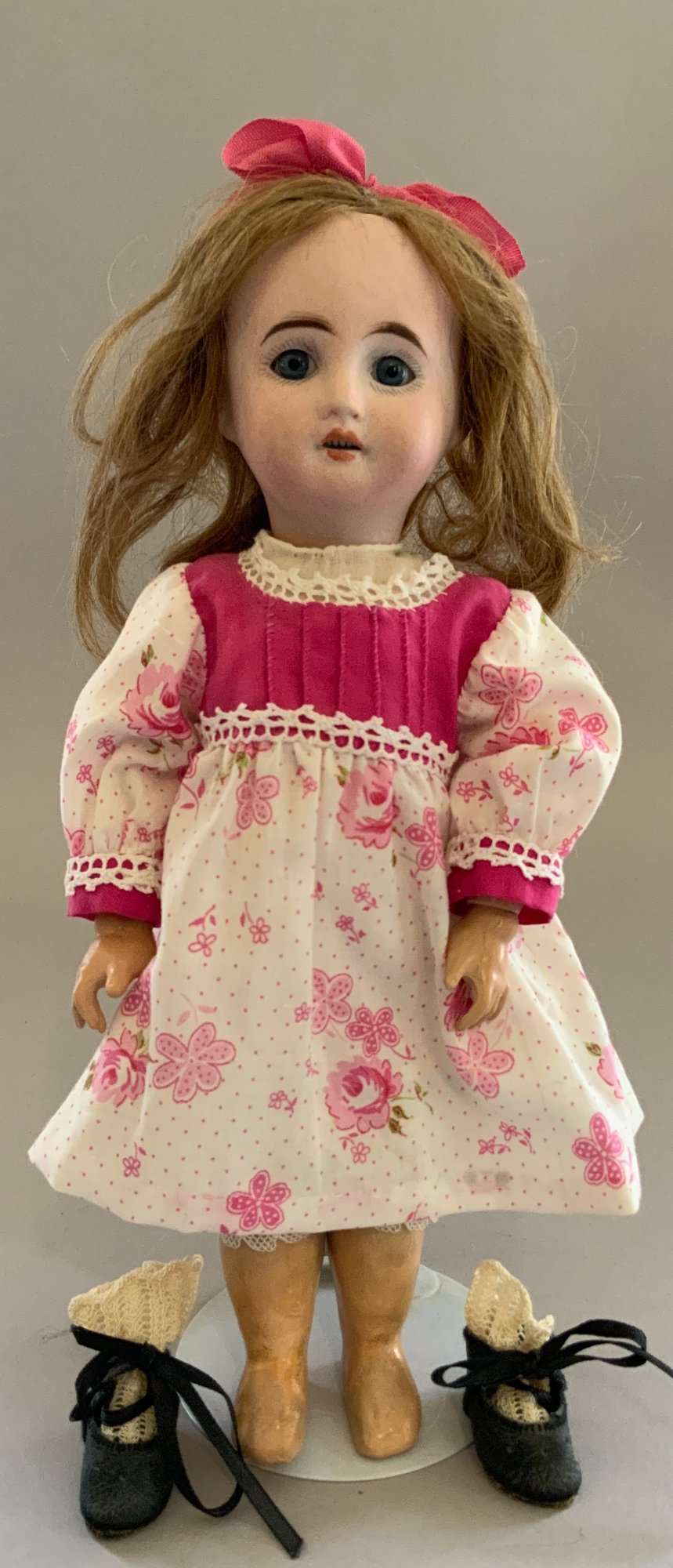 27CM Bluette 6/0, blue glass eyes, OM with 5 teeth, blonde HH wig, compo body 2 mark shoulder blades 1 mark foot bottom 2 circles other foot bottom, red/white floral dress