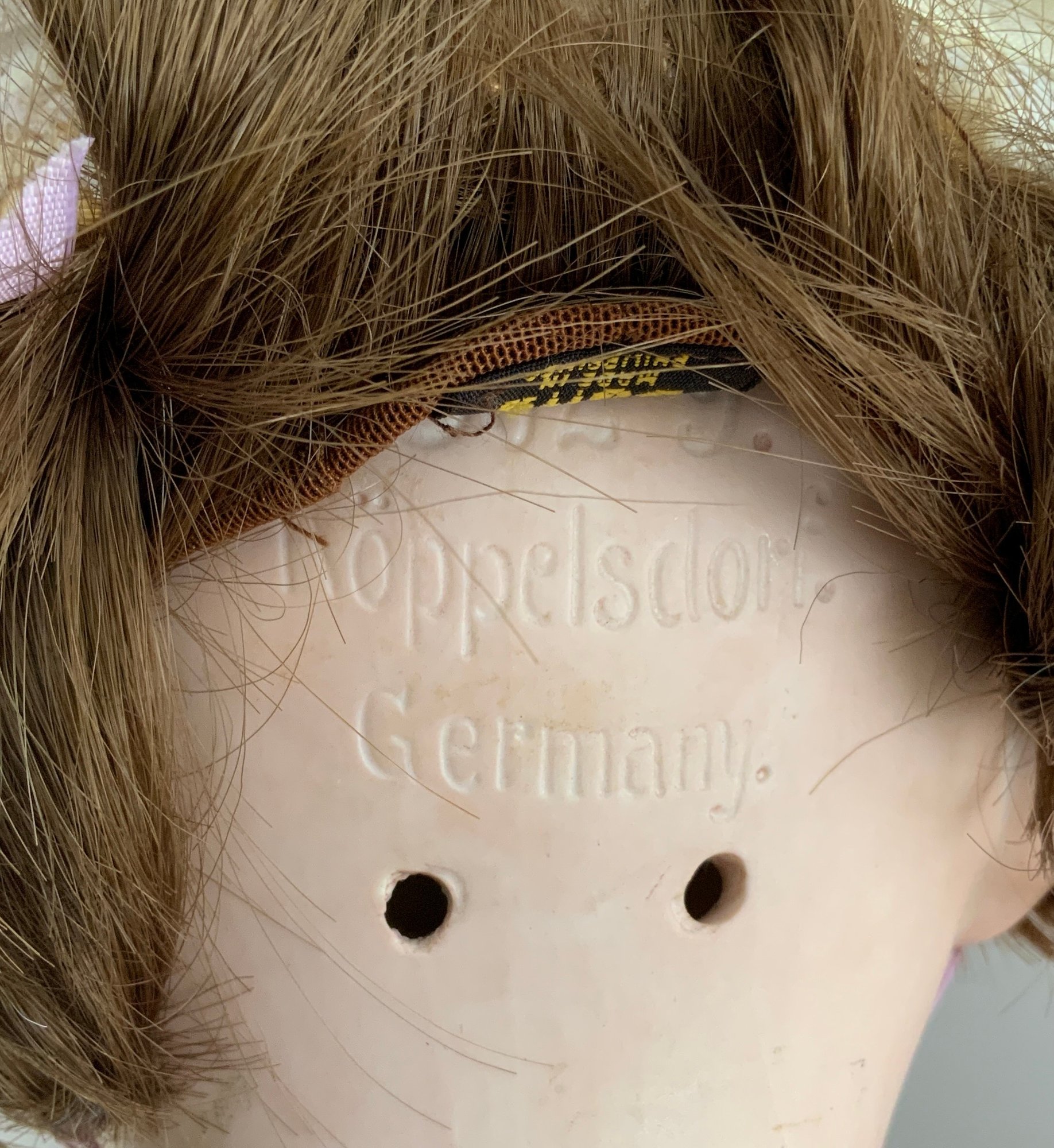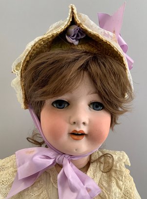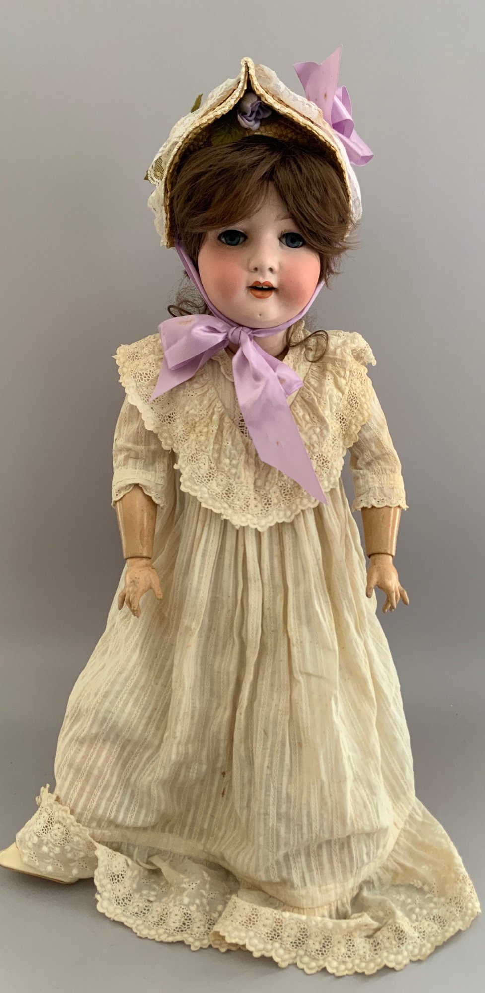 28” Bisque 302.9 Heubach Koppelsdorf, blue glass sleep eyes, OM with teeth, brown mohair wig, BJCB, white dress (stains, eyes cracked in head)