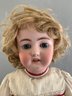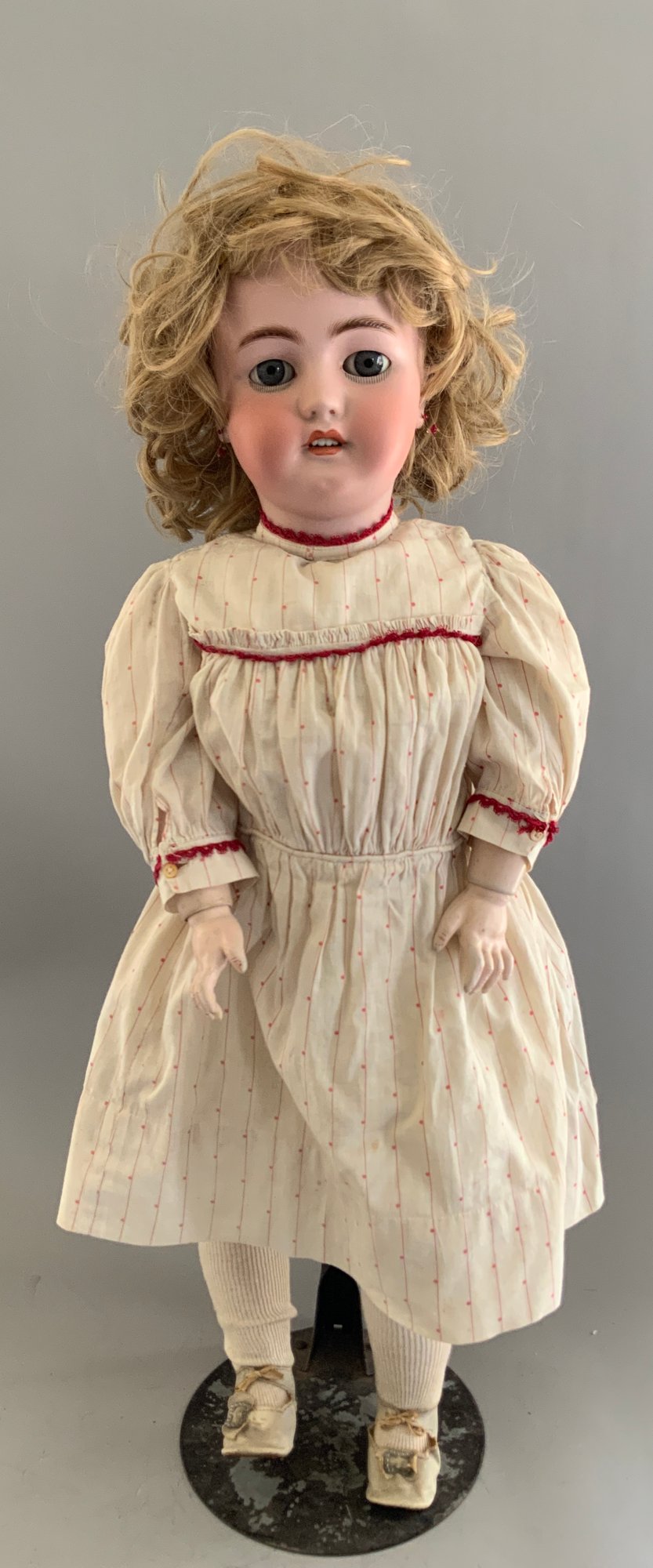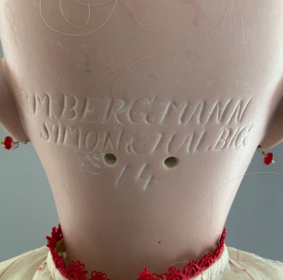 28” Bisque CM Bergman S&H 14, blue glass sleep eyes, PE, OM with teeth, blonde mohair wig, BJCB, white/red dress,