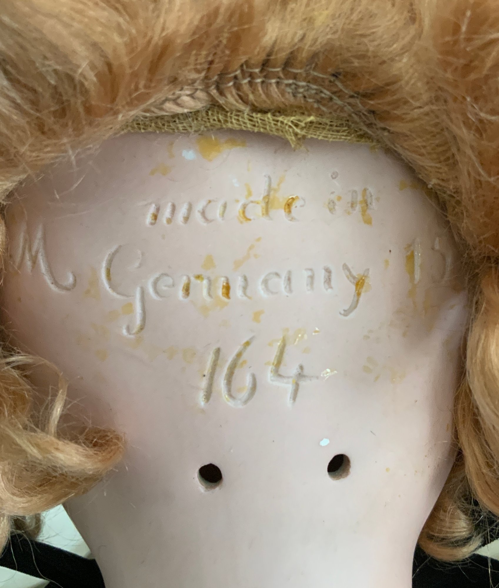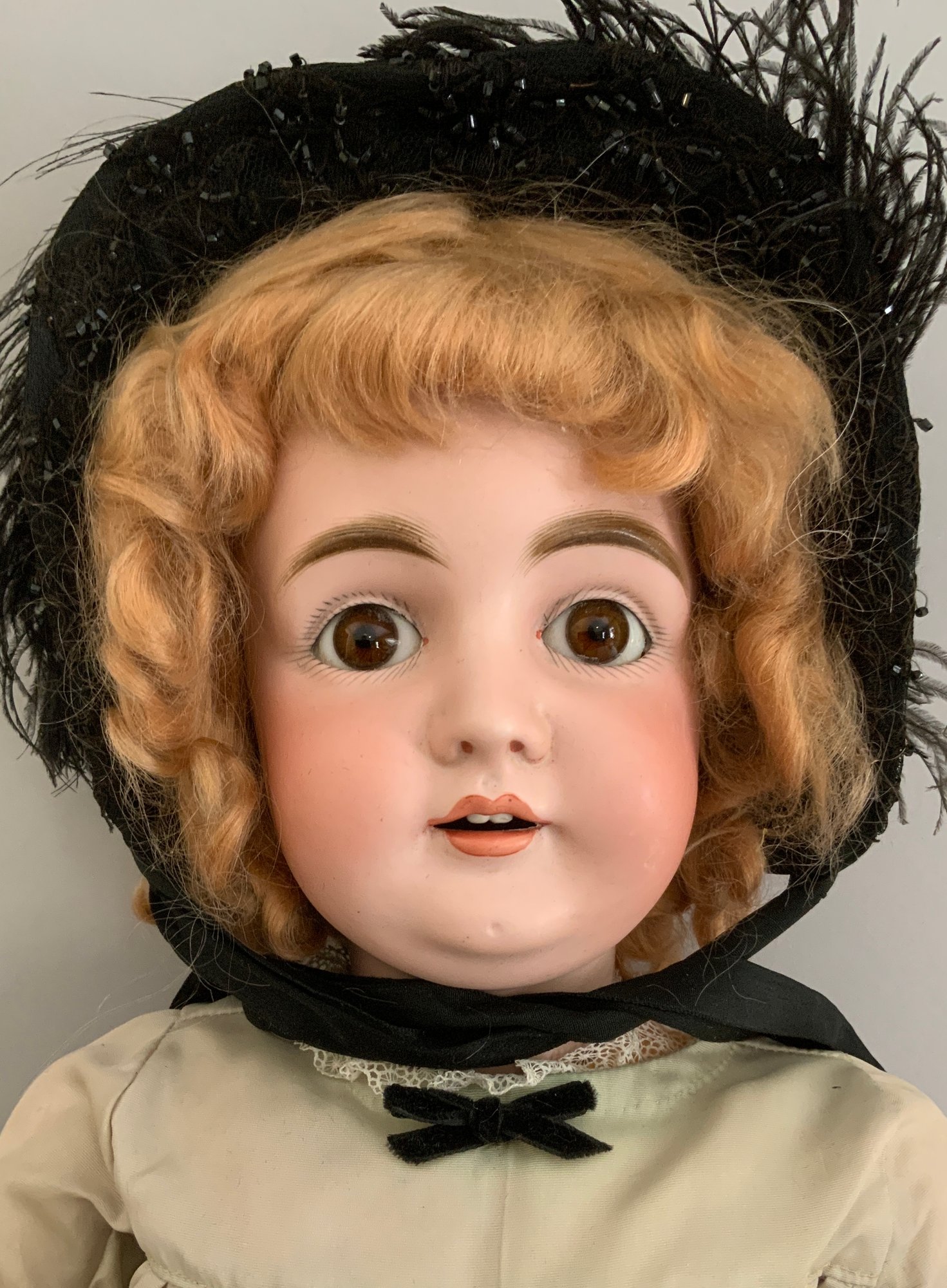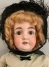 28 ½” Kestner M Germany 15 ¾ 164, brown glass eyes (replaced), OM with teeth, blonde mohair wig, BJCB, green silk dress
