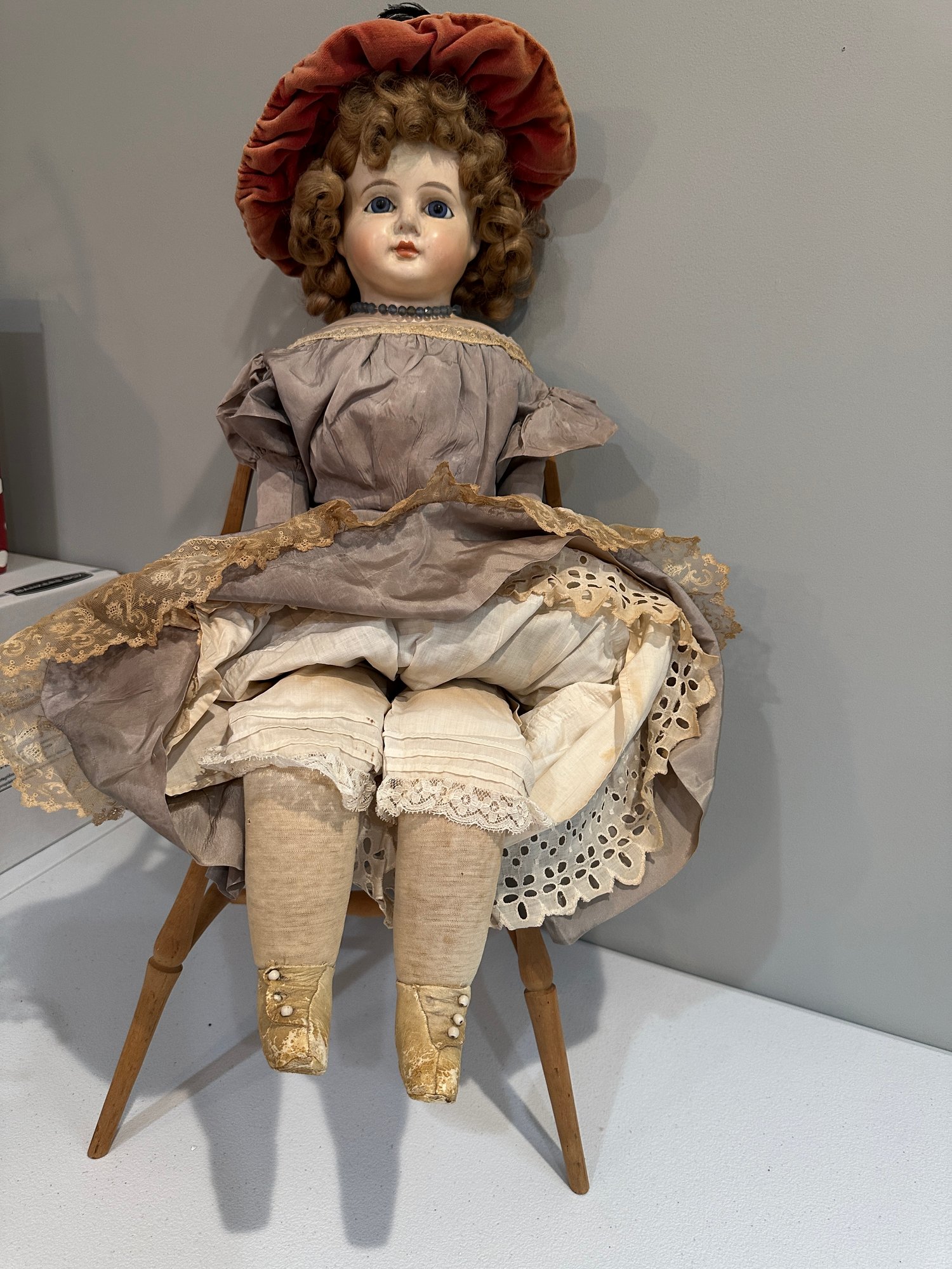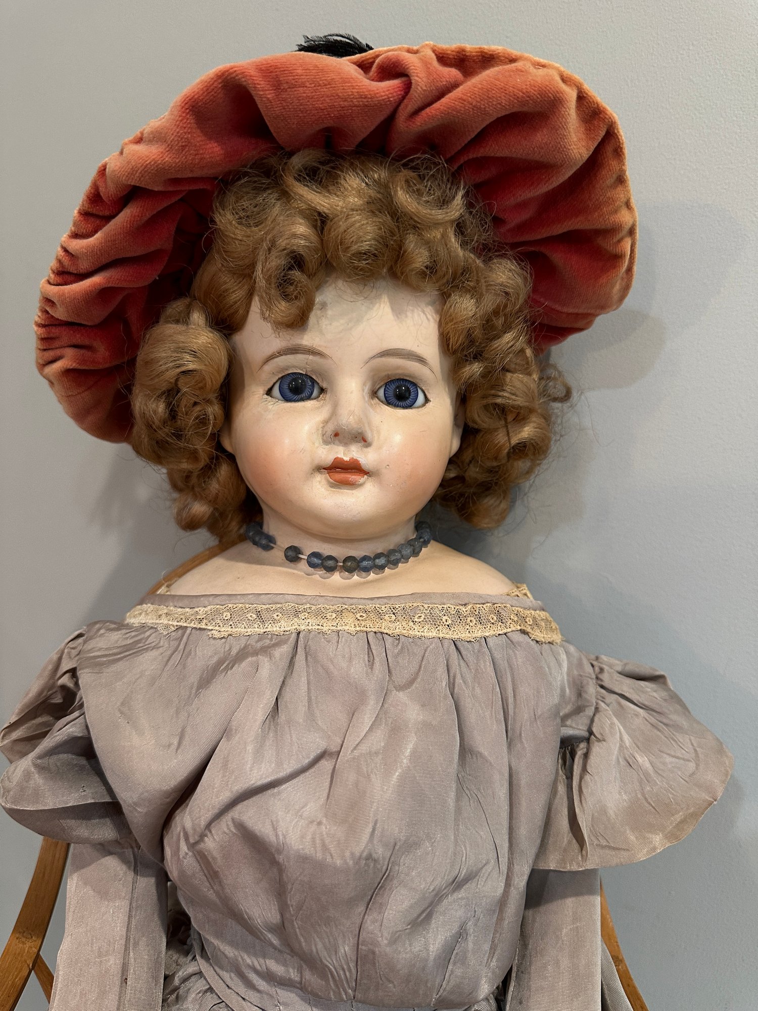28” Paper mache, cloth body, compo hands, vintage wig and clothes, lovely painting, blue set eyes.