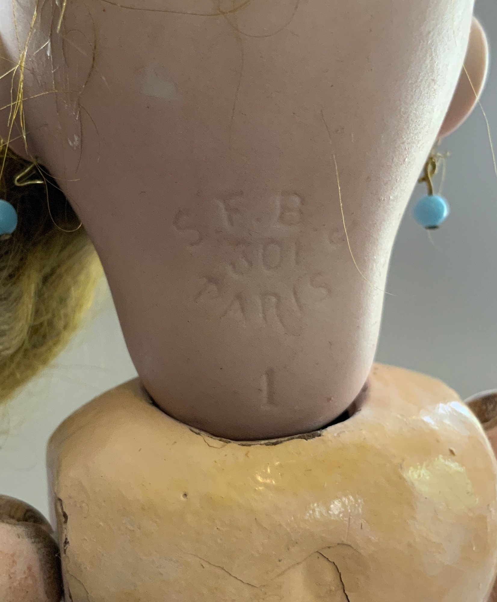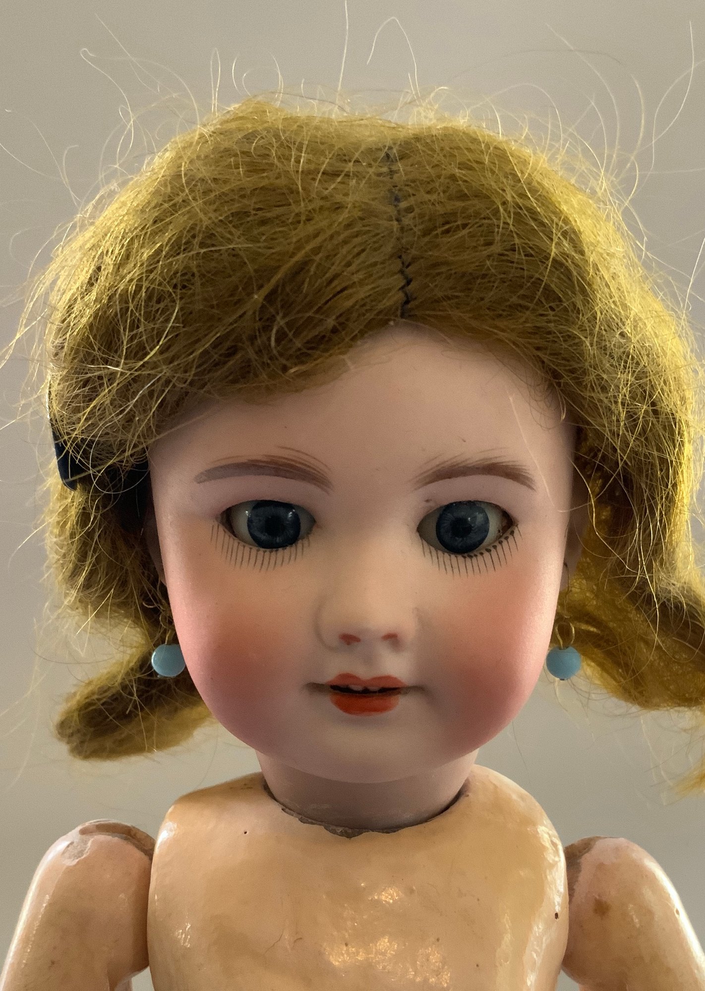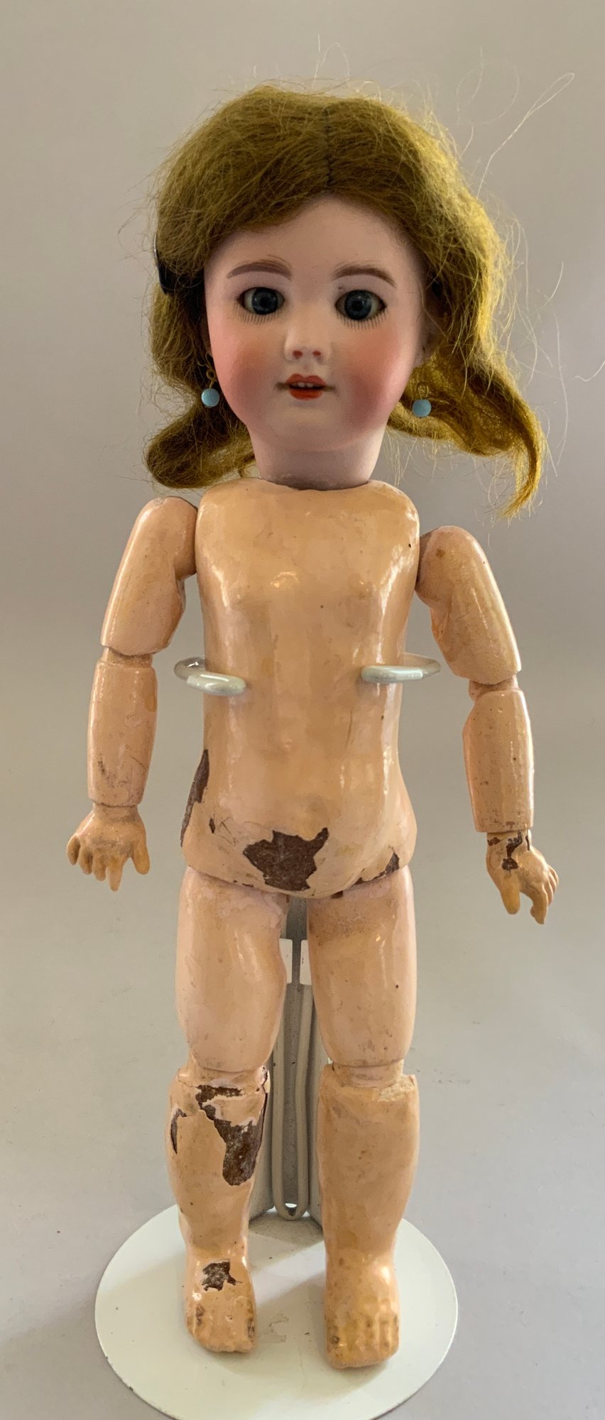 28CM Bluette SFBJ 60 Paris 1, blue glass sleep eyes, OM with 4 teeth, PE, brown mohair wig, compo body 2 shoulder blades 2 on feet (rough body), no clothes