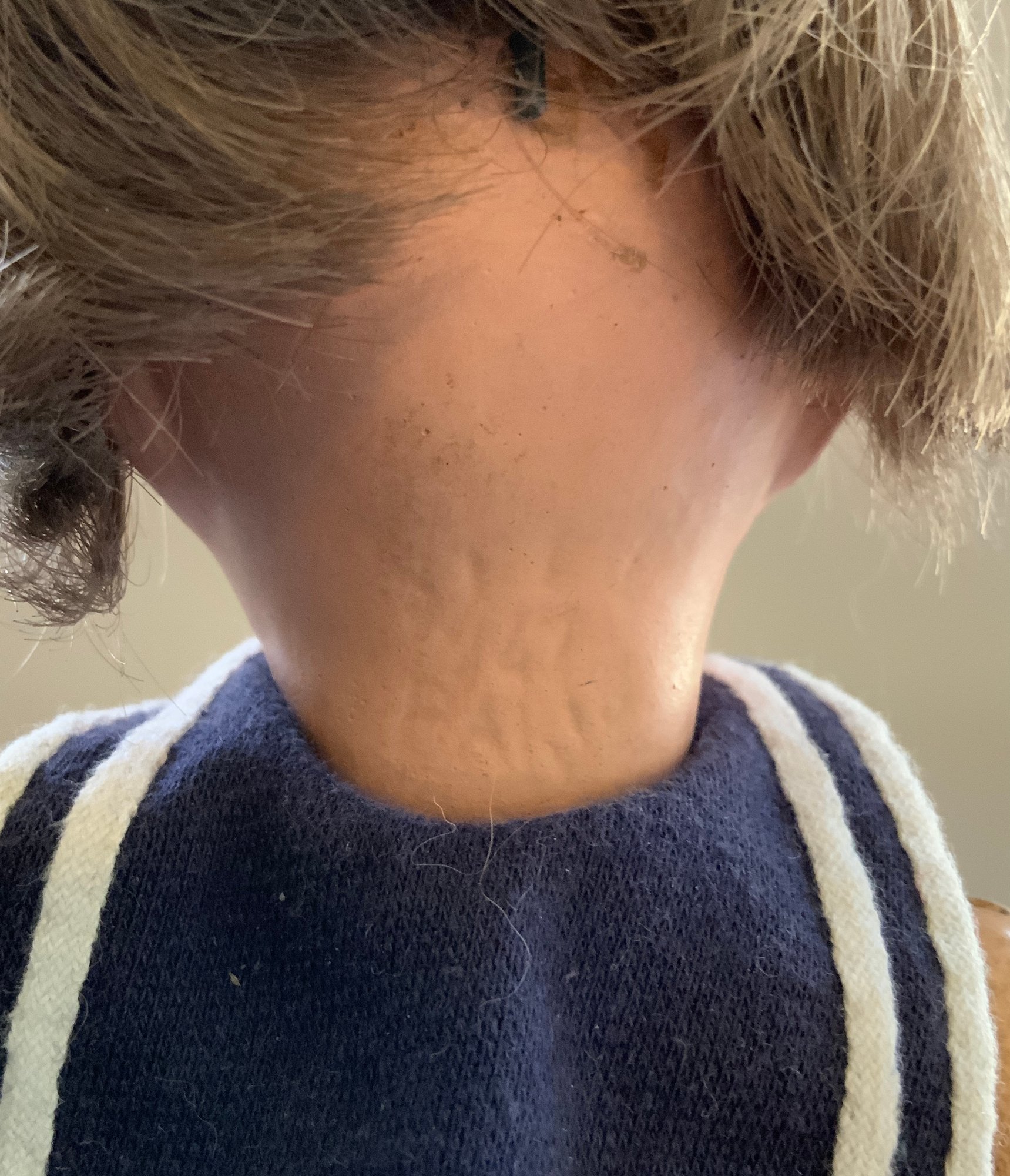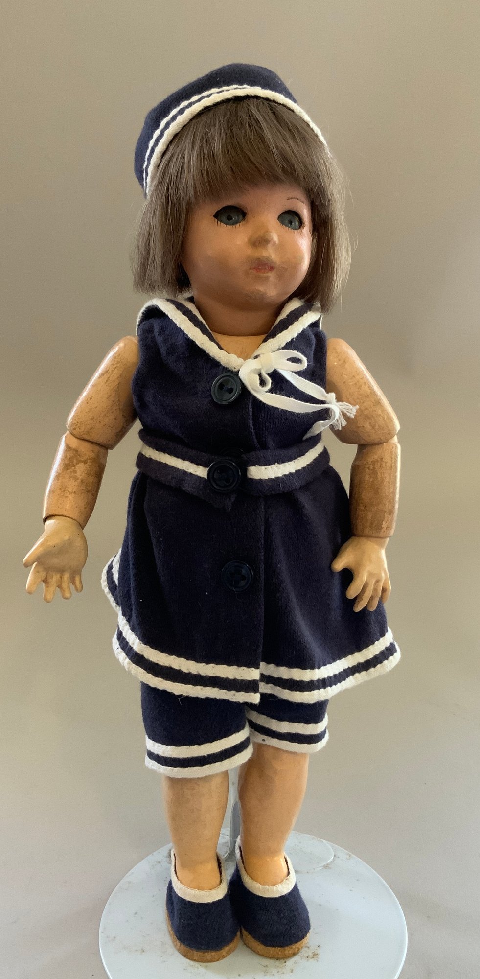29CM 11 3/8” Bluette SFBJ 47 Paris, compo head, blue glass sleep eyes, CM, brown HH wig, compo marked 2 between shoulders (rough), feet marked 889M, blue swimming suit
