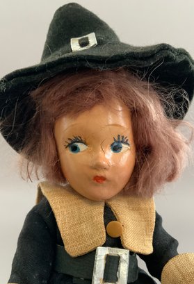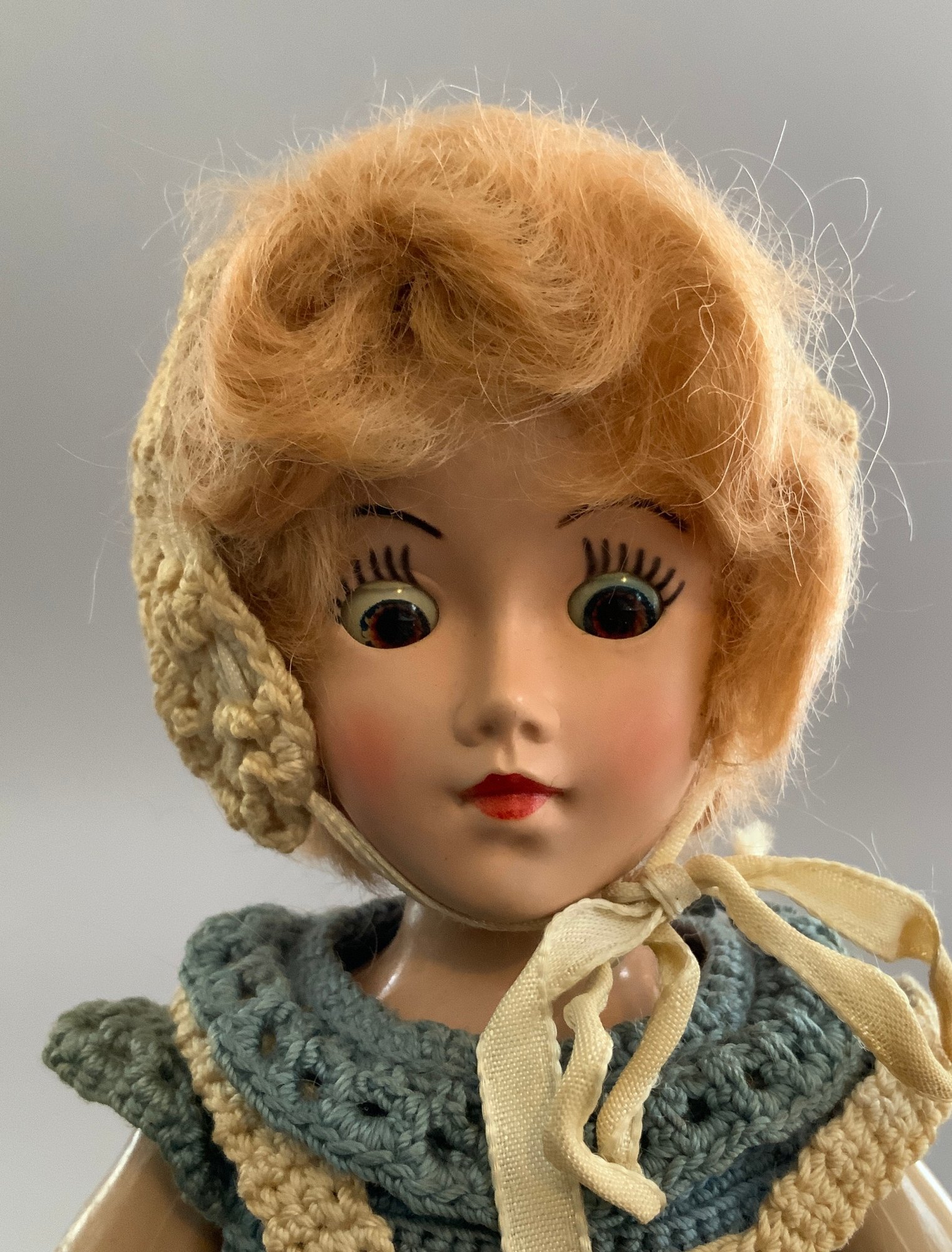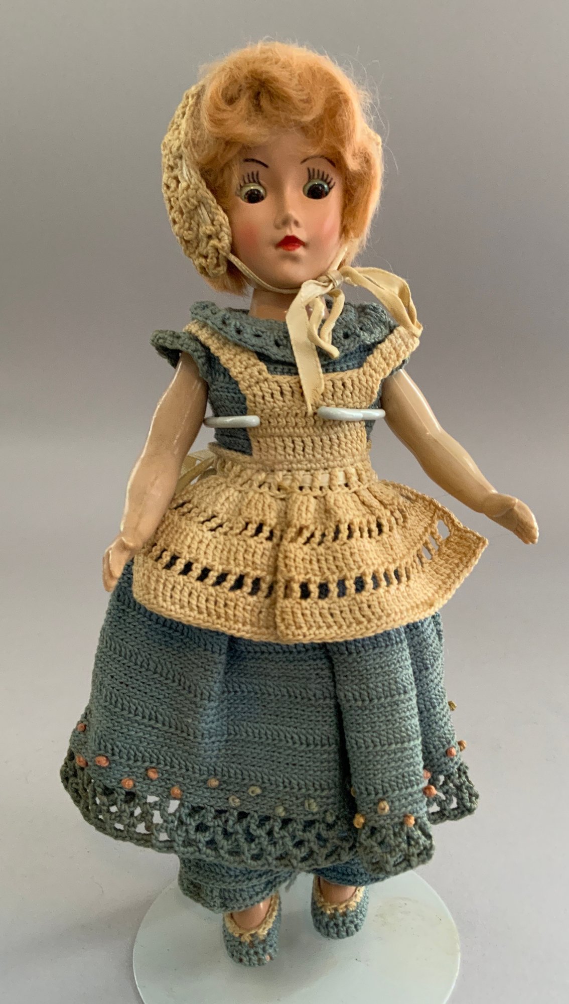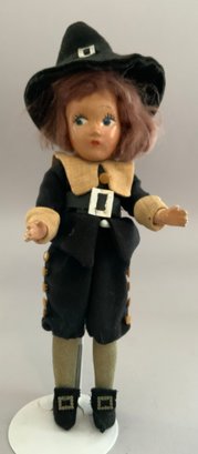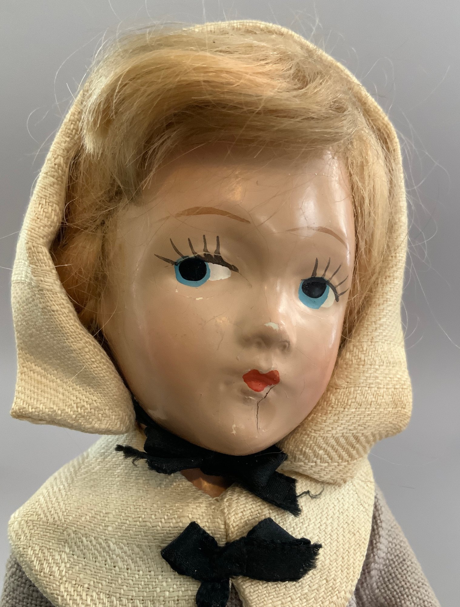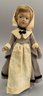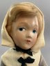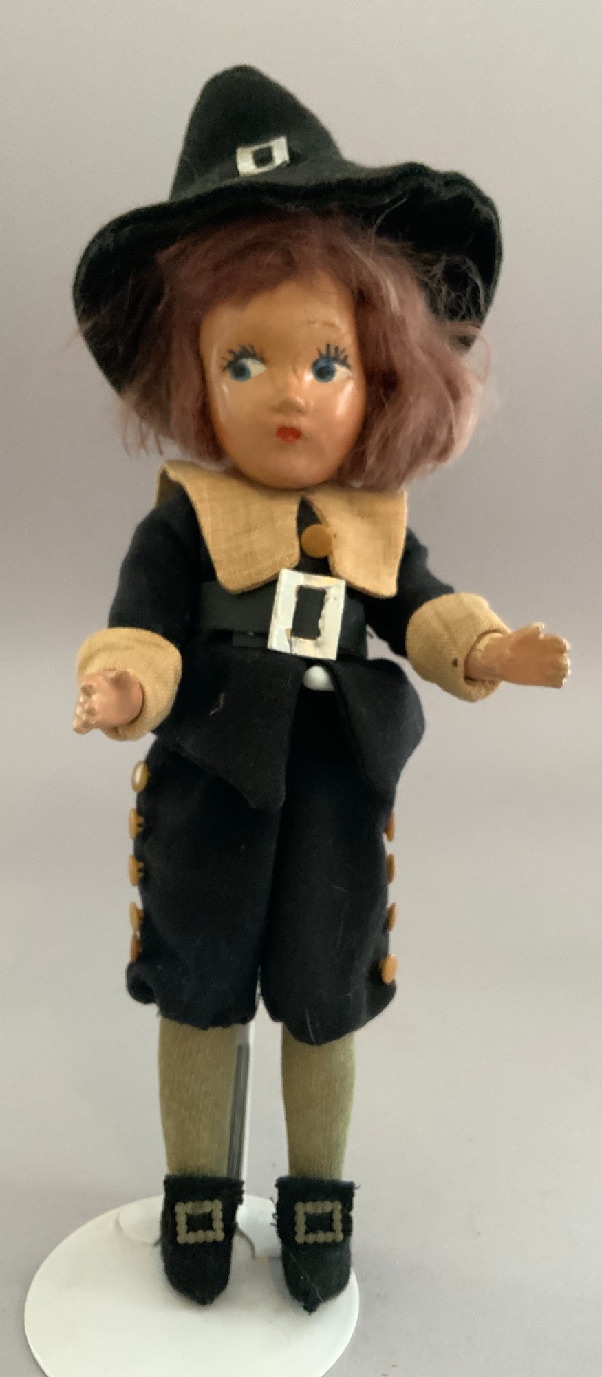 3 – 10 ½” Composition dolls, 1 – brown glass eyes, blonde mohair wig, blue knit outfit, 2 – girl & boy dressed as Pilgrims, painted features (boy has crack back of head base)