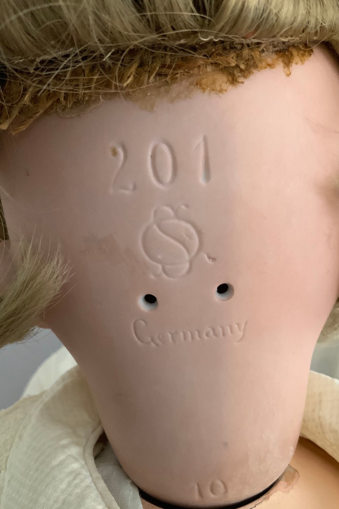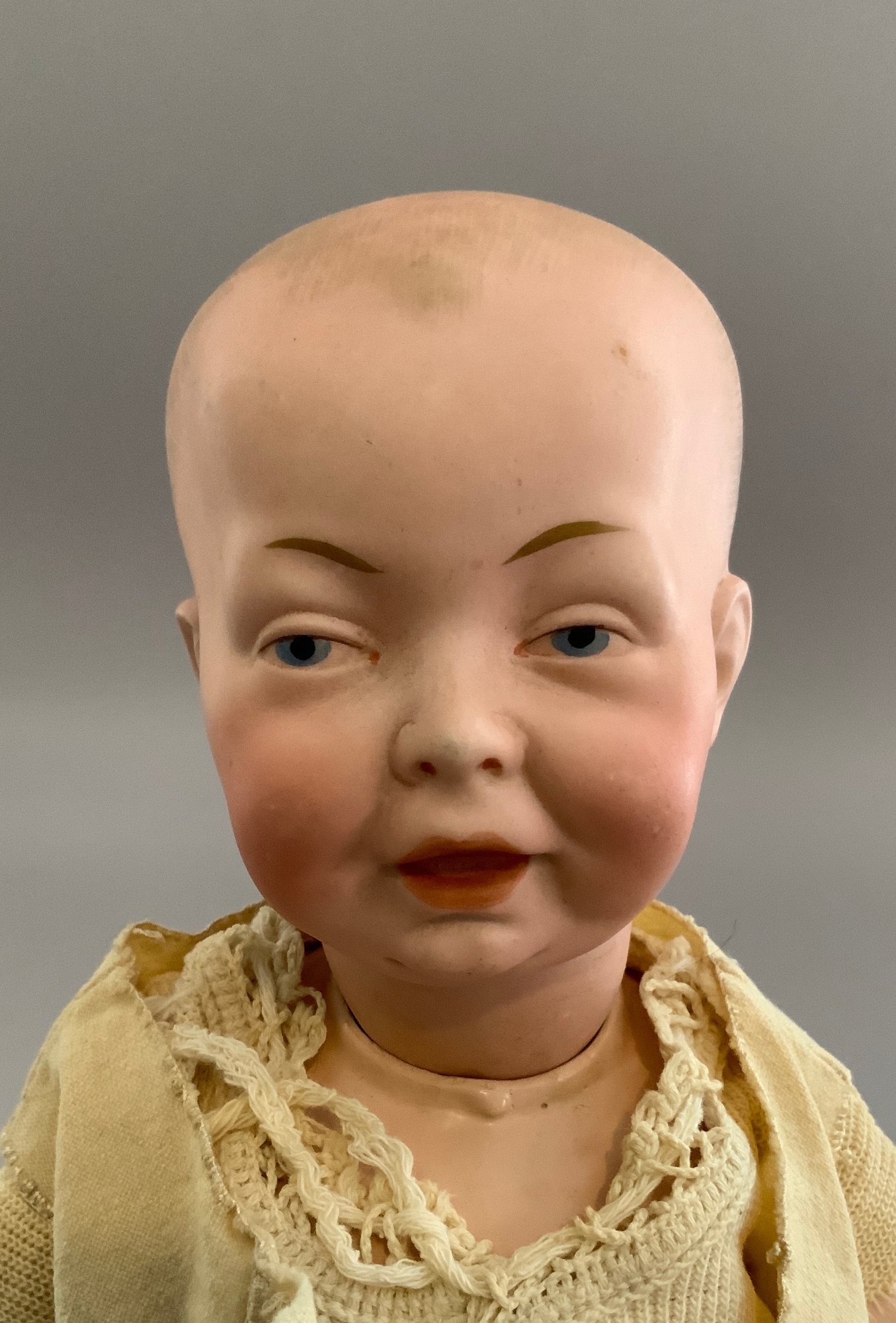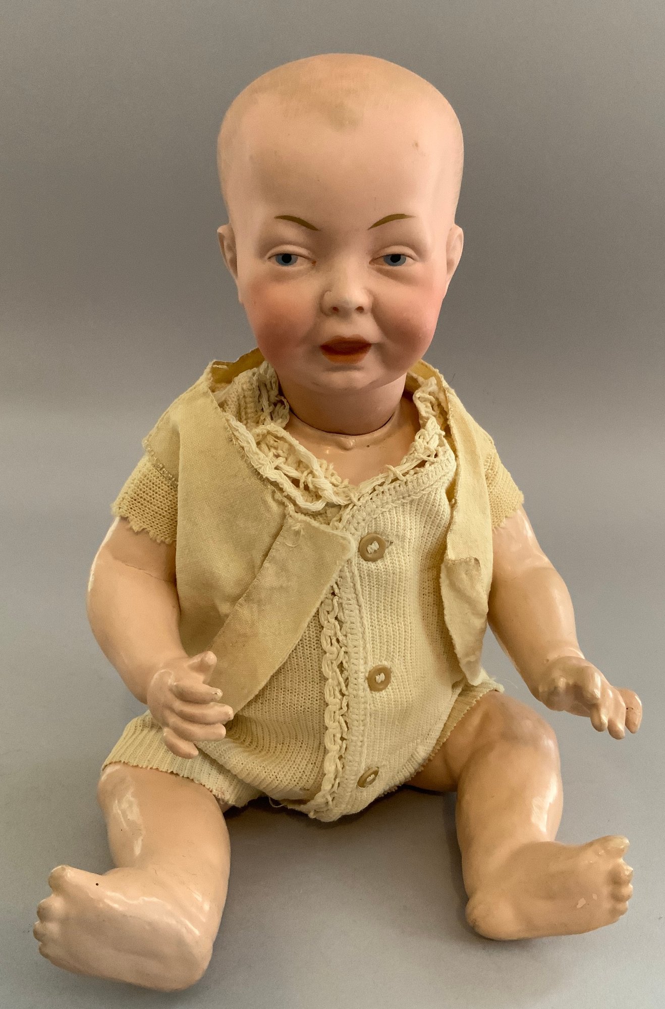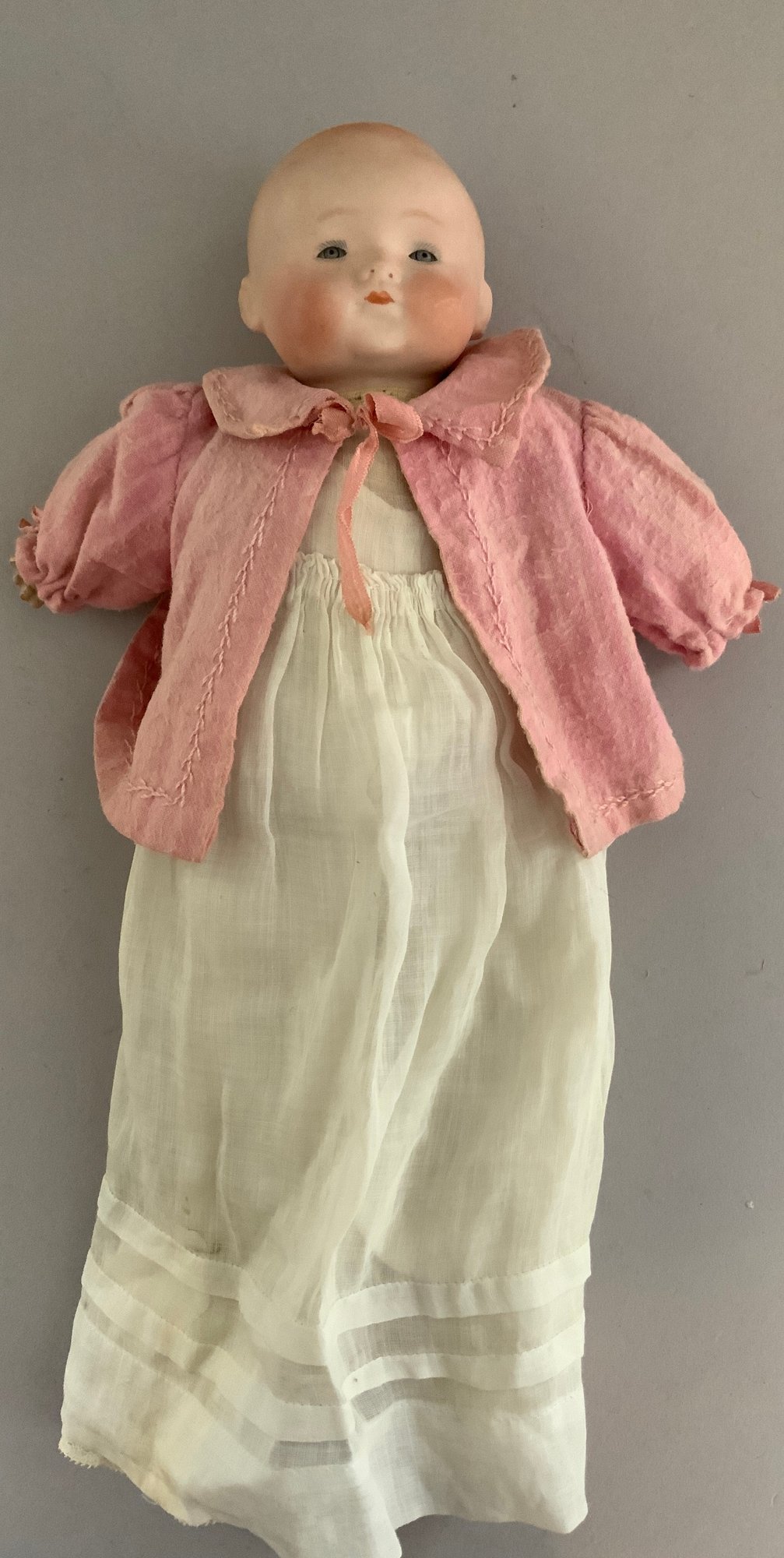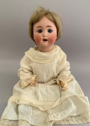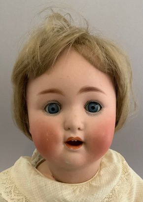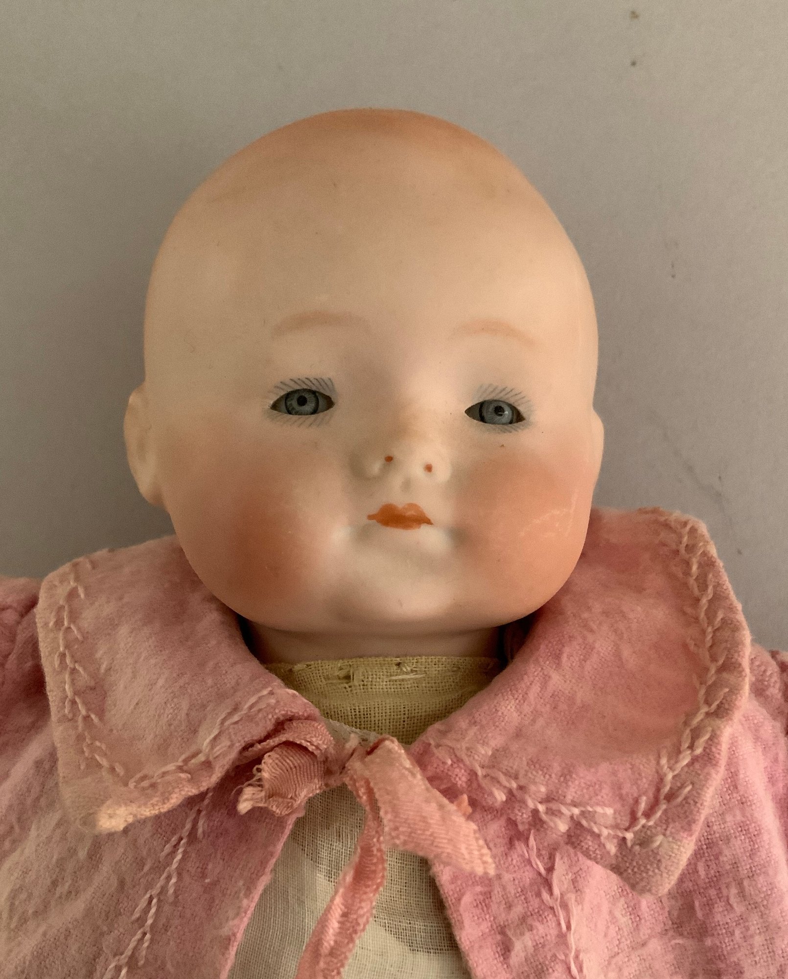 3 – Baby/toddler dolls, 1- 12” AM “Baby Phyllis”, blue glass eyes, cloth body, white dress, 1- 14” Kammer & Reinhardt toddler, painted features, compo body, & 1 – AM 971 toddler, blue glass sleep eyes, OM with teeth, blonde mohair wig, compo body white dress (facial rubs)