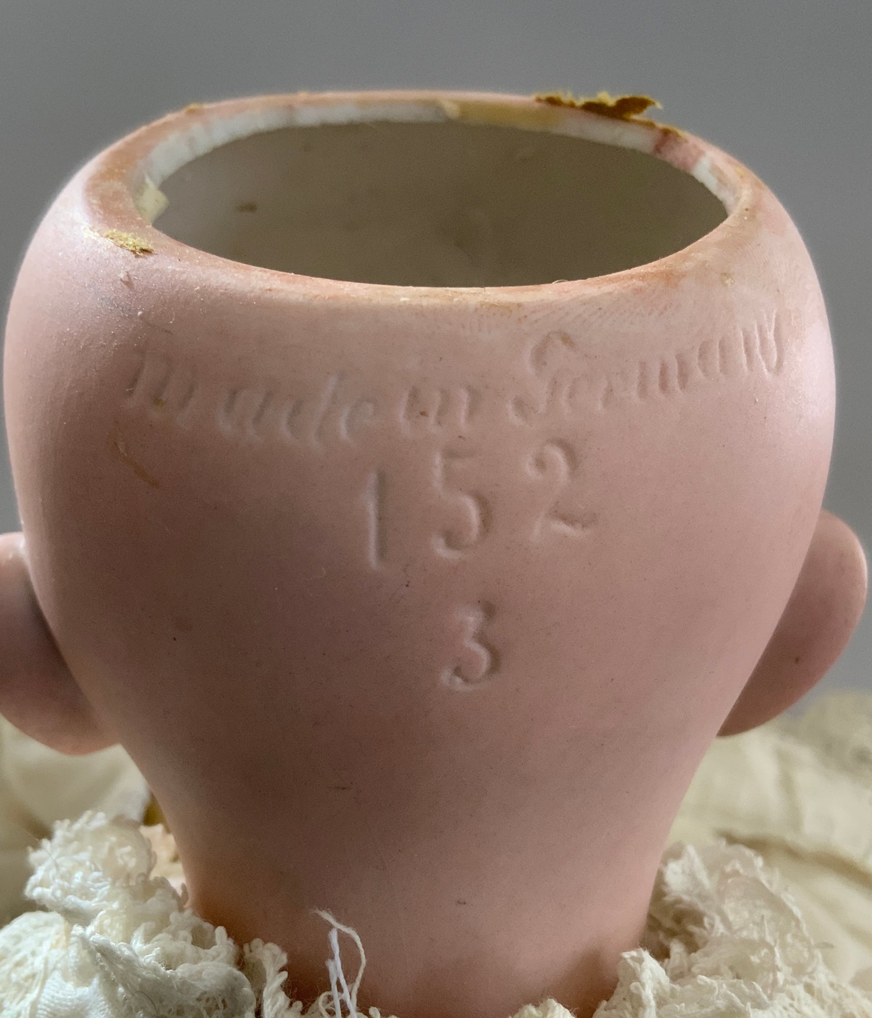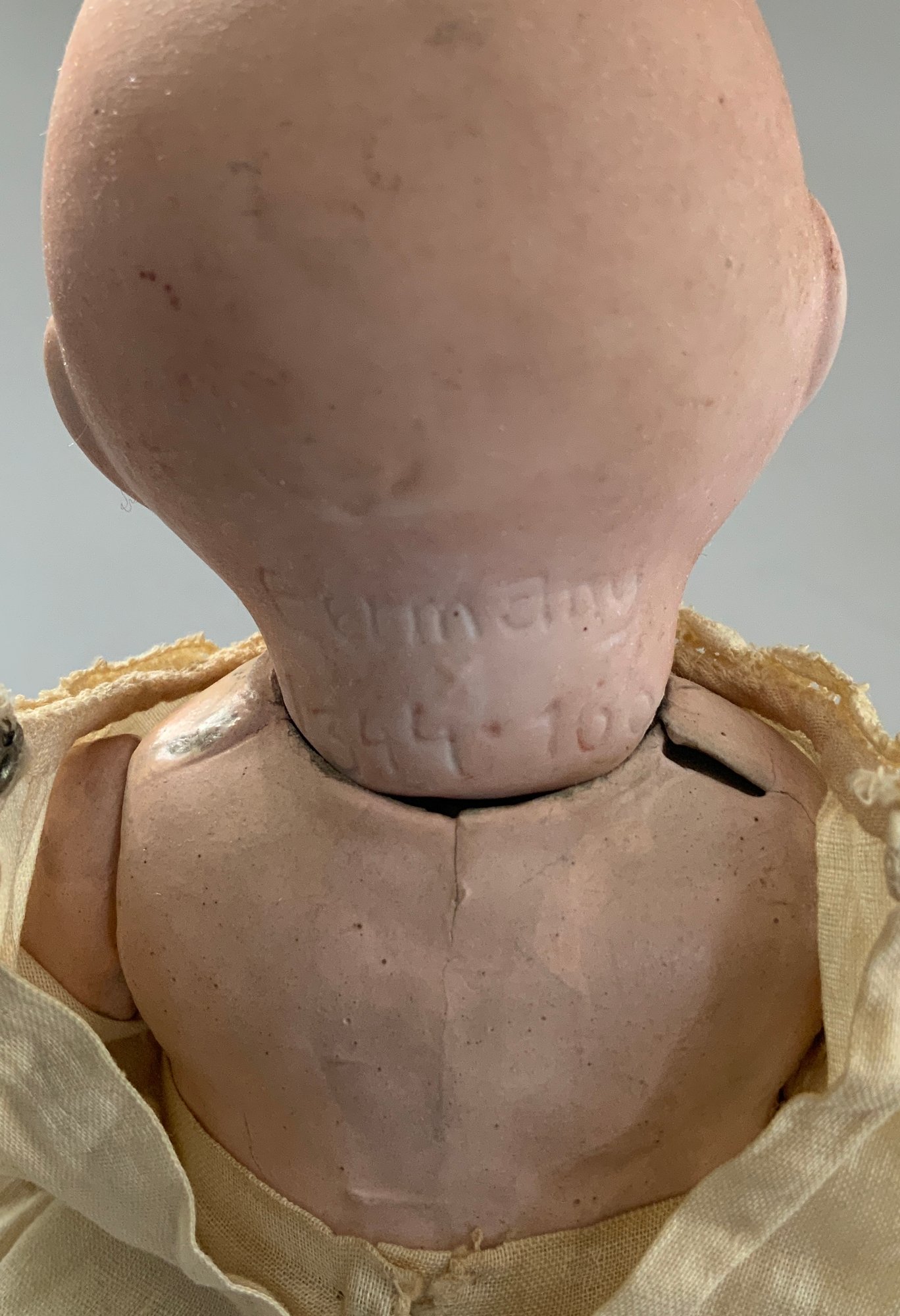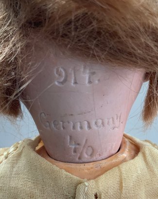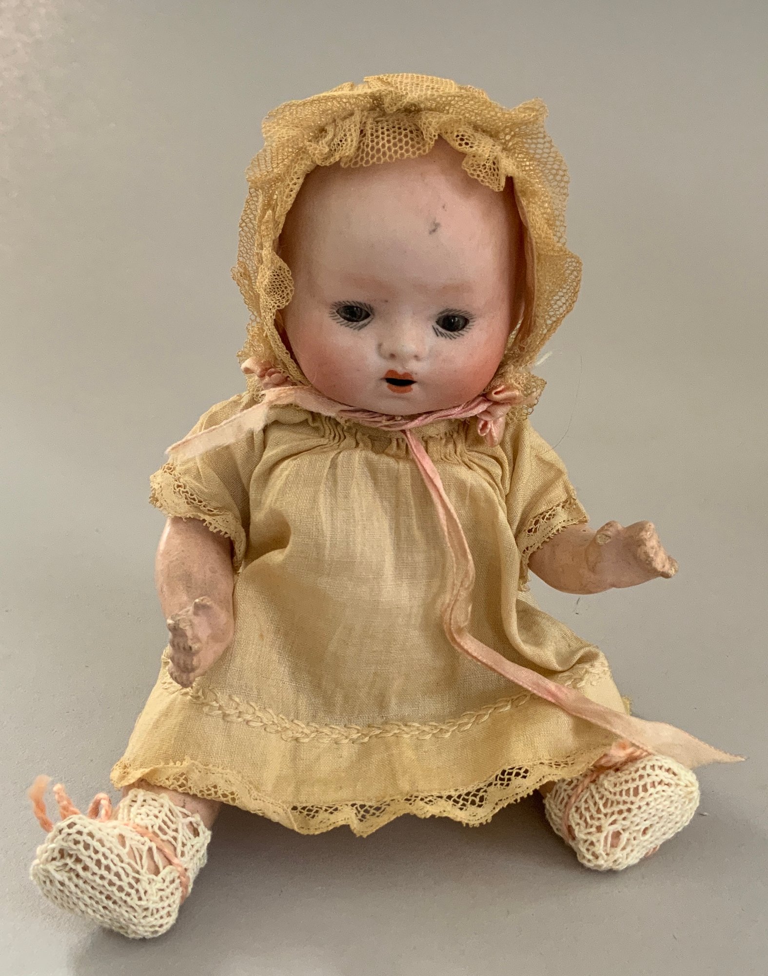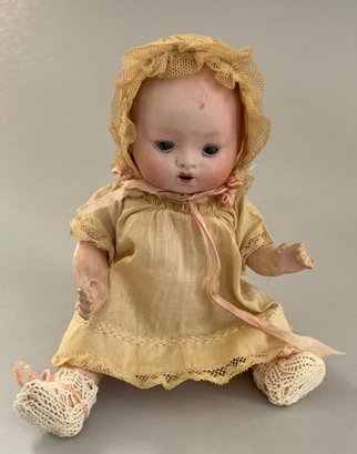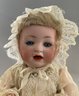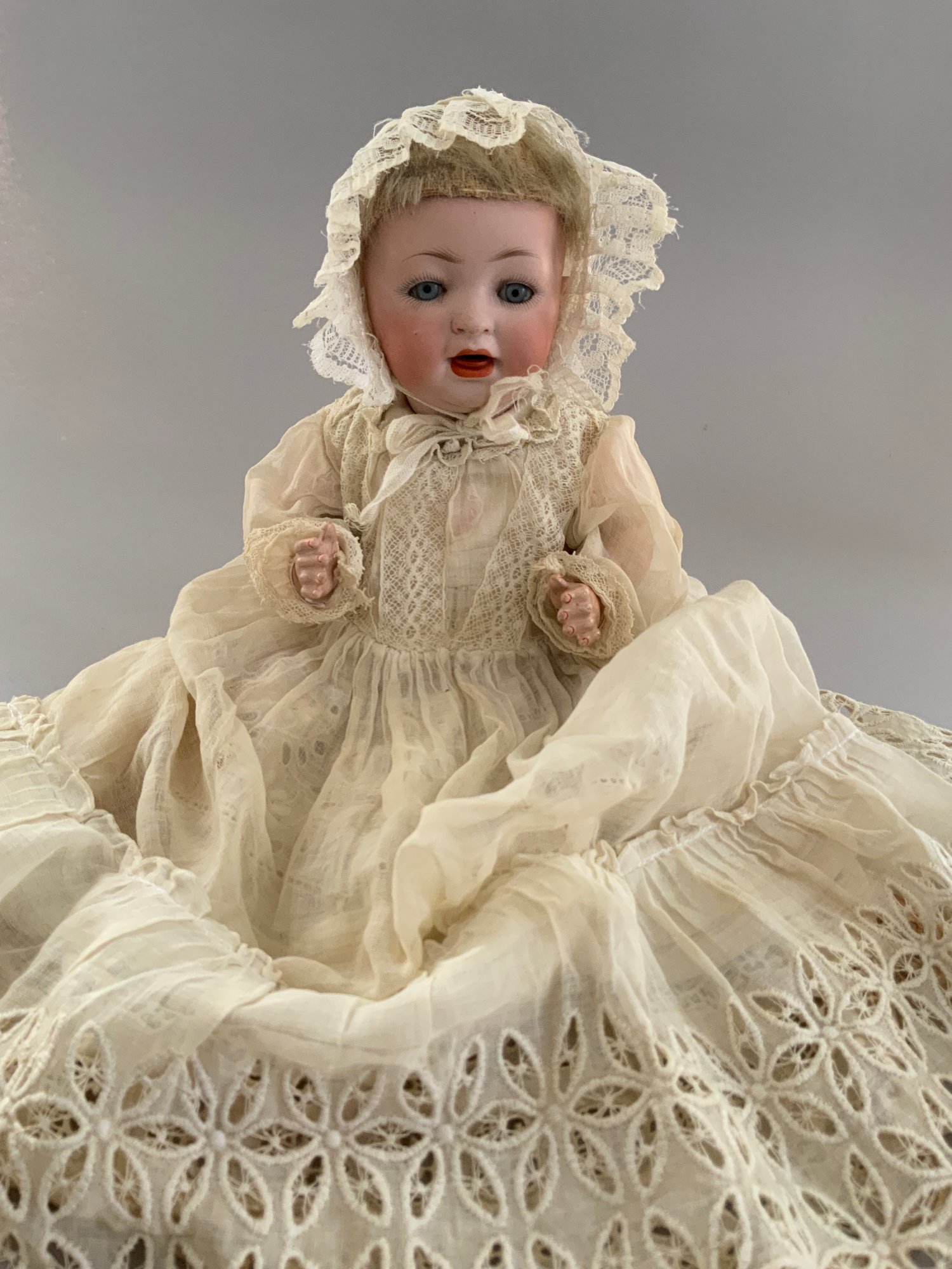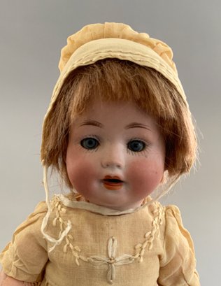 3 – Bisque baby dolls, 1 – 7” 1344-76 Germany, brown glass sleep eyes, OM, baby compo body, 1 - 9” PM 914 Germany, blue glass sleep eyes, OM with teeth, brown mohair wig, baby compo body, & 1 – 11” Kestner 152, blue glass sleep eyes, OM with teeth & tongue, blonde mohair wig, baby compo body, white dress (cheek roughness)