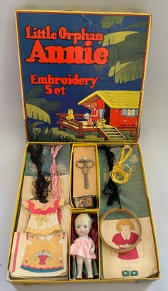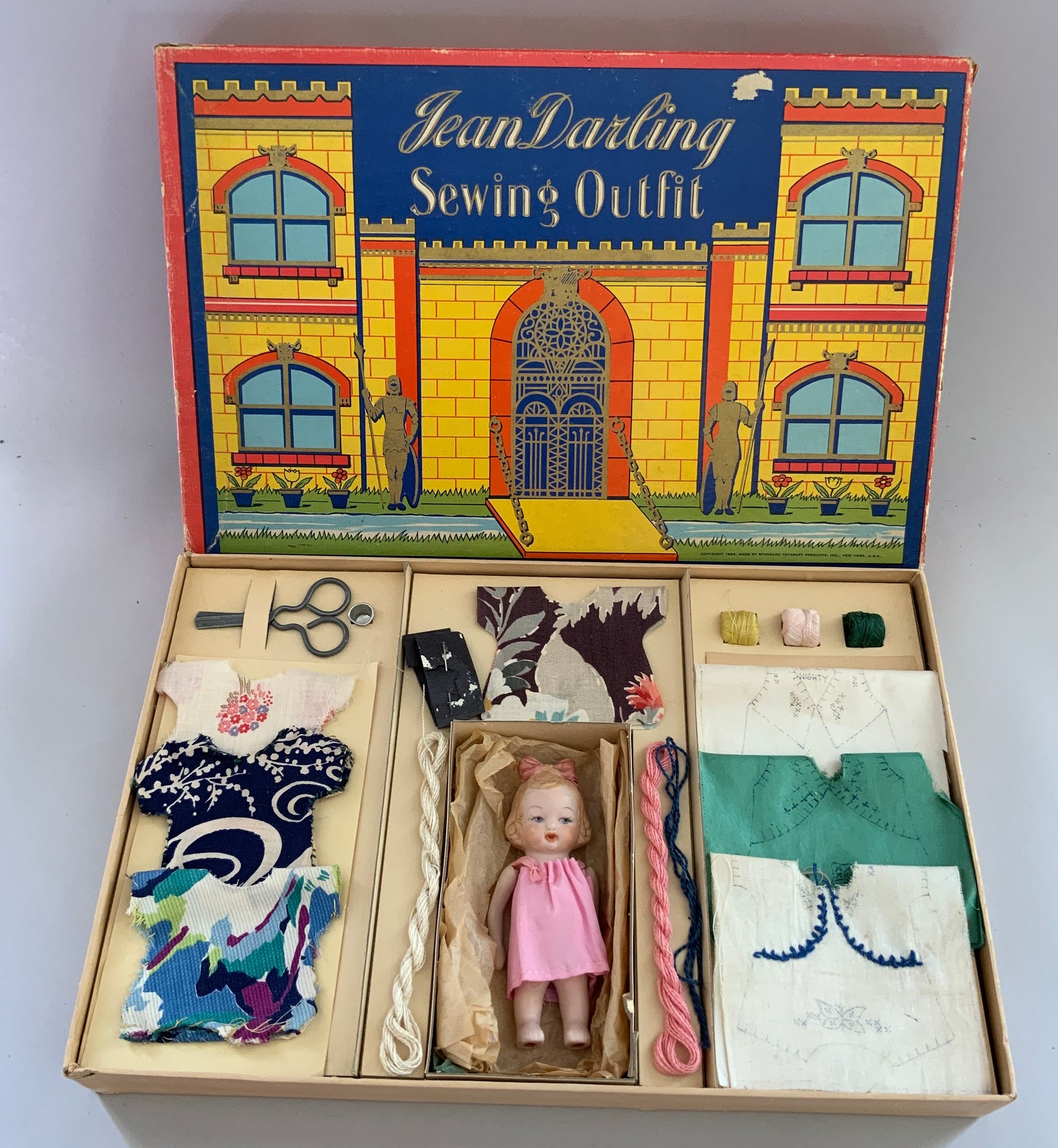 3 – Bisque Doll Sewing Sets, Jean Darling Sewing Outfit # 150, Standard Toycraft Products 1936, Little Orphan Annie and Her Sewing Outfit #1680, J. Pressman 1935, Little Orphan Annie Embroidery Set #1645, J. Pressman 1935, original boxes some wear