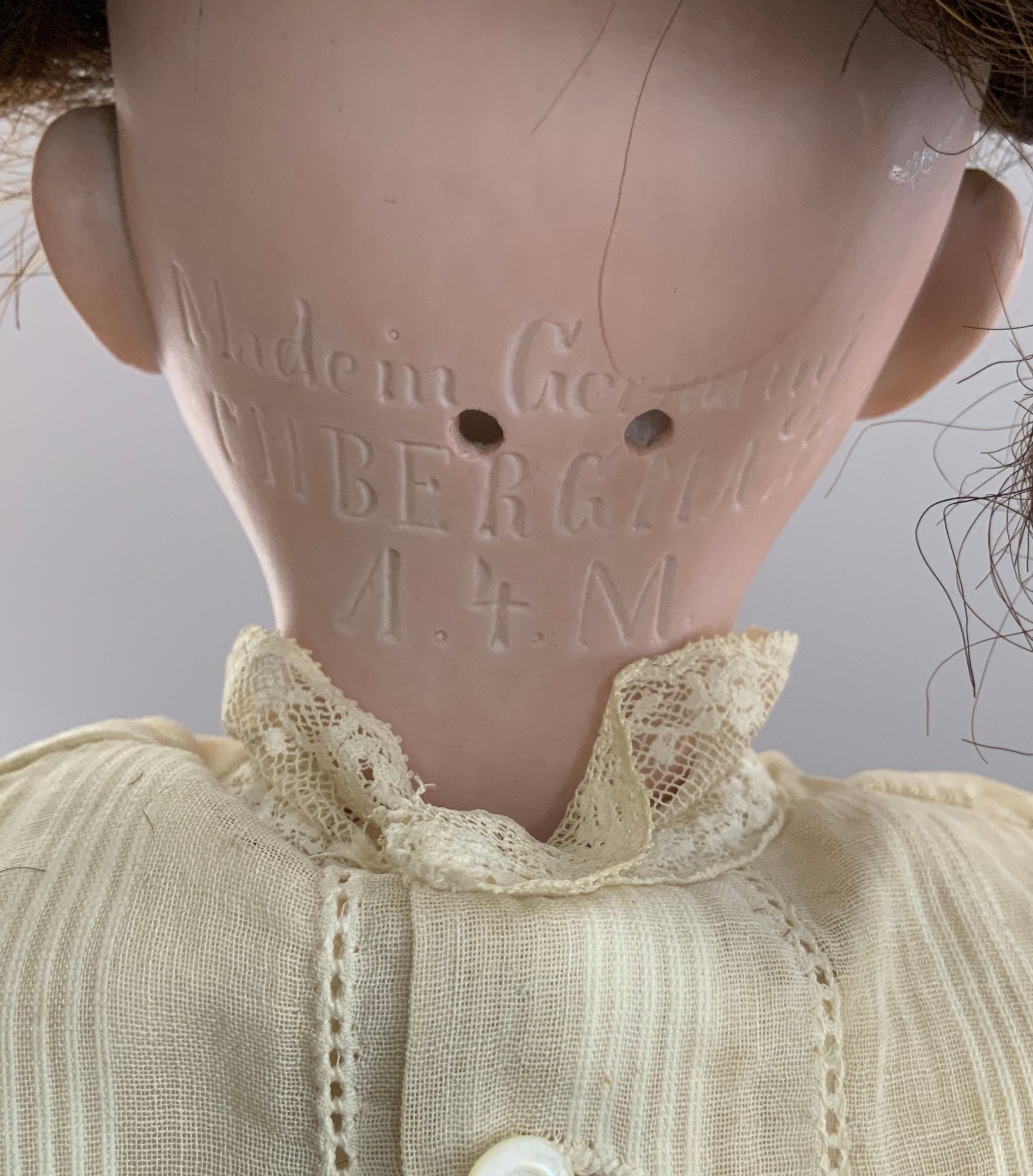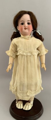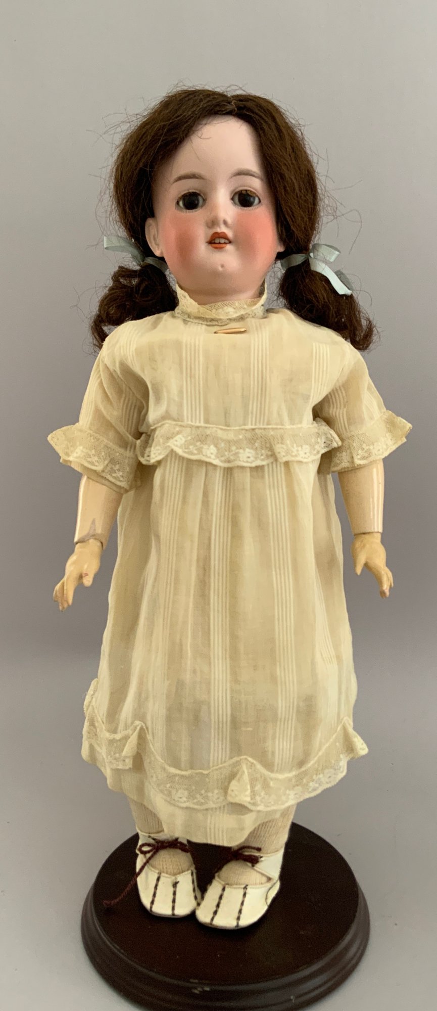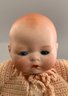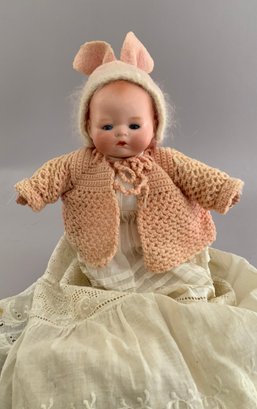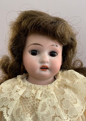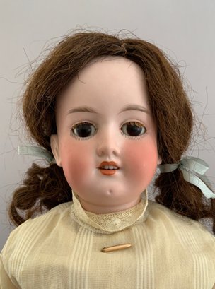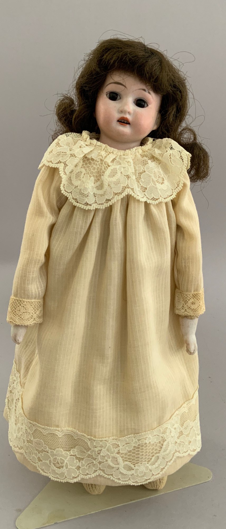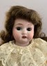 3 – Bisque head dolls, 1 – 19” CM Bergman A4M, brown glass sleep eyes, OM with teeth, brown mohair wig, BJCB, white shear dress, 1 – AM 3200, brown glass eyes, OM with teeth, brown mohair wig, kid body with bisque arms, yellow dress, & 1 – 11” Kestner for Century Doll Co. baby, blue glass sleep eyes, cloth body, compo arms, white gown with knit sweater (Ex Dolores Smith)