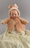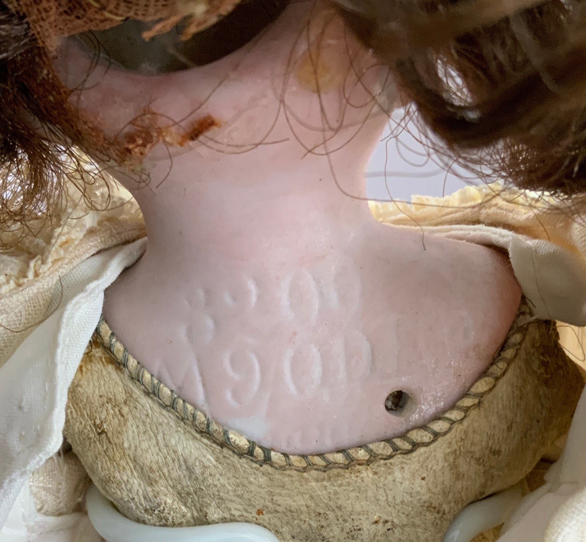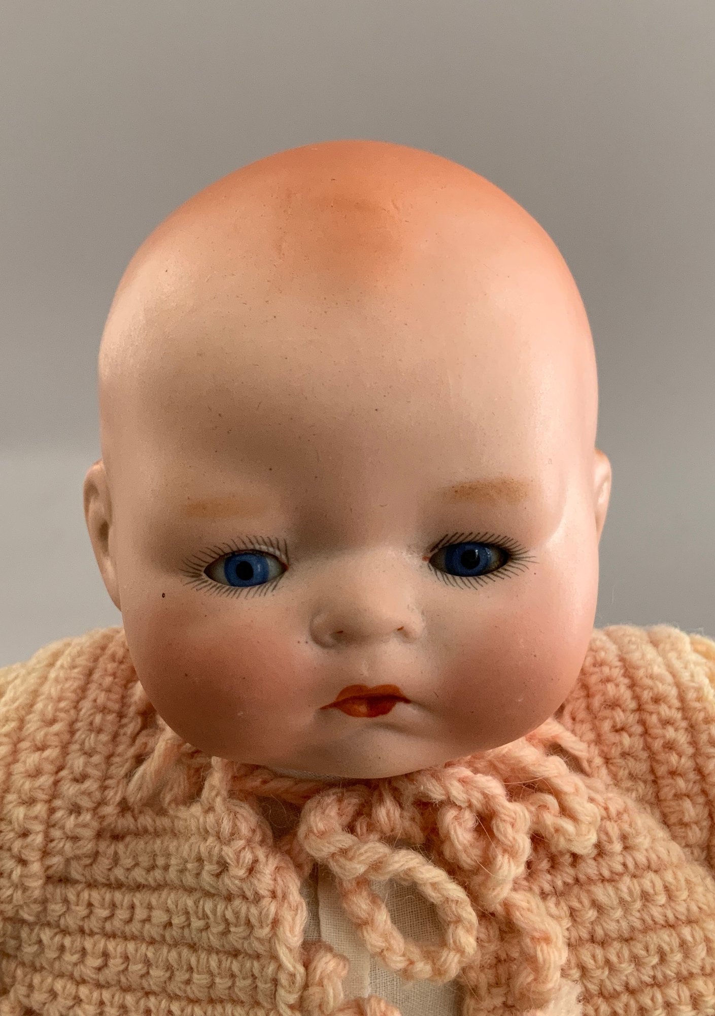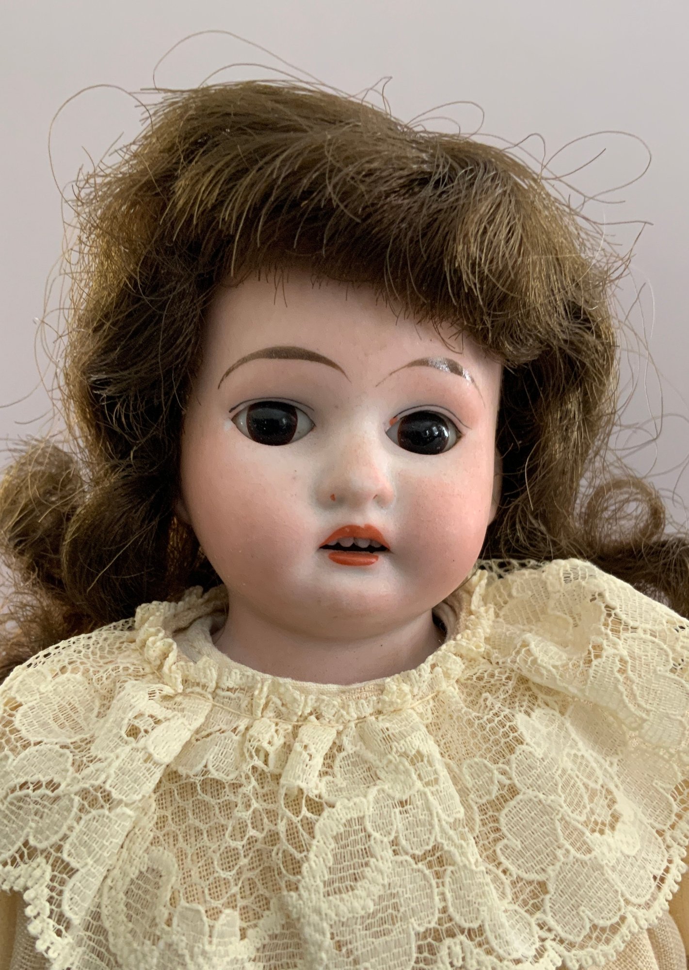 3 – Bisque head dolls, 1 – 19” CM Bergman A4M, brown glass sleep eyes, OM with teeth, brown mohair wig, BJCB, white shear dress, 1 – AM 3200, brown glass eyes, OM with teeth, brown mohair wig, kid body with bisque arms, yellow dress, & 1 – 11” Kestner for Century Doll Co. baby, blue glass sleep eyes, cloth body, compo arms, white gown with knit sweater (Ex Dolores Smith)