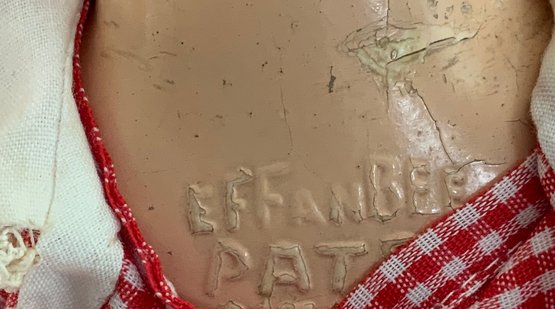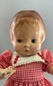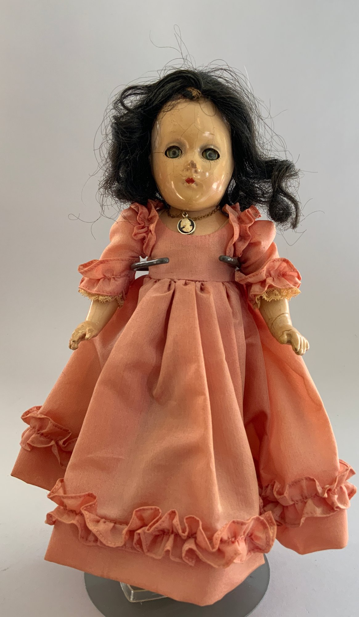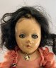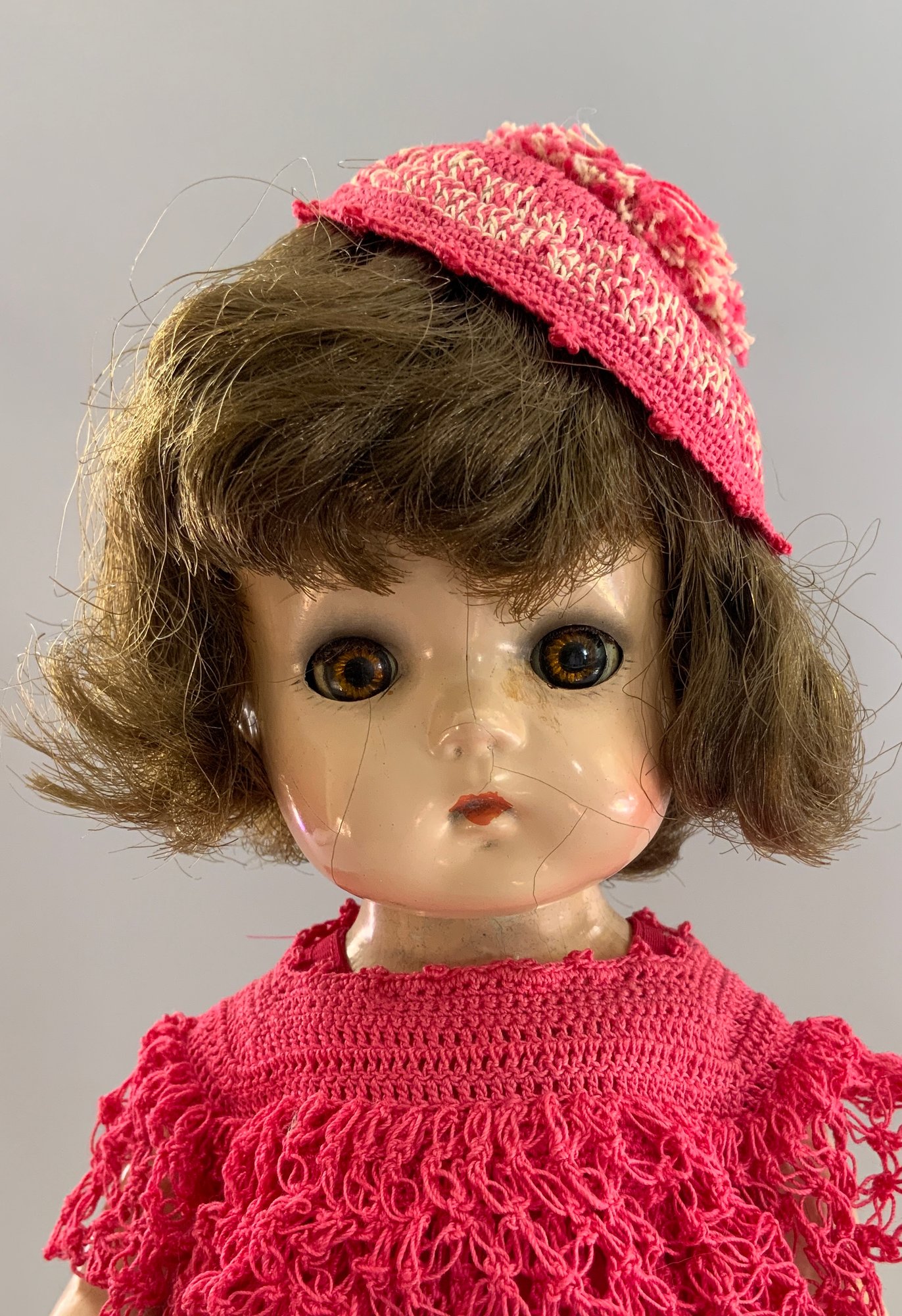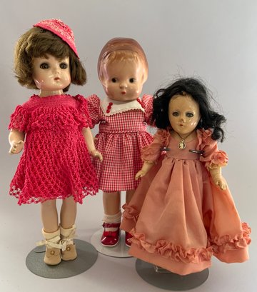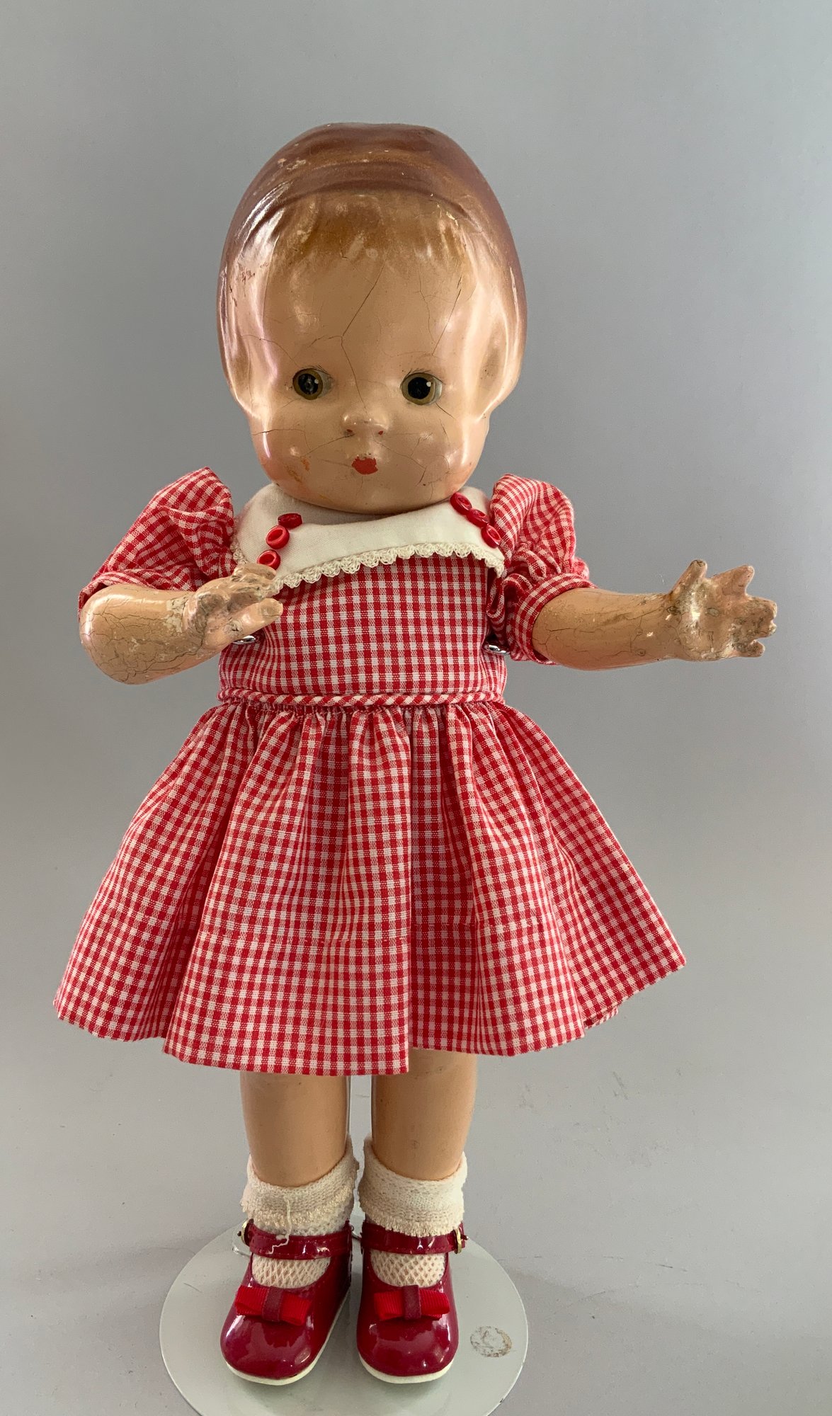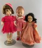 3 – Composition dolls, 1 – 11” glass eye (splatterd), peach dress, black wig, 1 – 14” Effanbee Patsy, red check dress, crazing compo, 1 – 14” brown glass sleep eyes, Alexander patent body, red dress, (crazing compo)