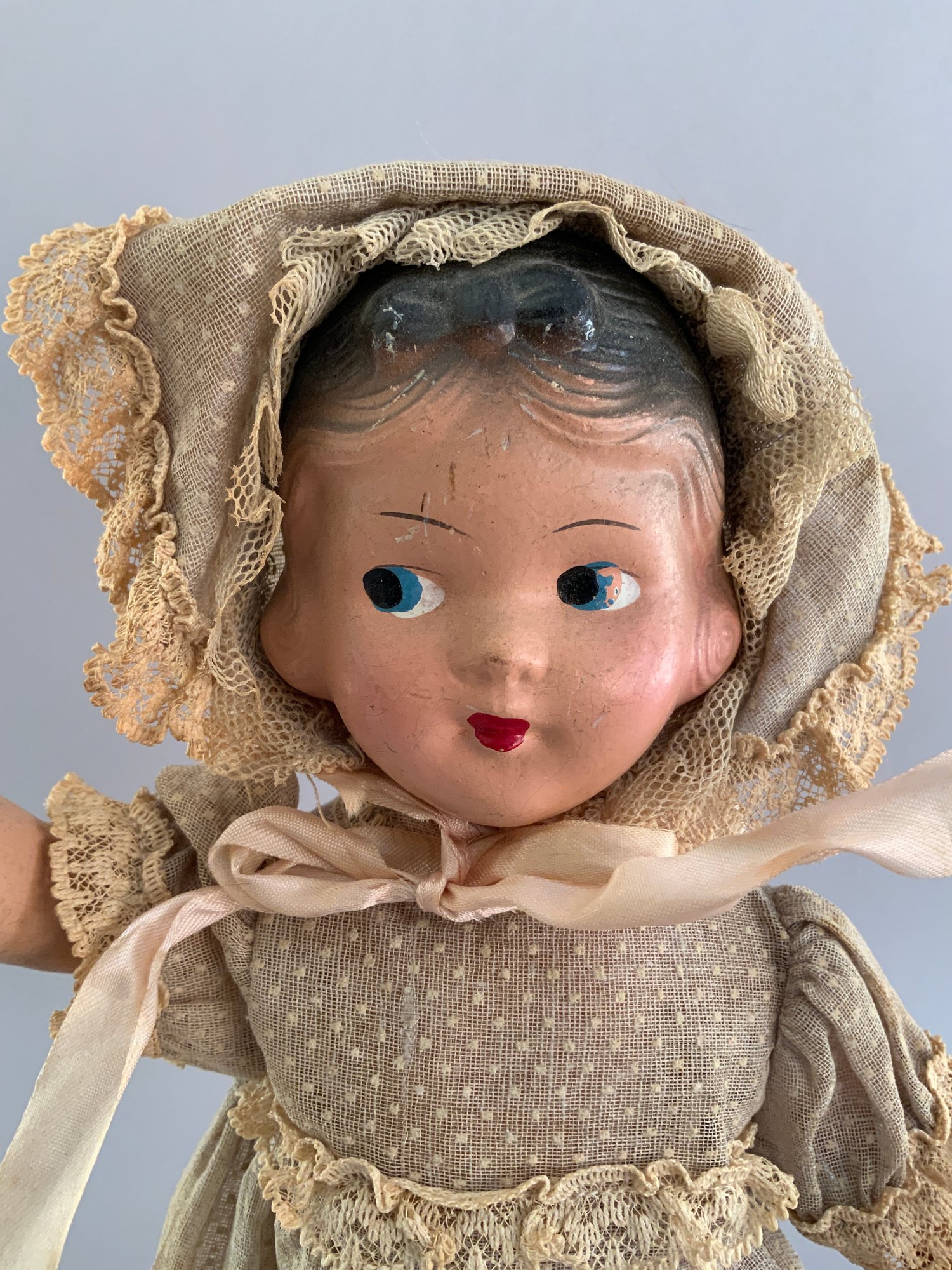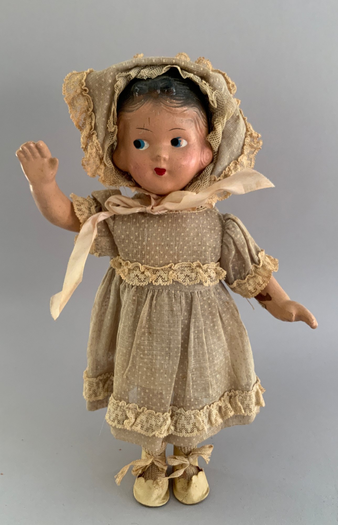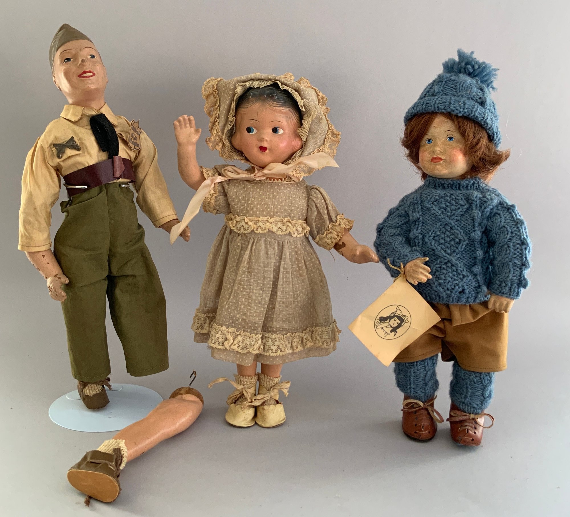 3 – Composition dolls, 1 -14” Phylliss Gift “Jellison” artist doll K*R114 PGJ83 mark, blue knit outfit, 1 – 13” cracked head in brown pin dot dress, & 1 – 15” Douglas MacArthur by Freundlich in uniform, left leg loose