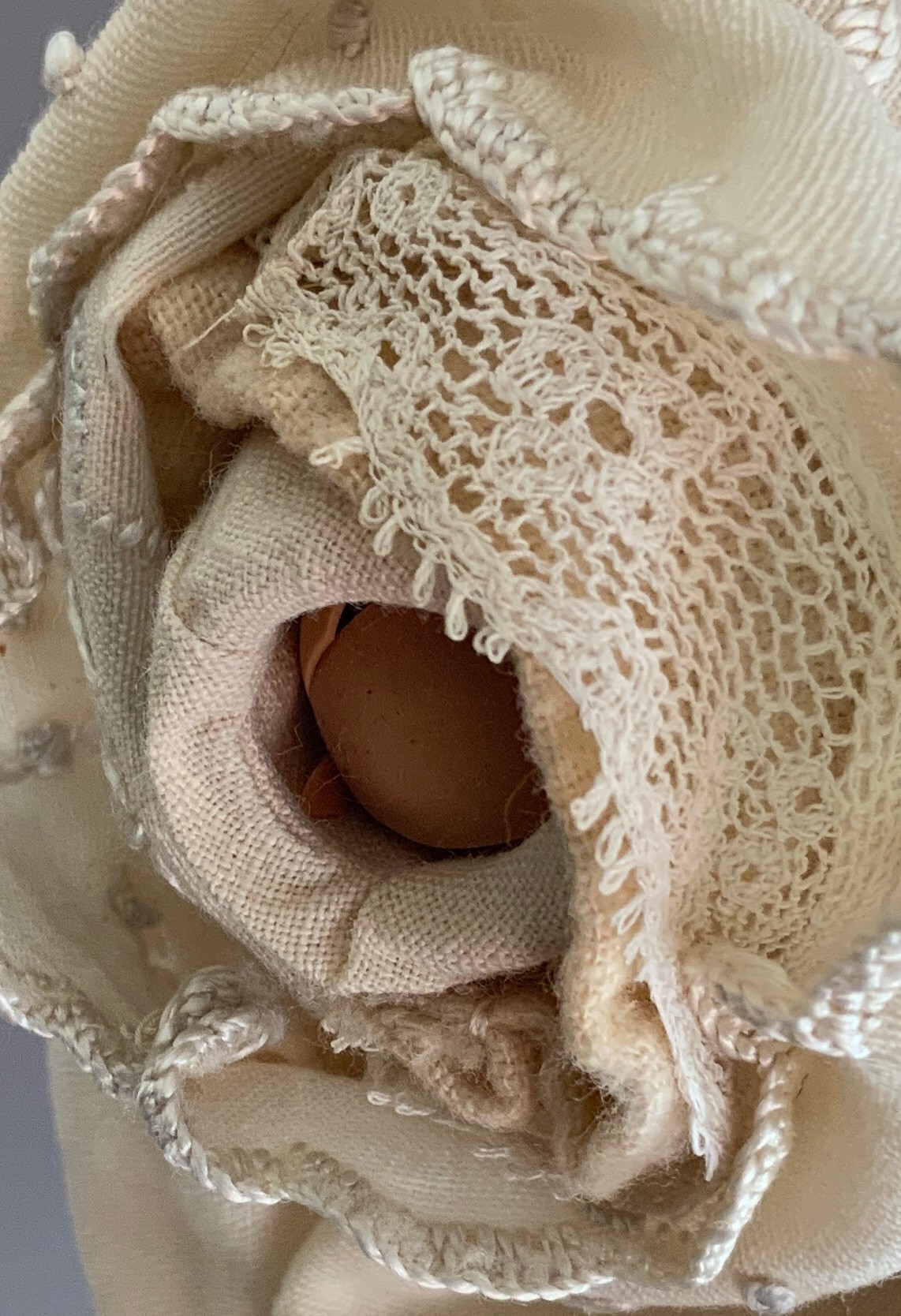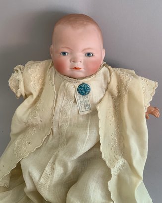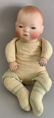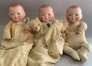 3 – Grace S Putnam bisque head Bye-Lo-Baby dolls, 12” – 14” long sleep eyes, cloth bodies, various outfits (stains, holes, one missing right hand)
