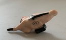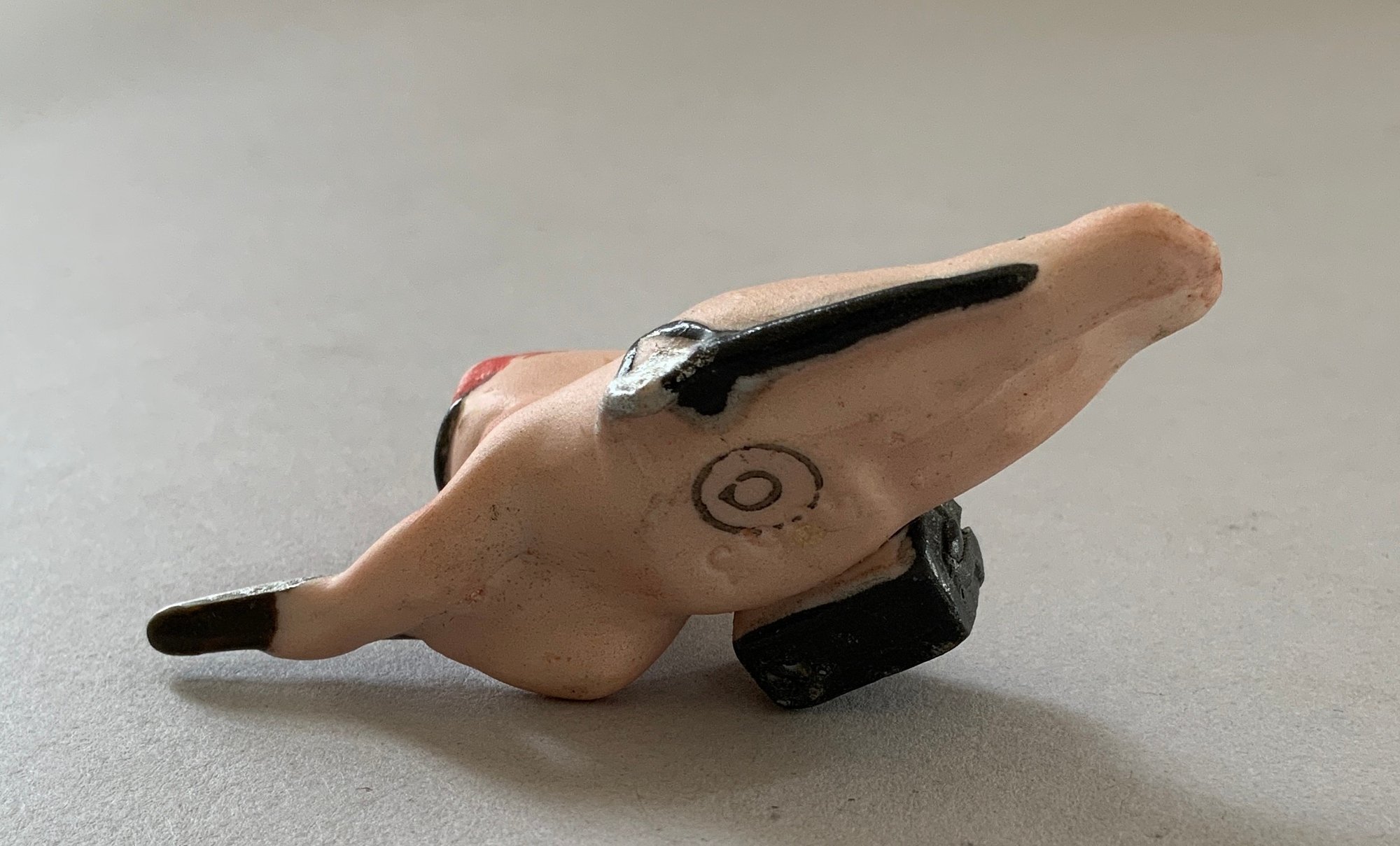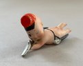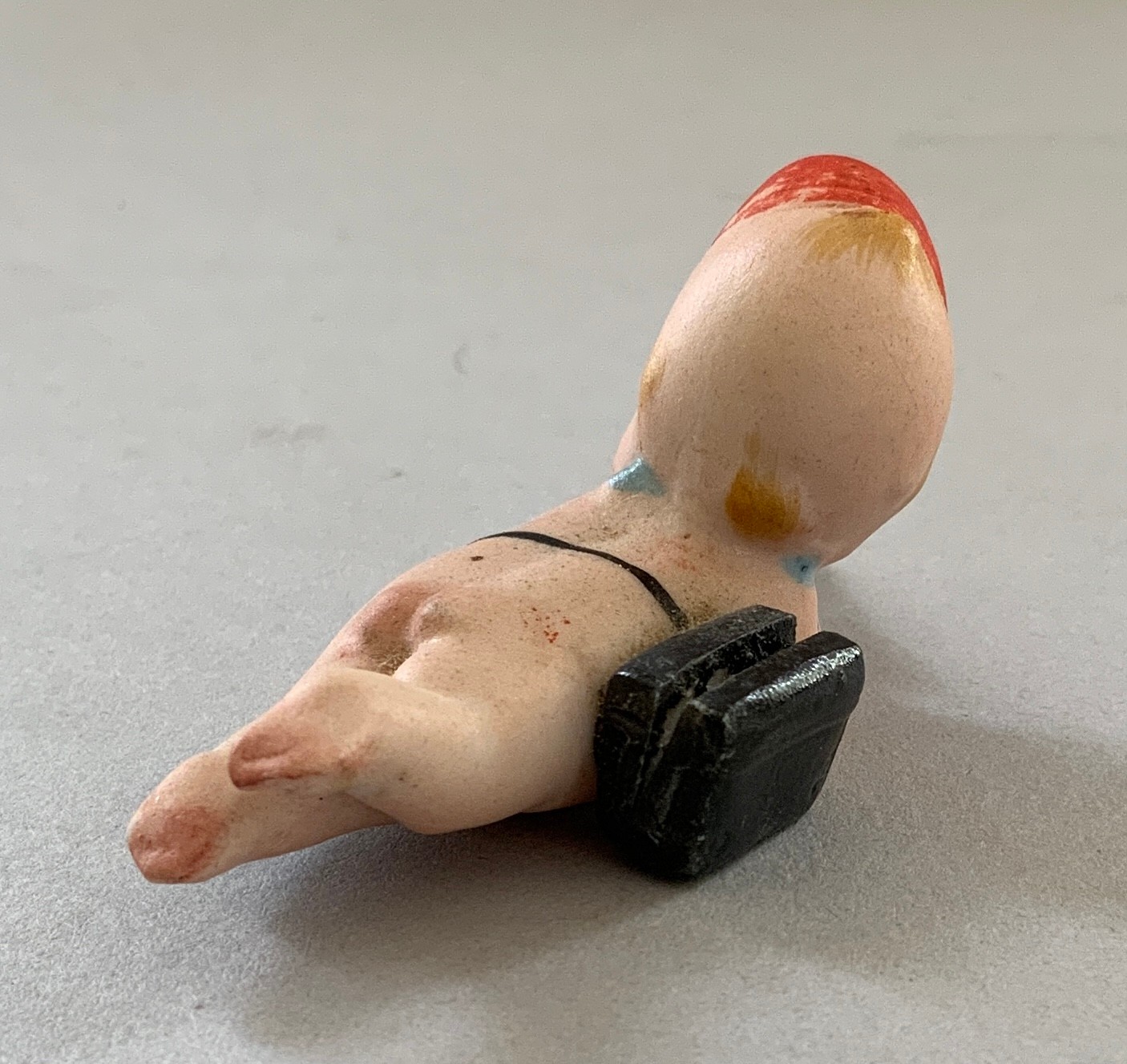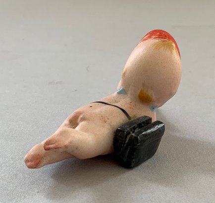 3" Long Kewpie, with molded & red painted hat with black brim, prone with rifle and ammunition bag, 4863 incised on bottom with circle c