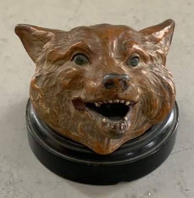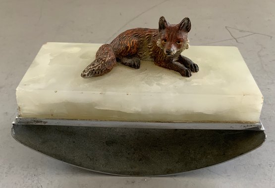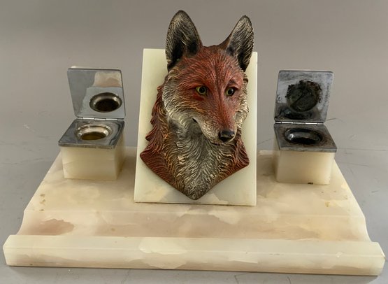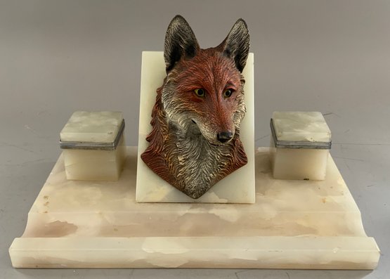 3 – Piece Vienna bronze desk set 11 ½” long x 6 5/8 wide, fox head on sloped onyx base with flanking onyx inkwells with lift tops (small chips right inkwell is loose, left inkwell has base crack), all mounted on fluted front onyx base with full Vienna bronze fox on onyx base blotter & Vienna bronze fox head on stone base (head is loose)