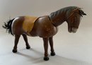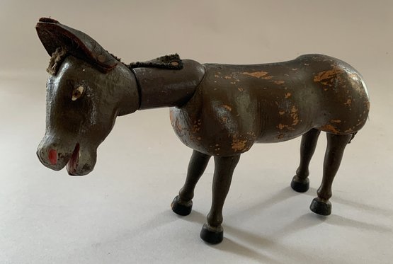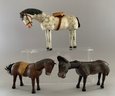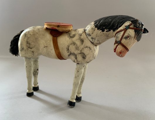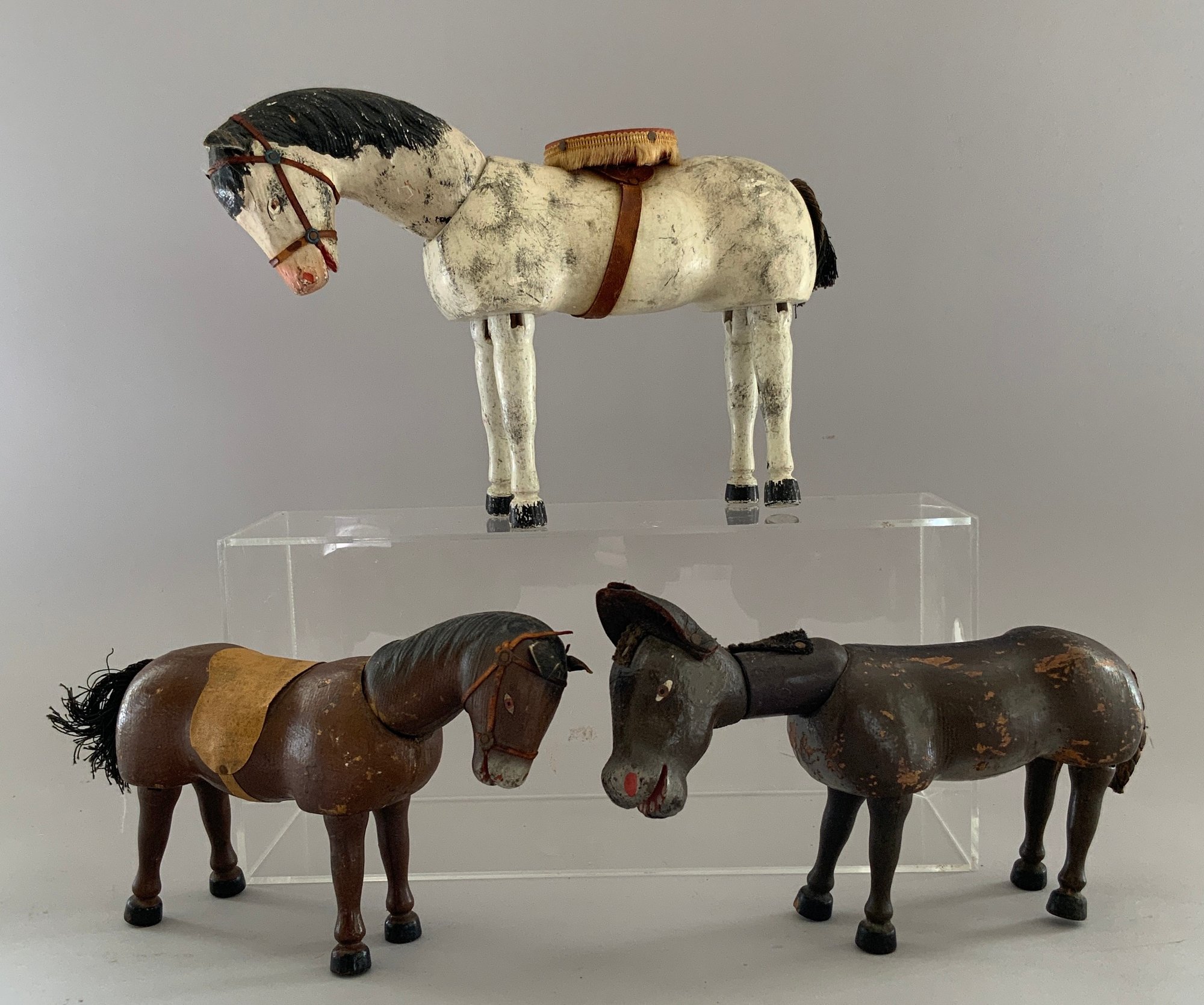 3 - Schoenhut animals, 10” long white/black horse, painted features with a saddle, 8” long donkey, painted features, & 8” long brown horse, painted features with a saddle, all have rubs & wear