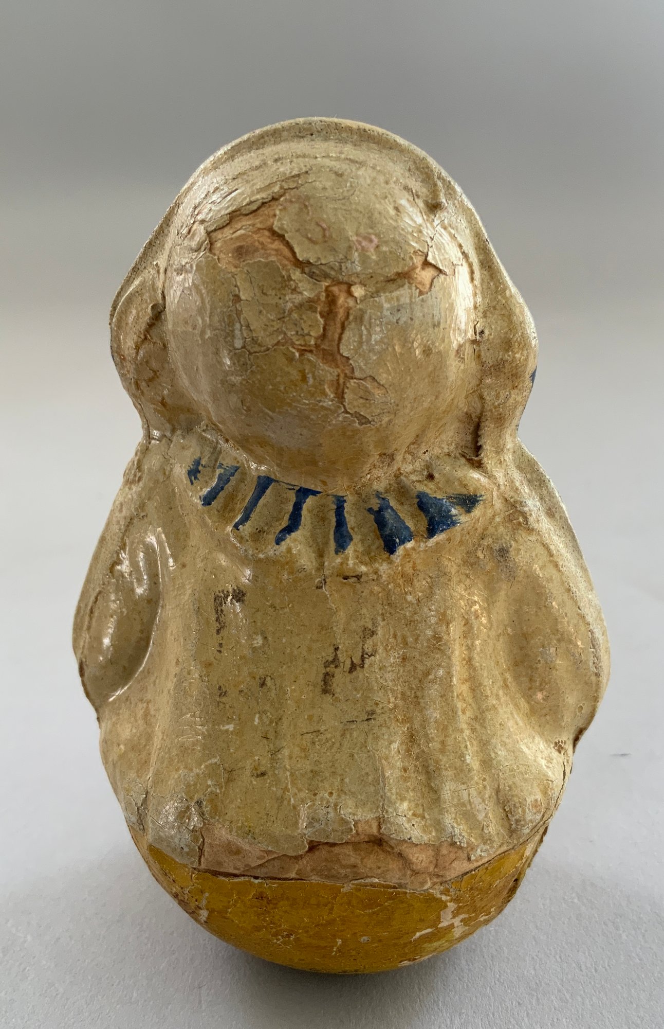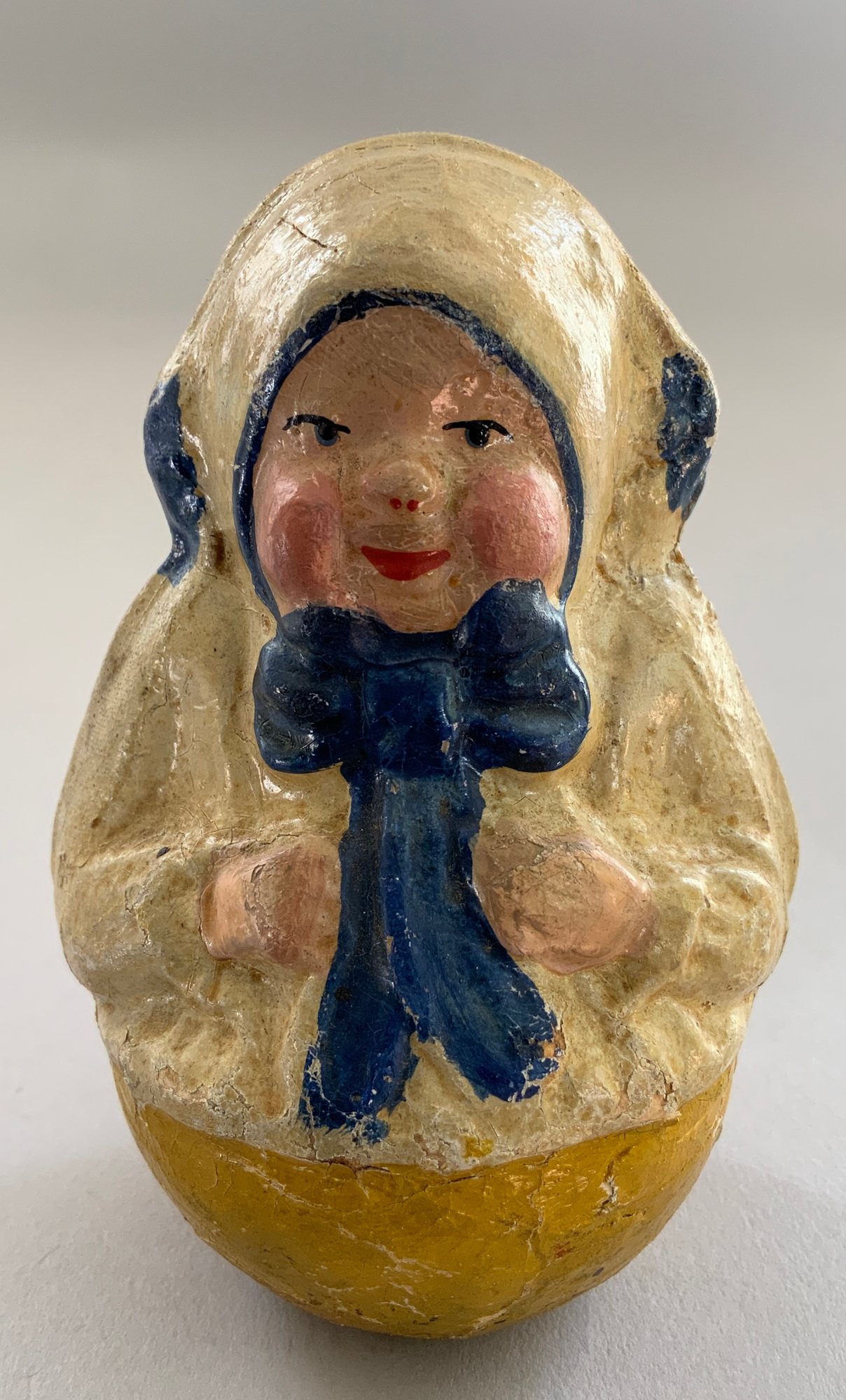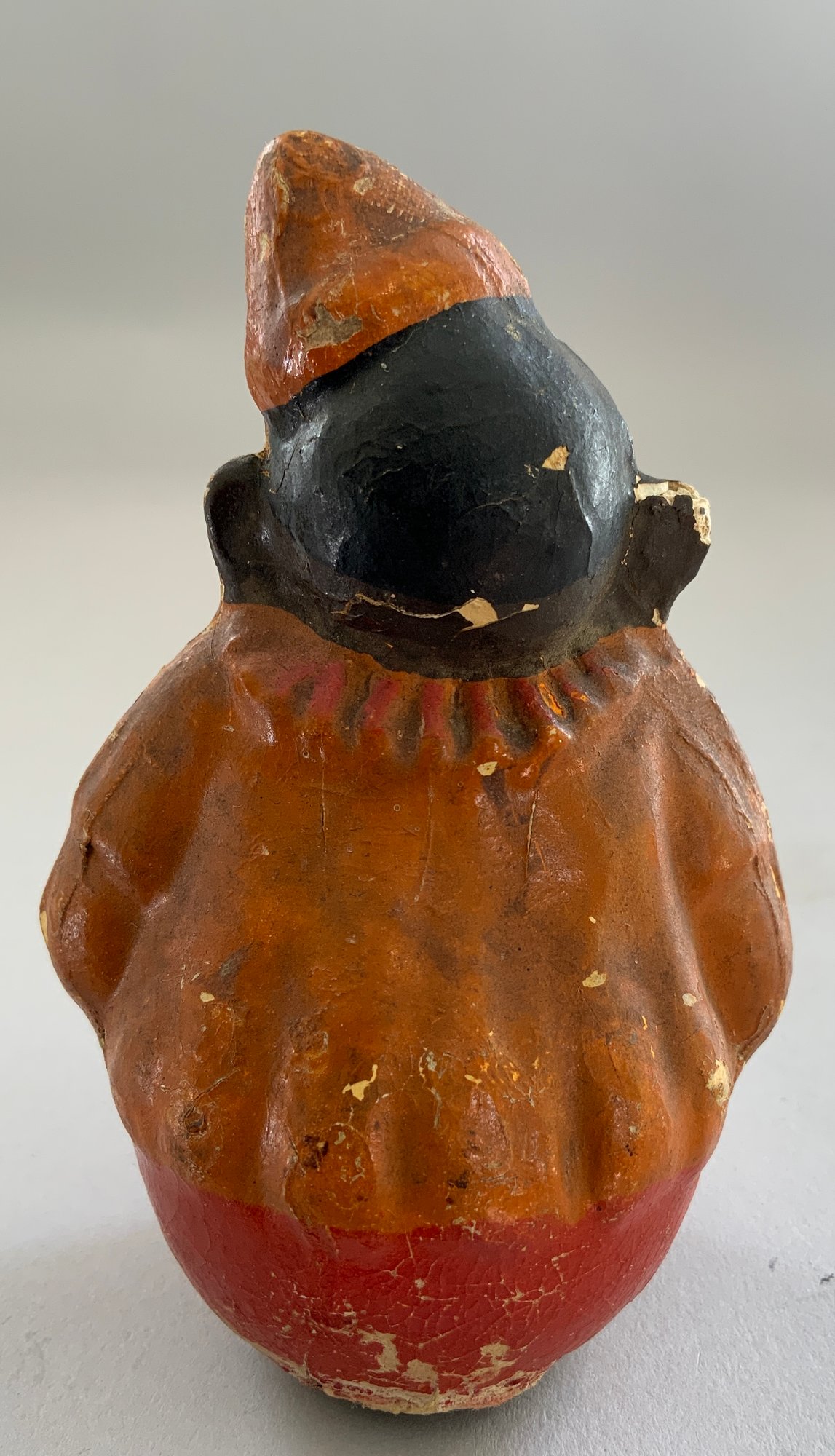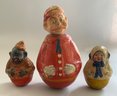 3 – Schoenhut paper mache Rolly Dolly toys, 2 – 4”, 1 – 7”, painted, weighted bases, 7” is a bobble head, (rubs, crazing, cracks. Wear)