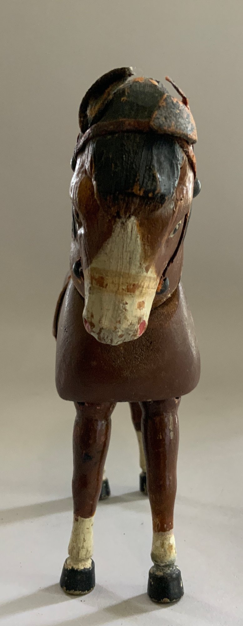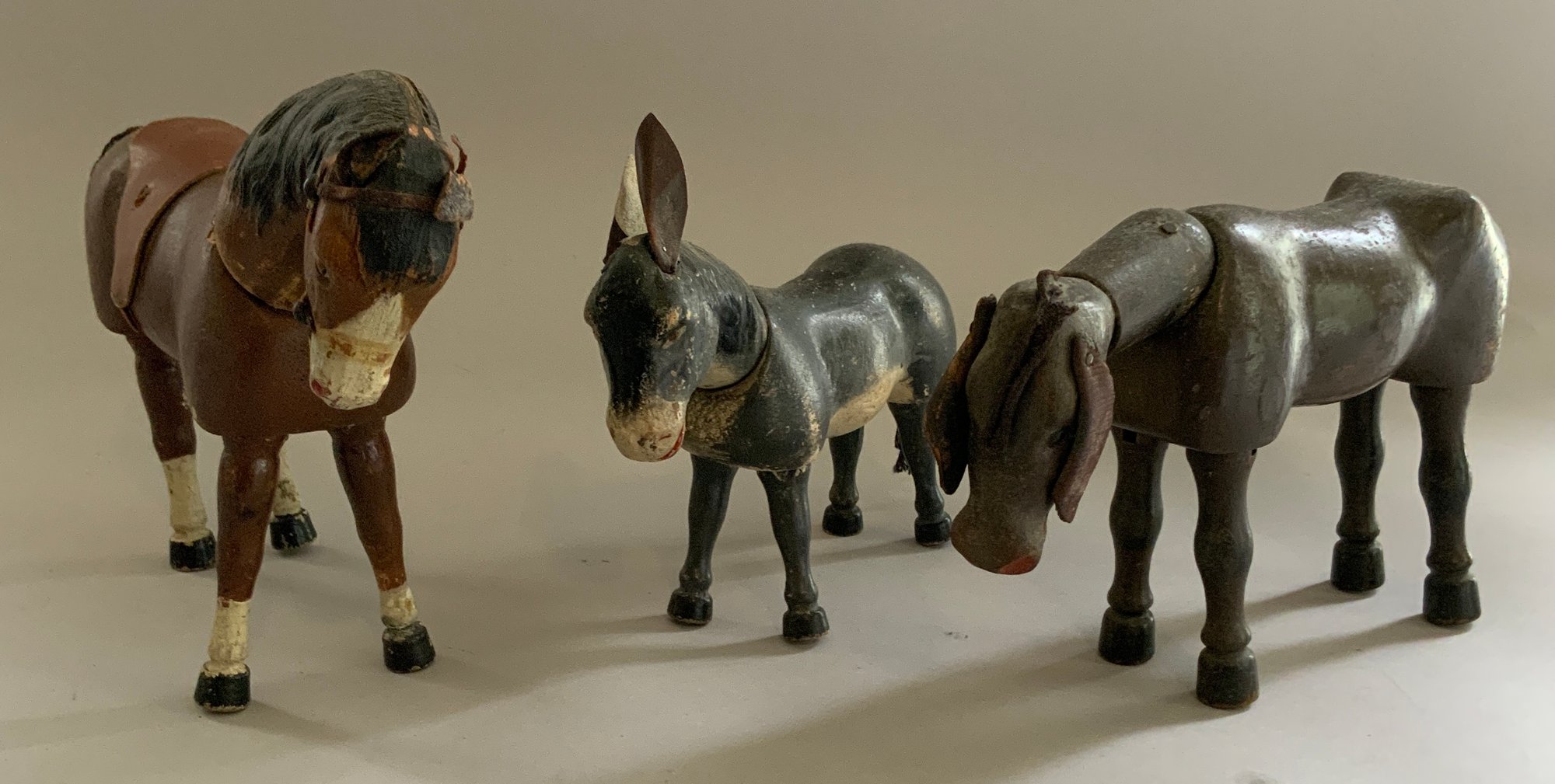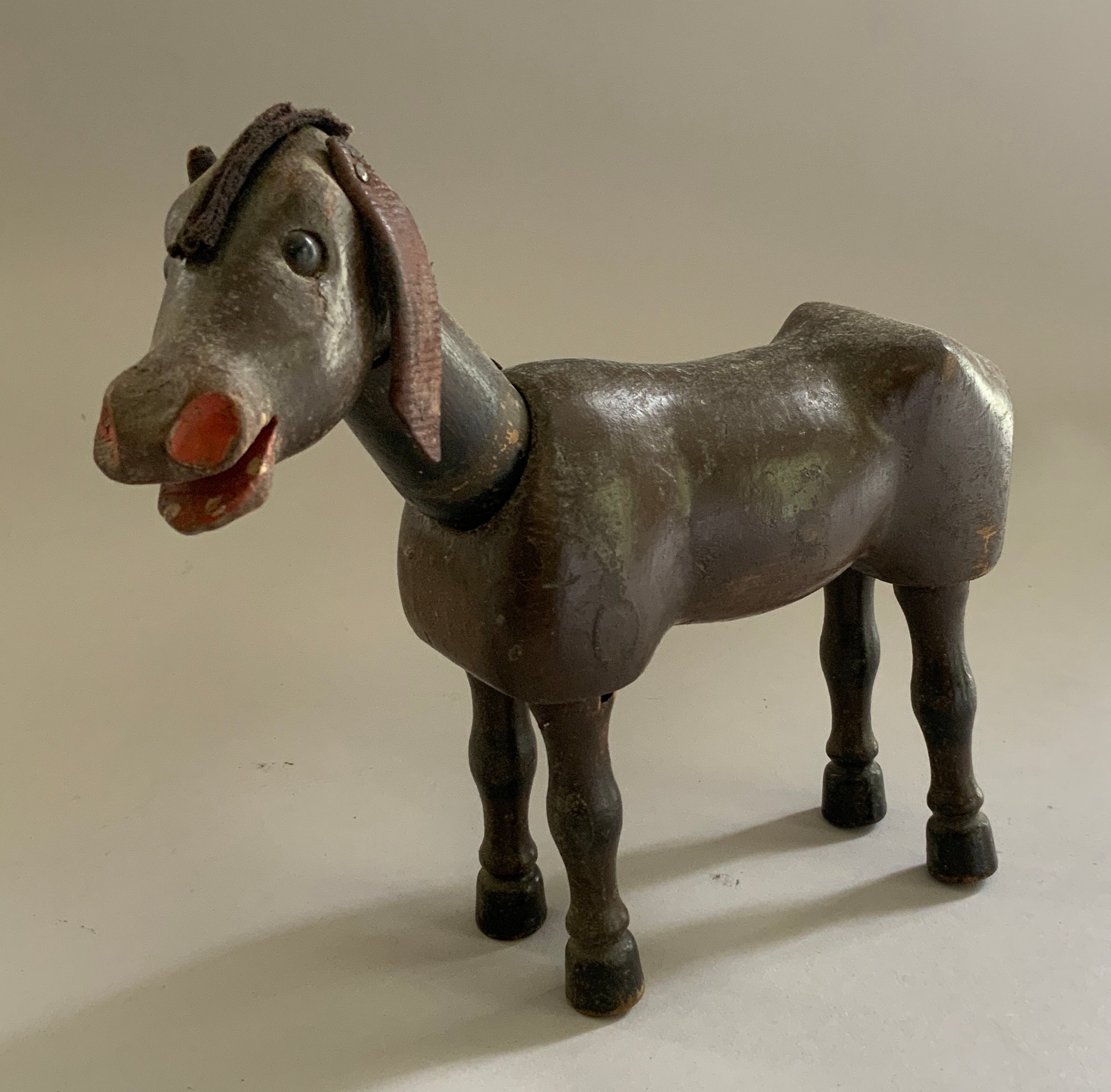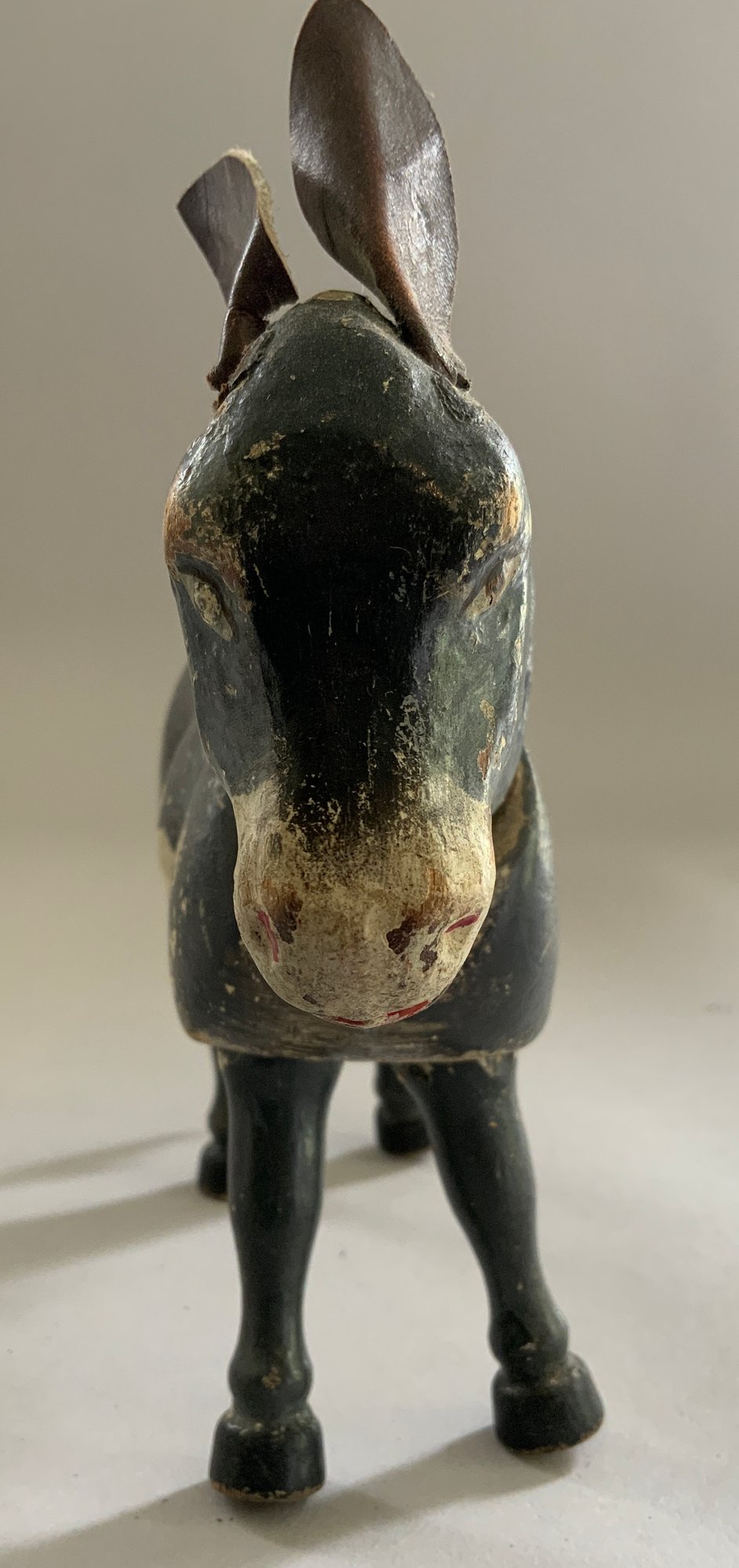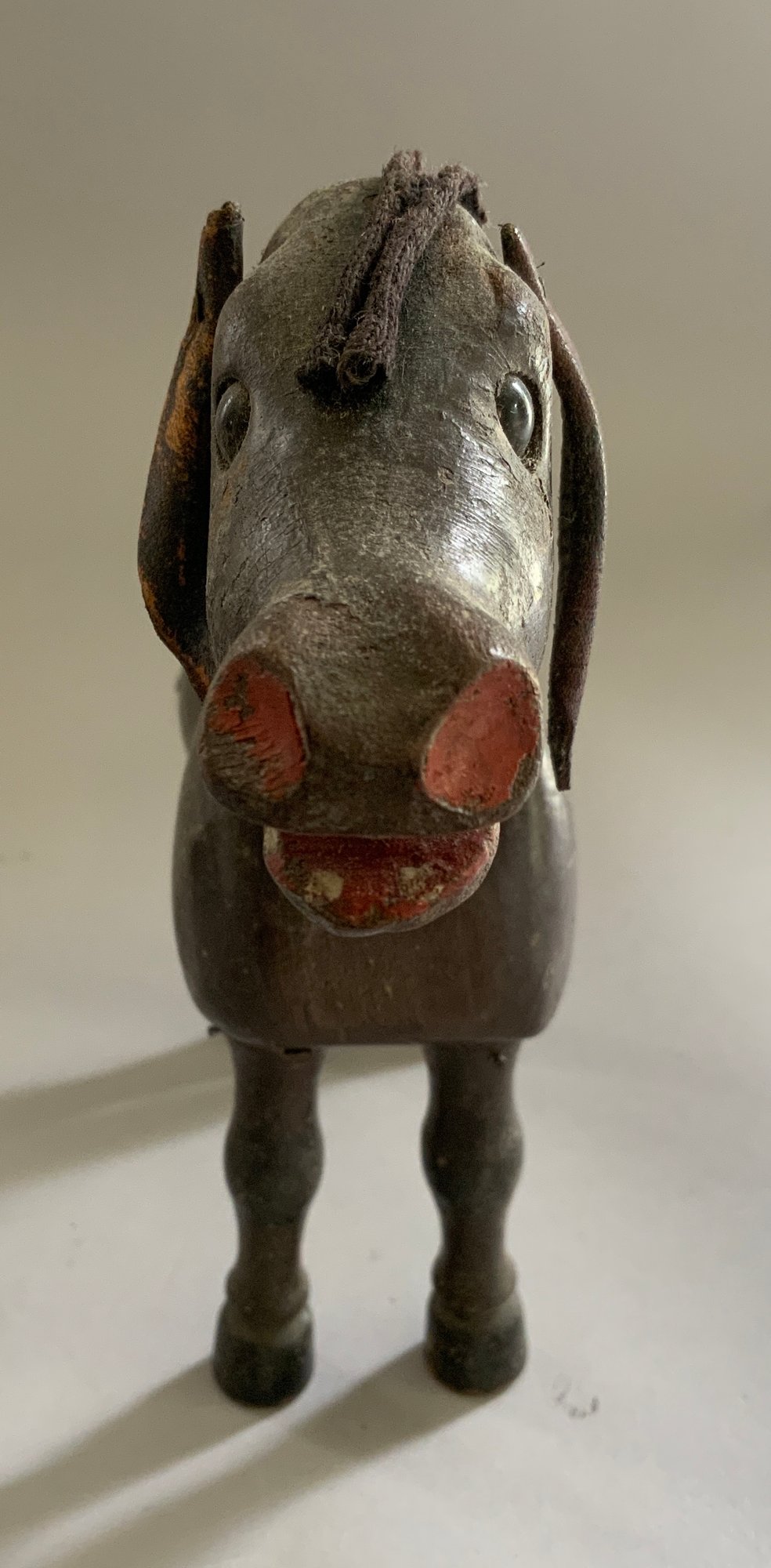 3 – Schoenhut wood animals, 1 – 9 ½” Horse, painted features, carved mane, leather ears, saddle (breaks), bridle, (rubs & wear), 1 – 7” Burrow, painted features, replaced leather ears, (rubs & wear), & 1 – 9” Donkey, glass eyes, leather ears (1 replaced), rope tail, (rubs & wear)