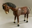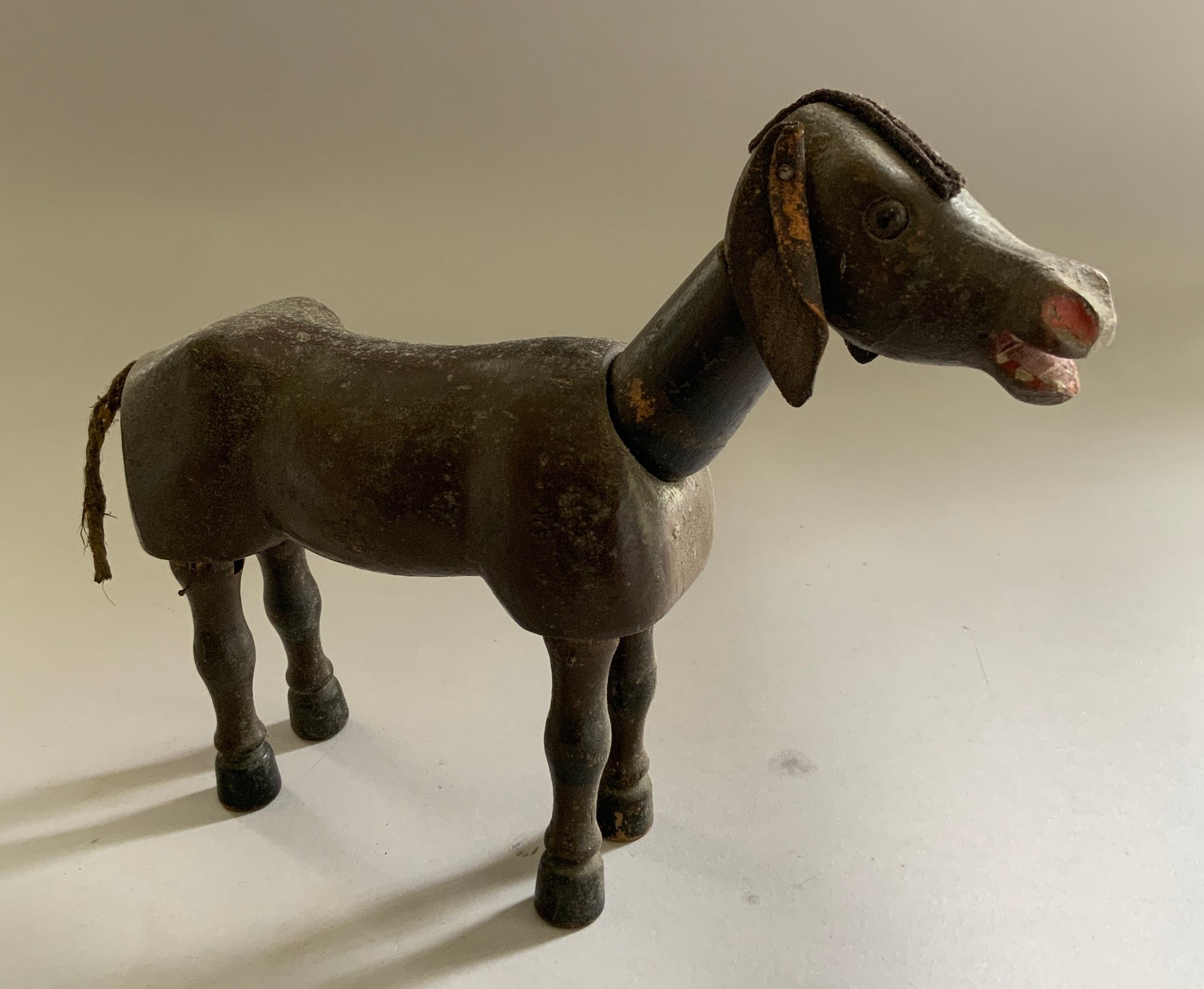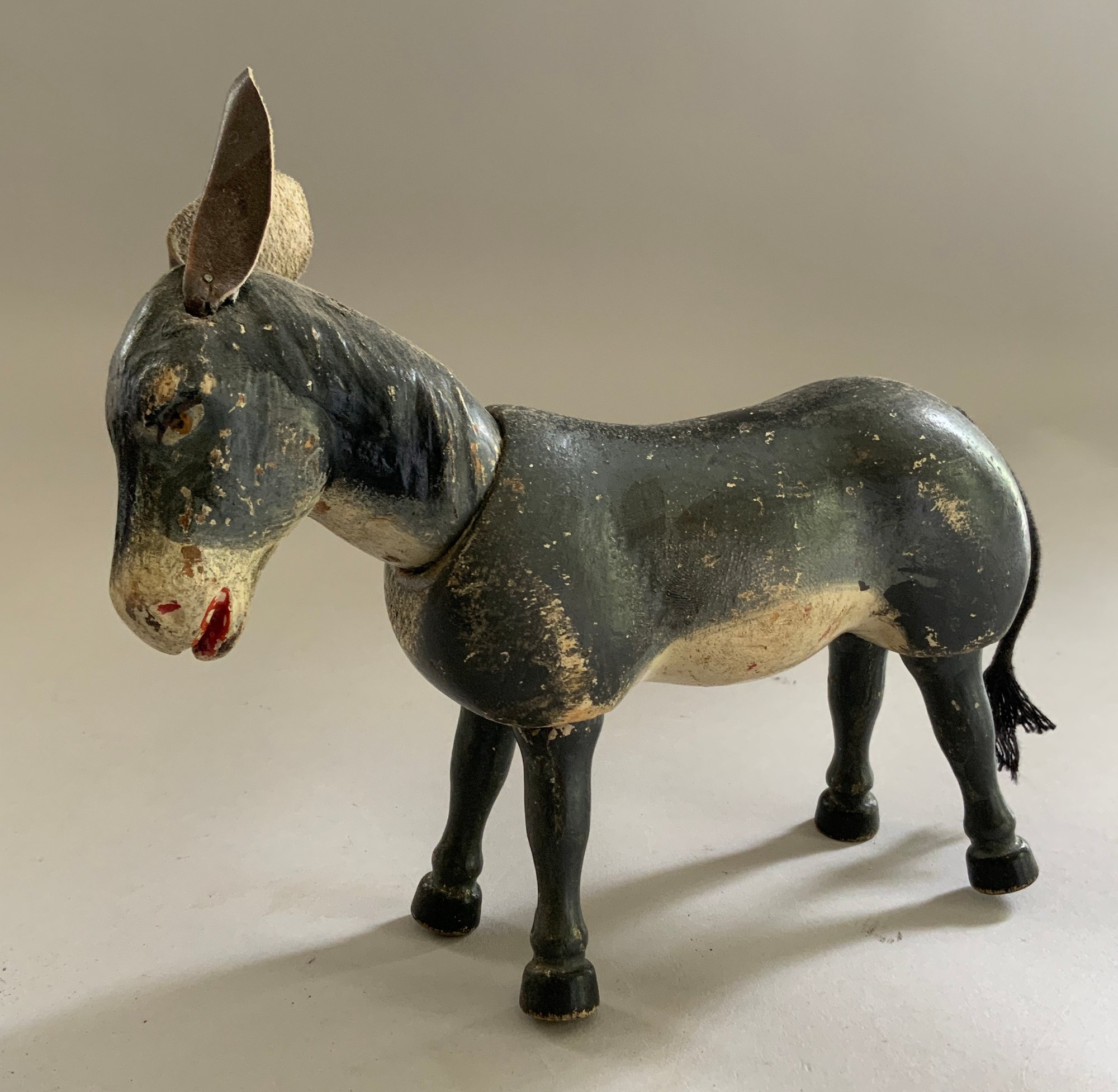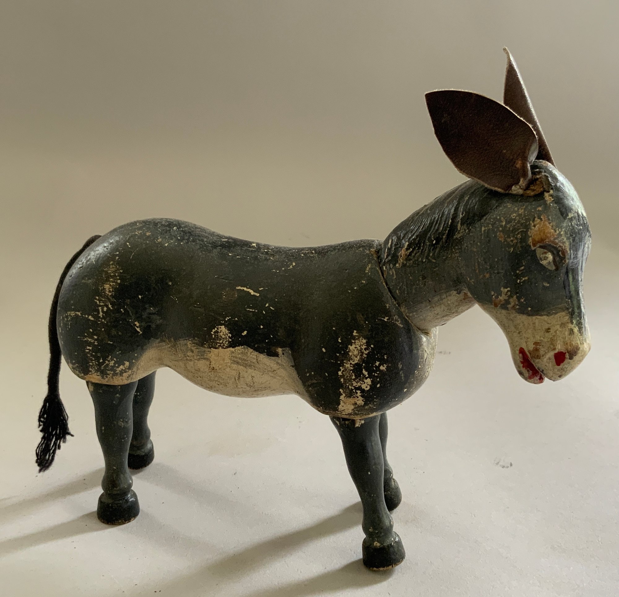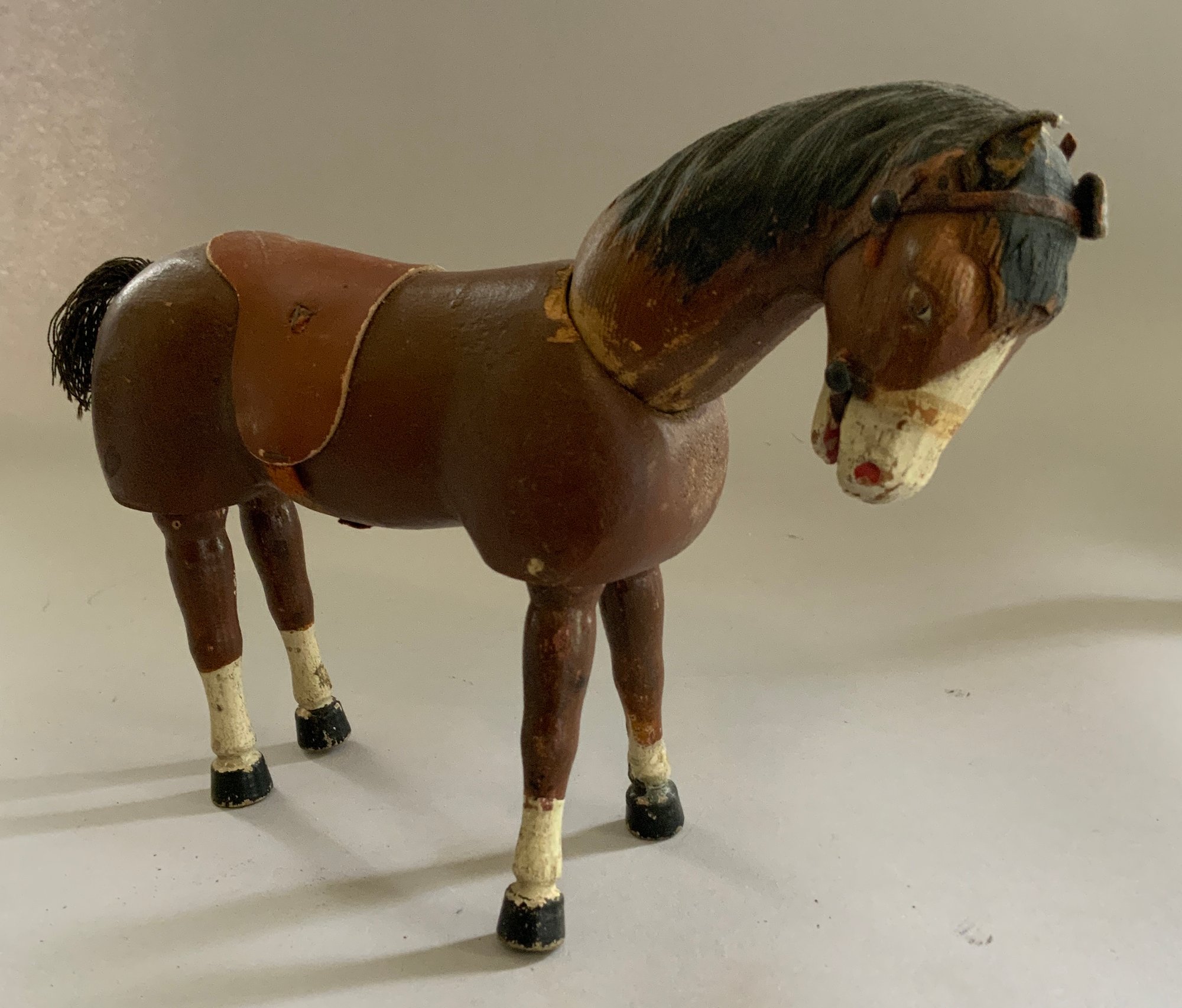 3 – Schoenhut wood animals, 1 – 9 ½” Horse, painted features, carved mane, leather ears, saddle (breaks), bridle, (rubs & wear), 1 – 7” Burrow, painted features, replaced leather ears, (rubs & wear), & 1 – 9” Donkey, glass eyes, leather ears (1 replaced), rope tail, (rubs & wear)