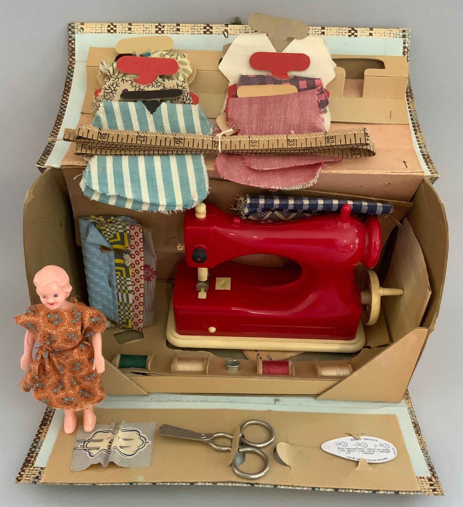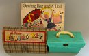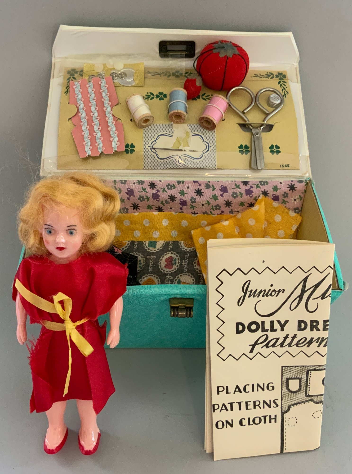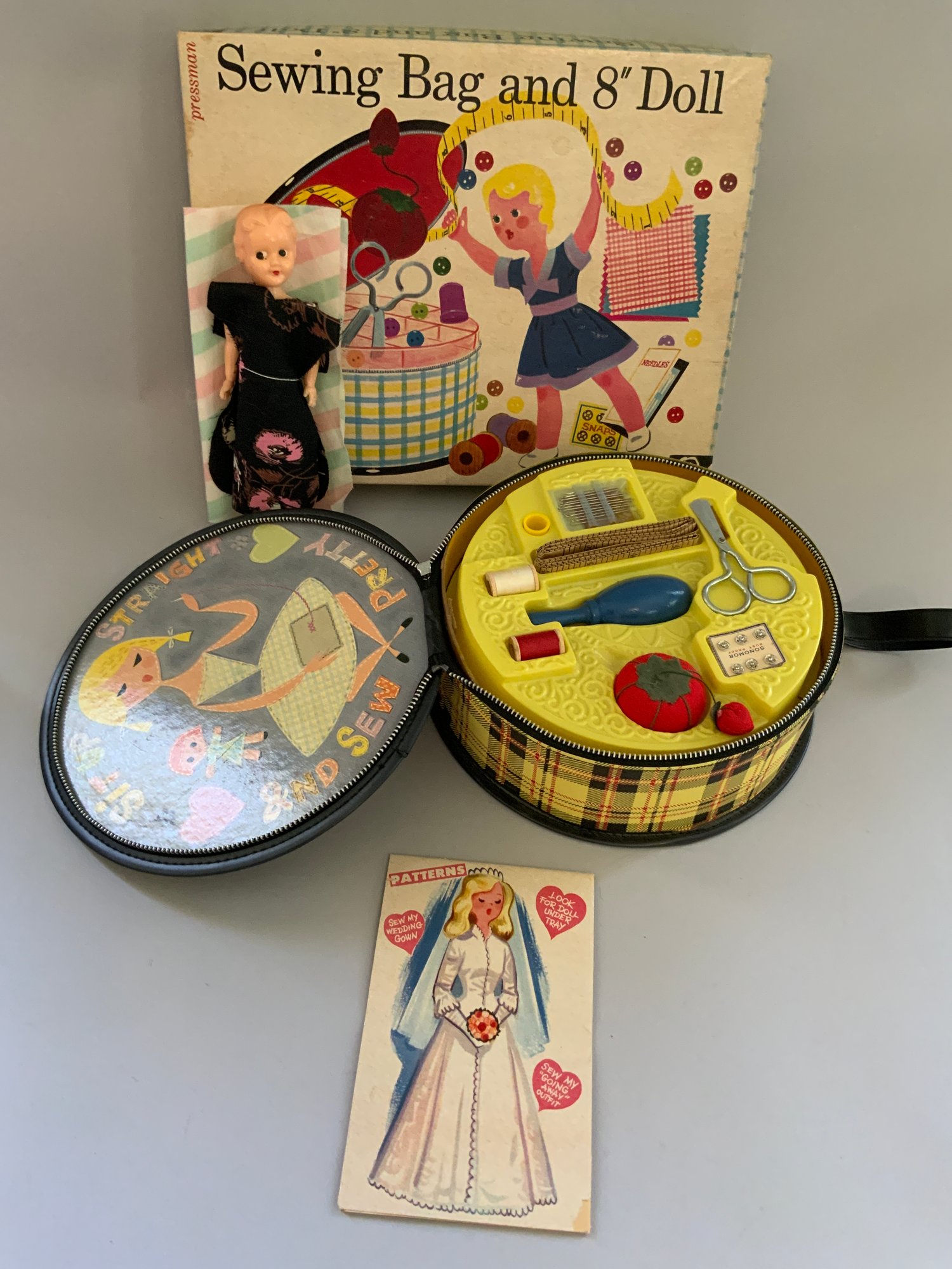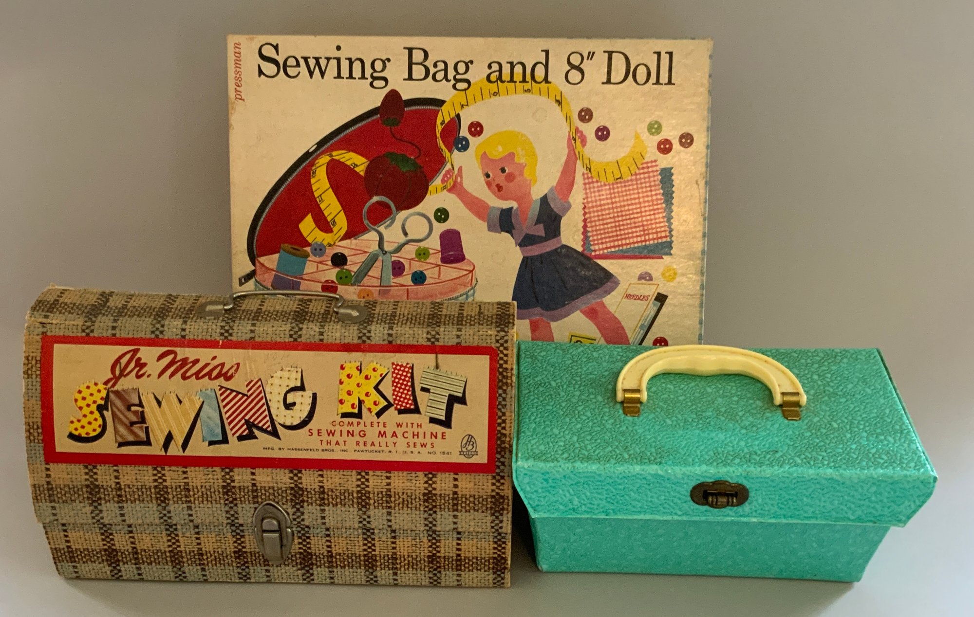 3 – Sewing kits, Jr. Miss Sewing Kit complete with sewing machine by Hassenfield Bros. No. 1541 in original box, Jr Miss Delux Sewing Basket No. 1555 by Hassenfield Bros. in original case, & Pressman Sewing Bag and 8” Doll by Pressman Toy Corp. No 3306 in original box