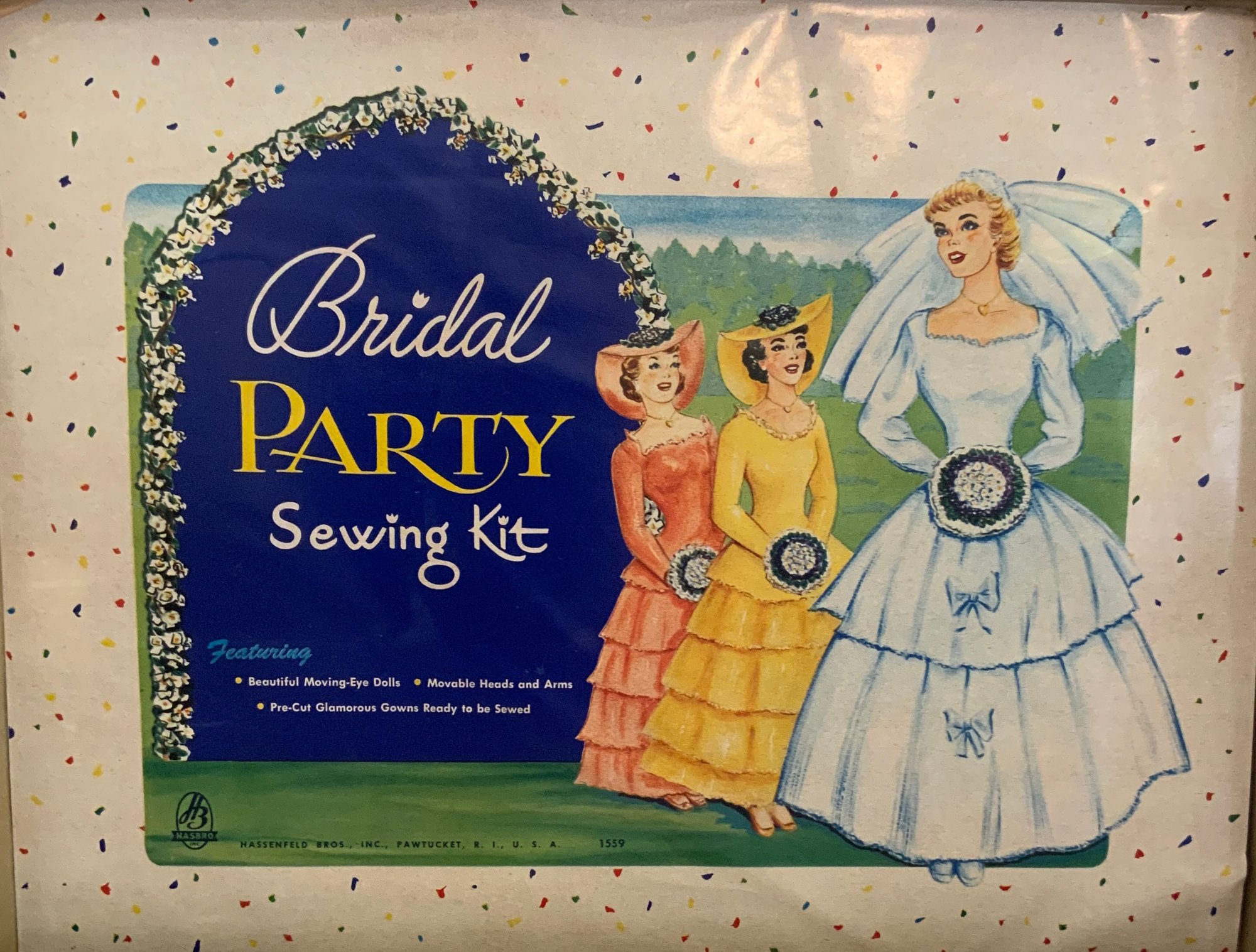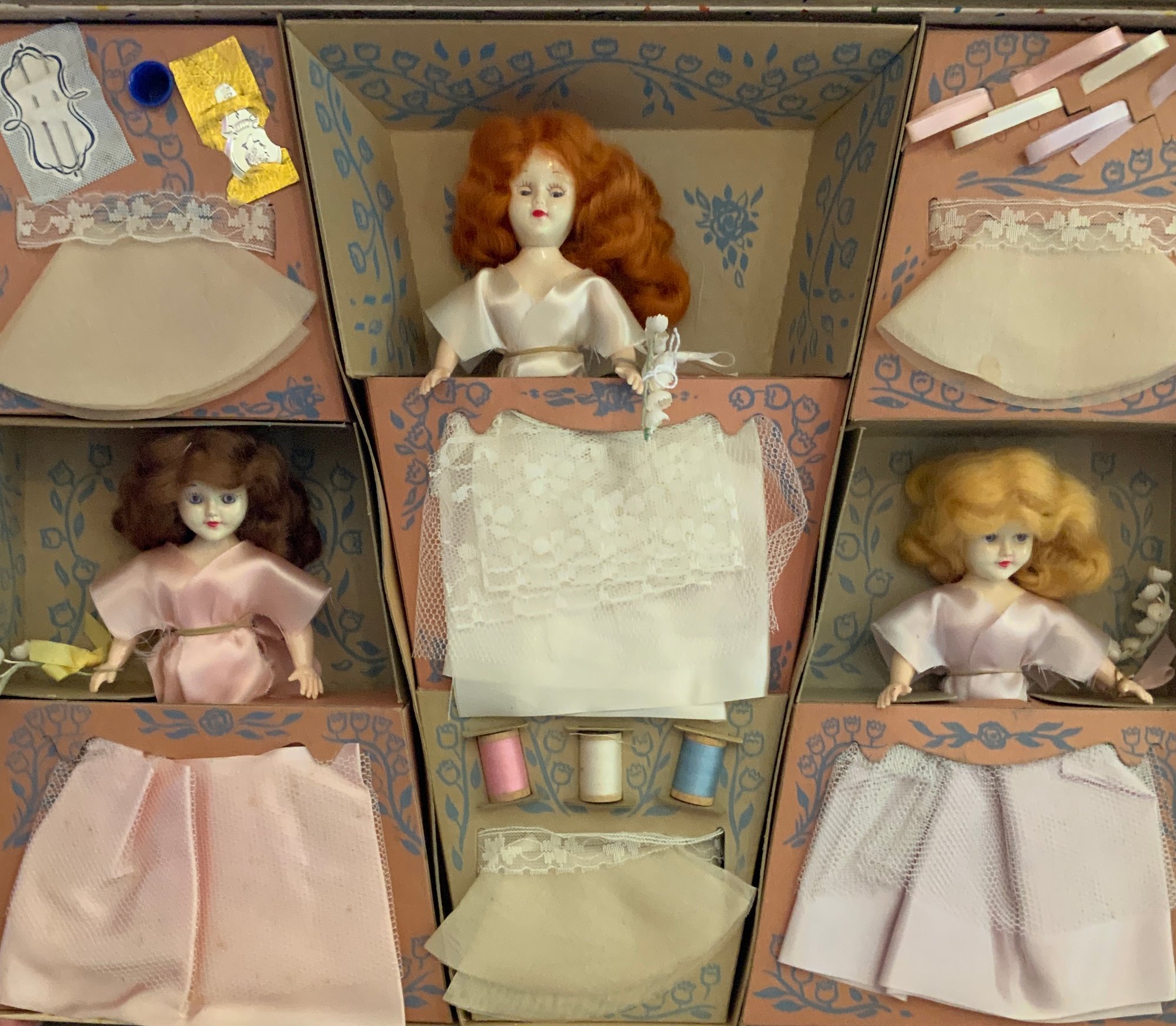 3 – Sewing kits, Bridal Party Sewing Kit #1559, Hassenfeld Brothers, Circa 1957, Bridal Party Sewing Kit # 1559, Hassenfeld Brothers, Circa 1955, Happy Time Sewing Kit # 153rown HH wig, 5SR, Hassenfeld Brothers for Sears & Roebuck, Circa 1950, original boxes