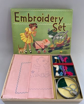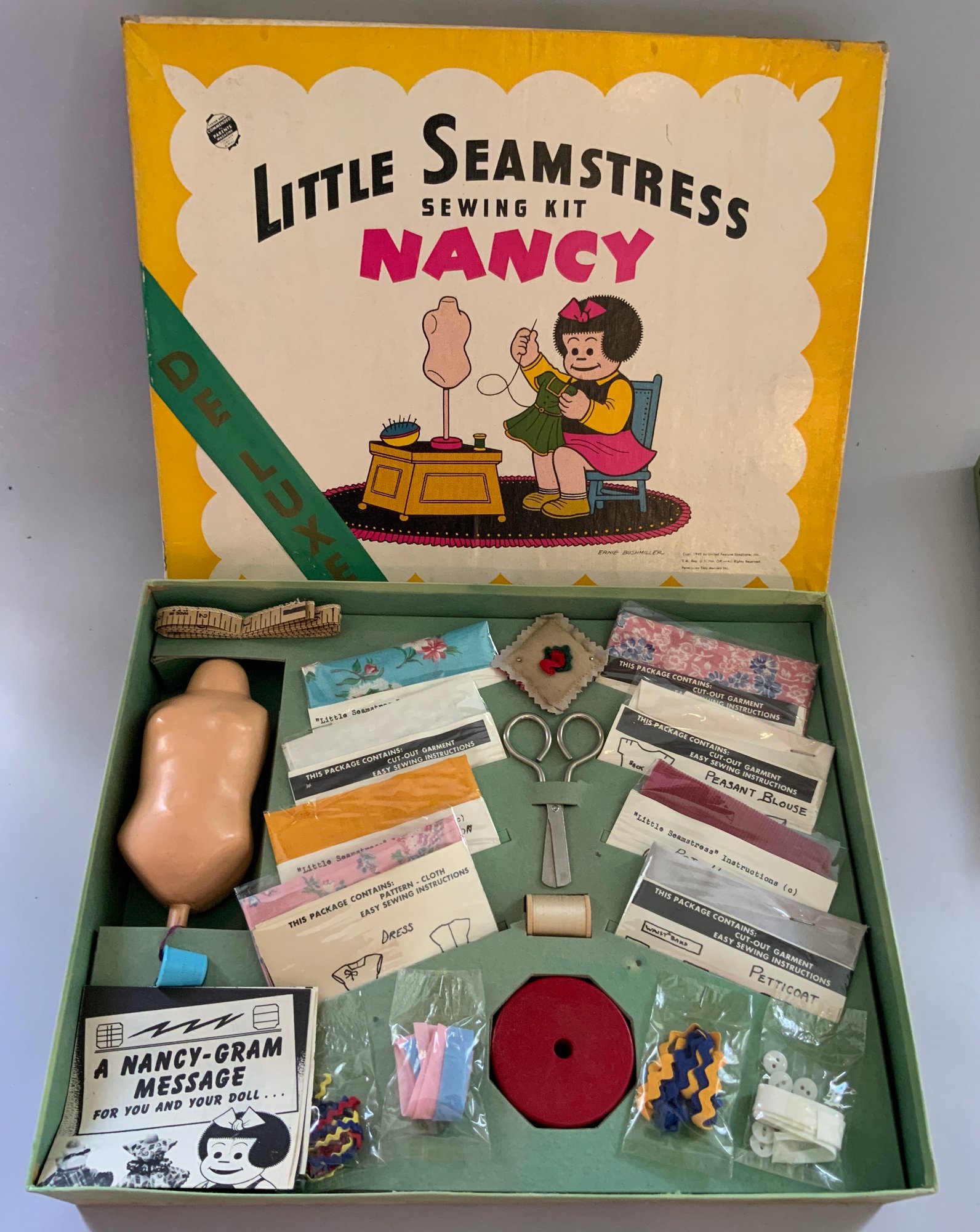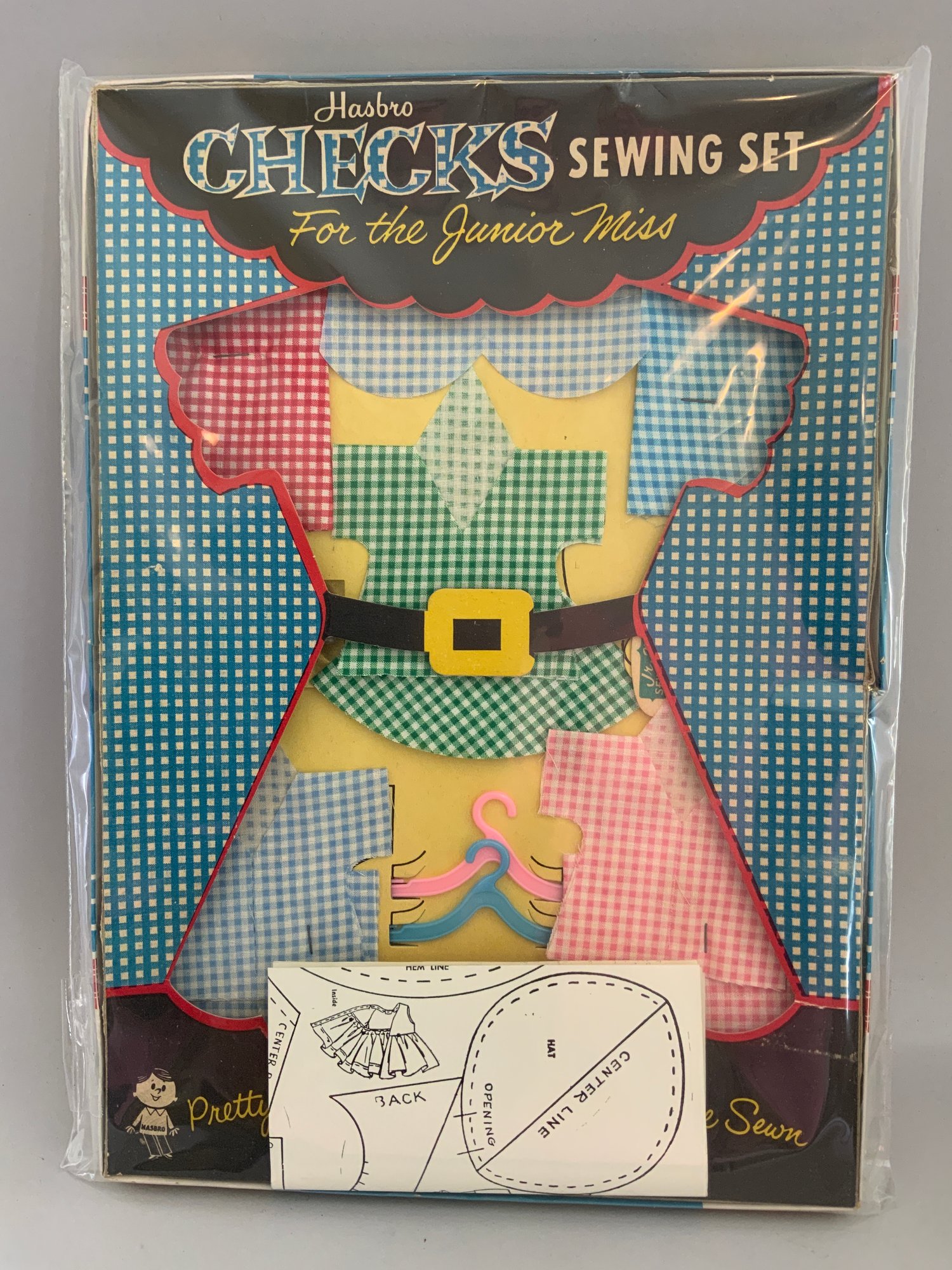 3 – Sewing sets with clothes, Little Seamstress Sewing Kit Nancy 1950, Ra-Gold Manufacturing Co. by artist Ernie Bushmiller, Embroidery Set 1960, Pastime Products, & Hasbro Checks Sewing Set for the Junior Miss #1530, original boxes some wear
