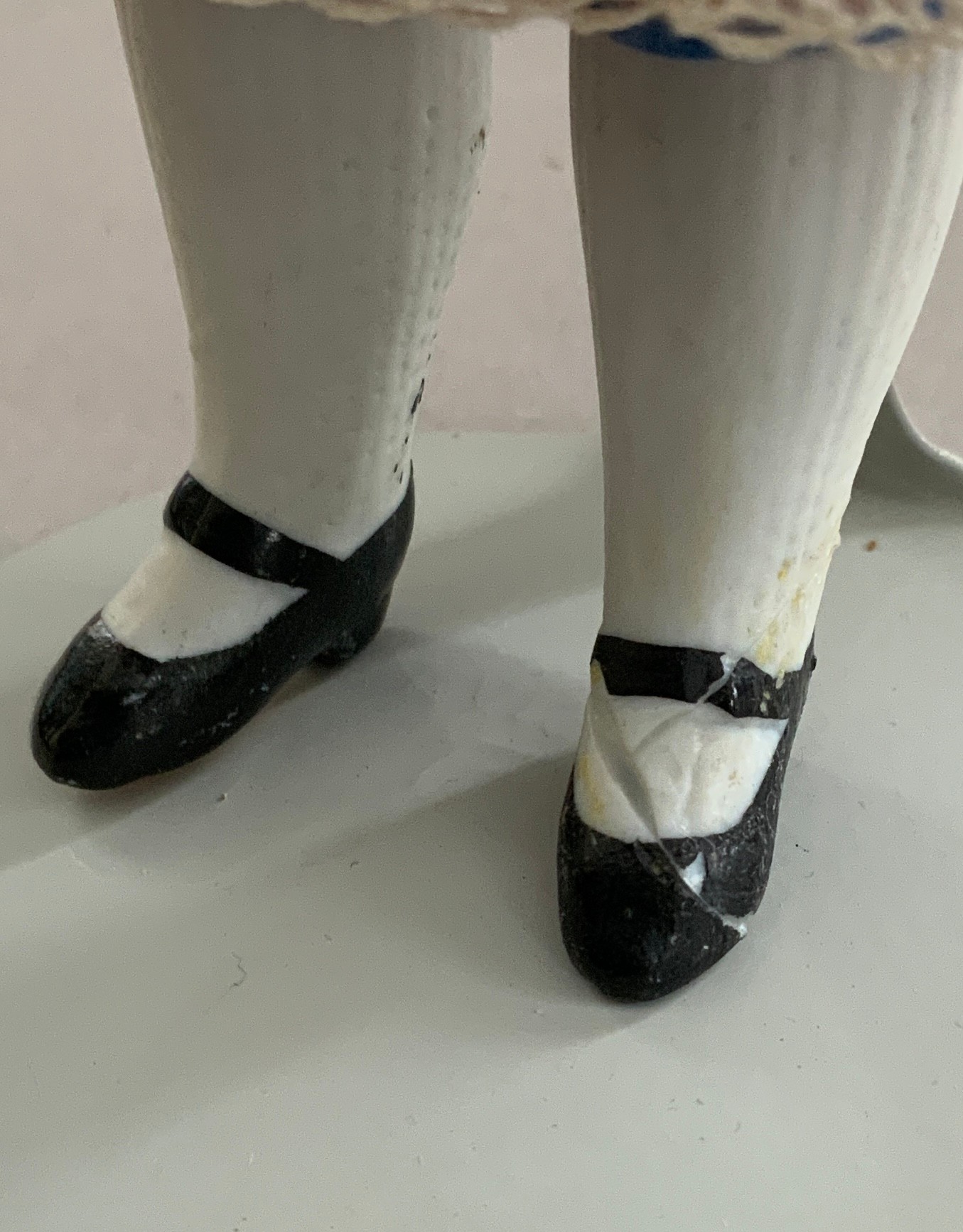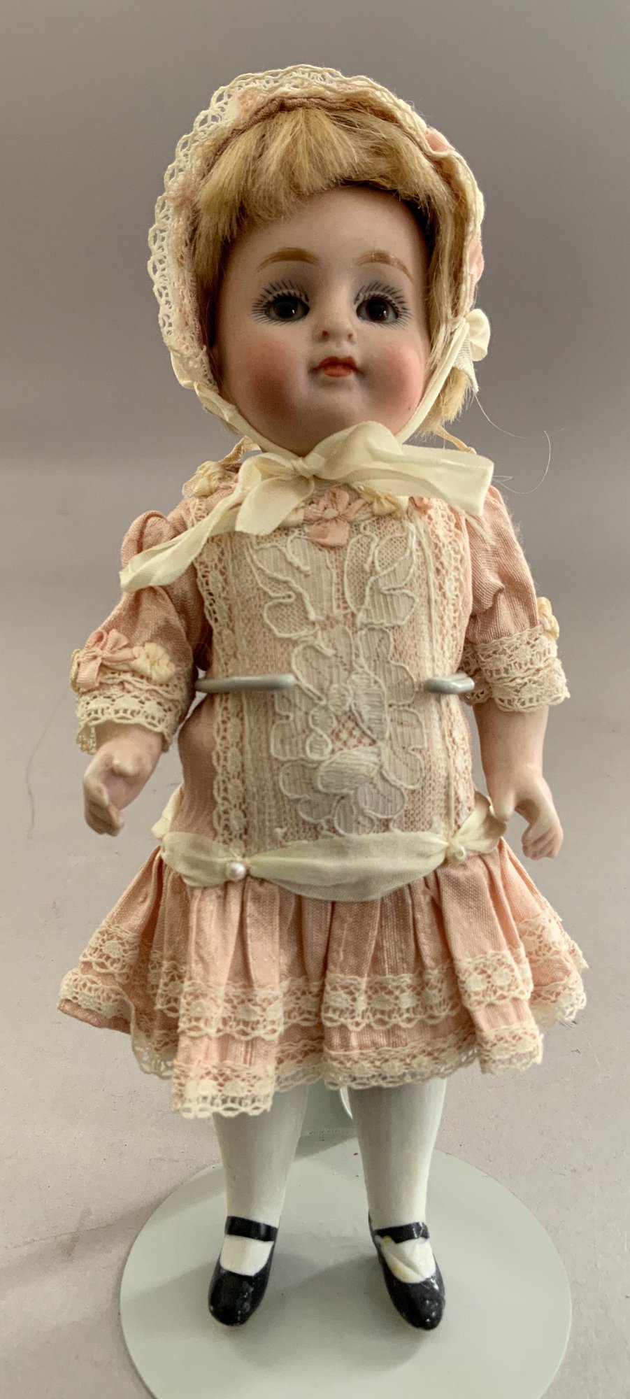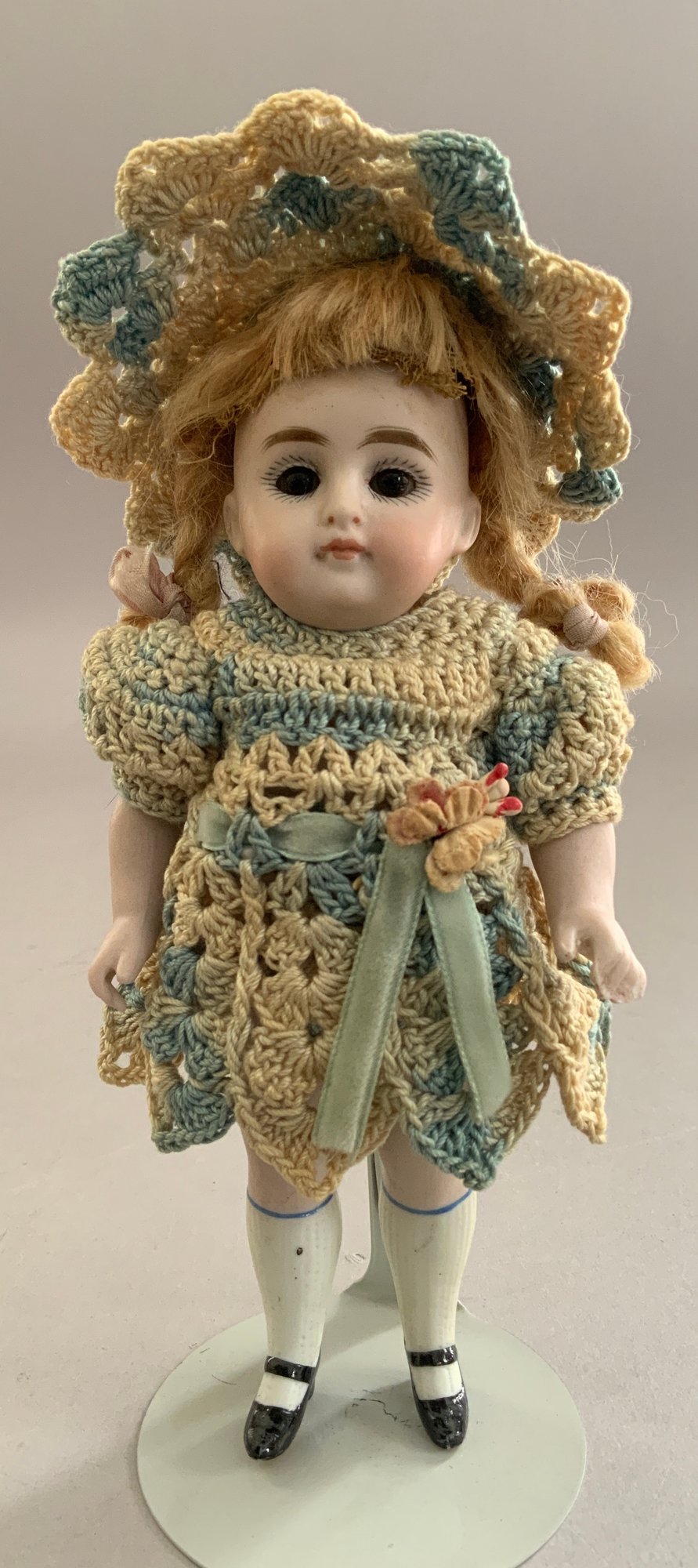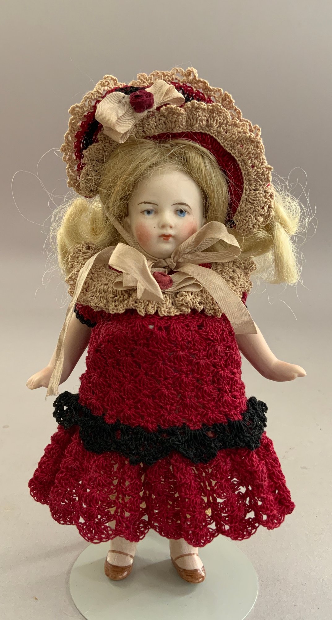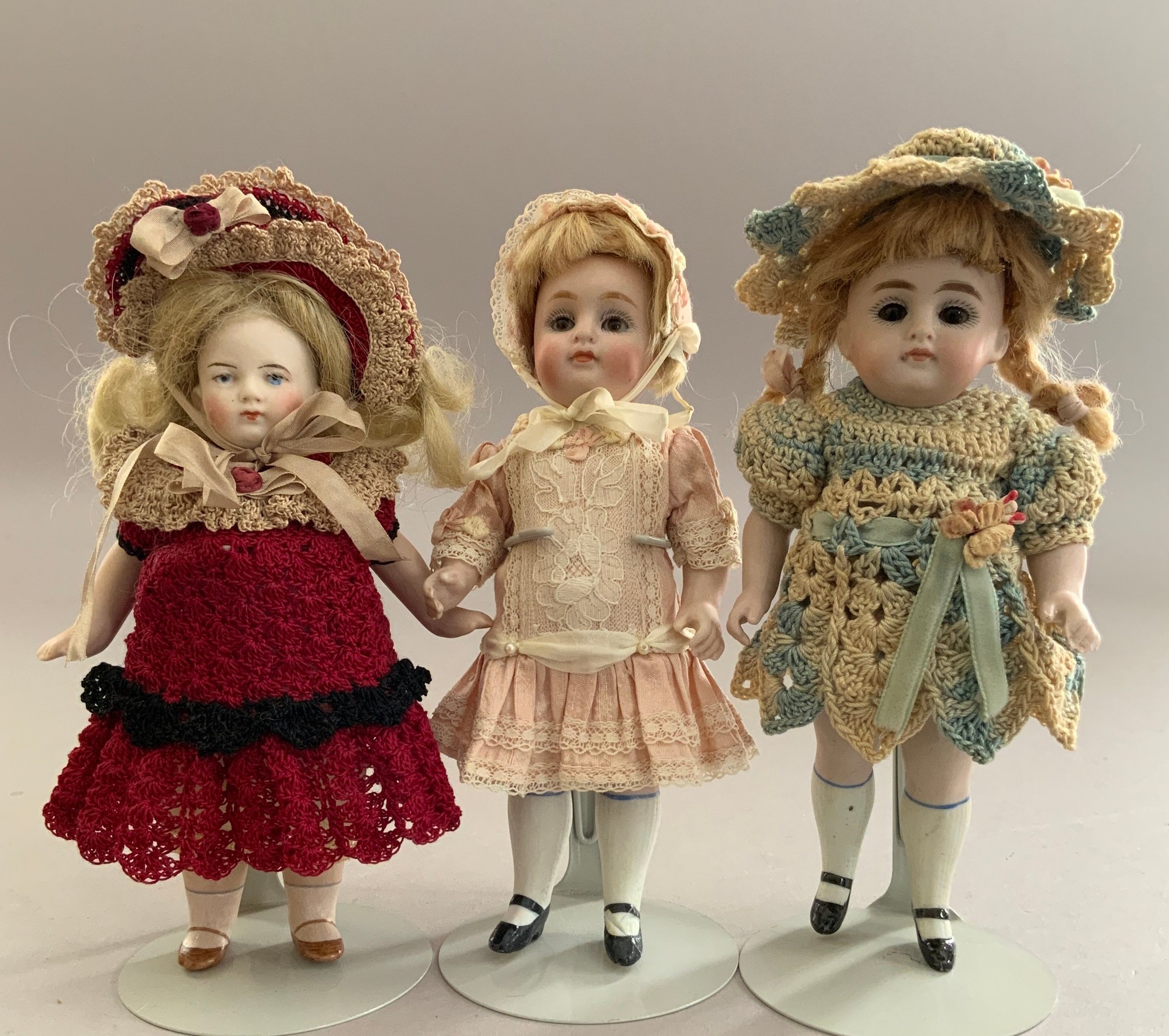 3 – Small all bisque dolls, 1 – 7” 100 1, brown glass sleep eyes, CM, blonde mohair wig, pink dress, painted socks & shoes (left foot repair), 1 – 7” 108, brown glass sleep eyes, CM, blonde mohair wig, knit outfit, painted socks & shoes, & 1 – 6 ½” 5114, painted features, CM, blonde mohair wig, knit outfit, painted socks & shoes