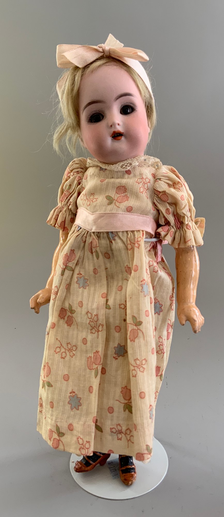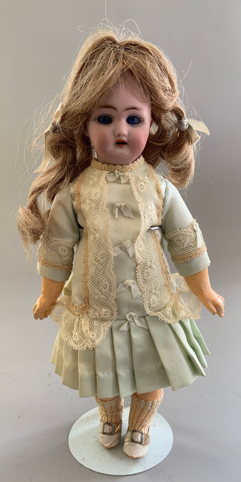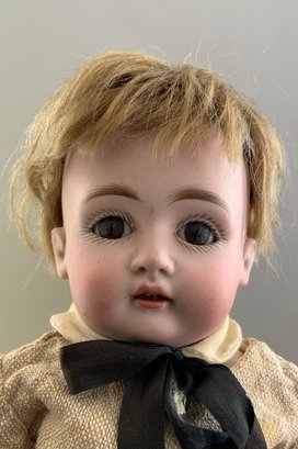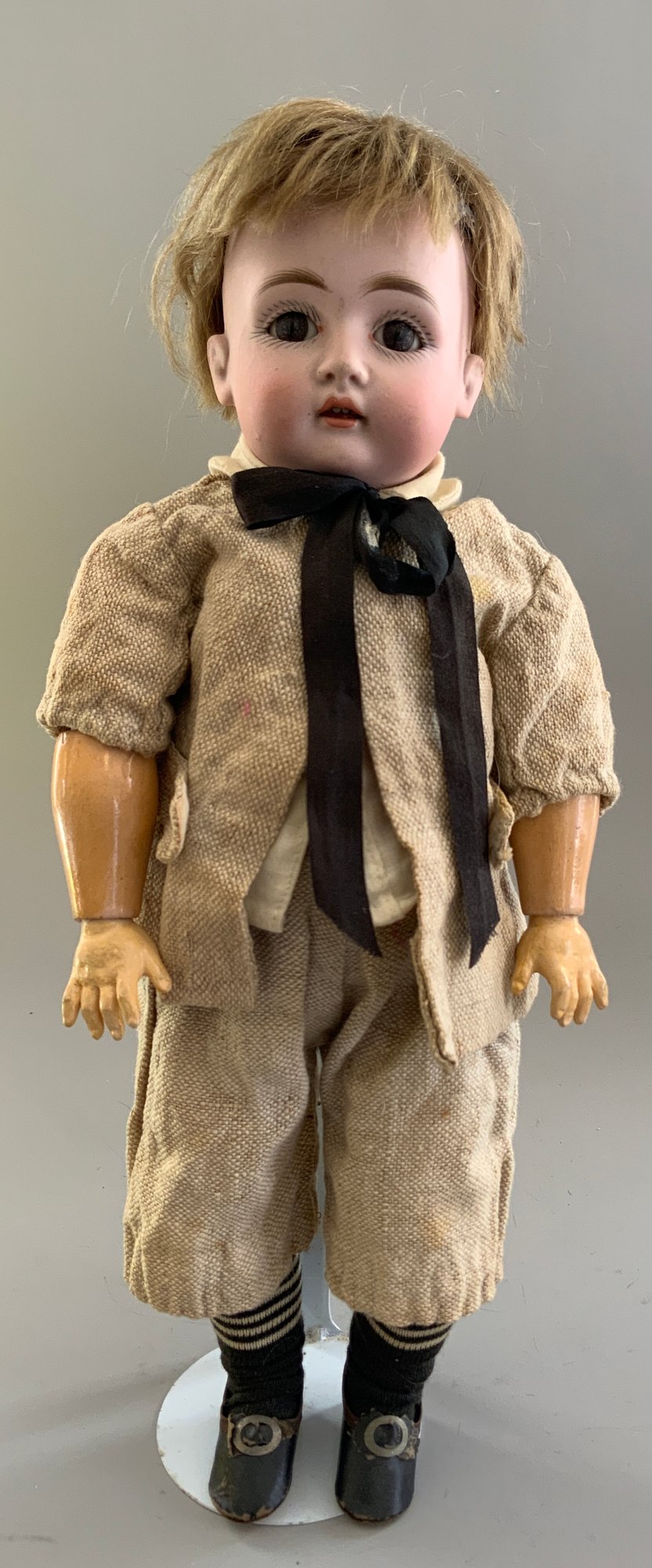3 – Small bisque dolls, 1 – 9 ½” S&H 1078, blue glass sleep eyes, OM with teeth, blonde mohair wig, straight wrist compo body, green dress, 1 – 11” K*R S&H 1, brown glass sleep eyes, OM with teeth, blonde mohair wig, PE, straight wrist compo body, floral dress, painted sock & shoes & 1 – 13” Kestner 167 boy, brown glass sleep eyes, OM with teeth, blonde mohair wig, BJCB, tan linen suit
