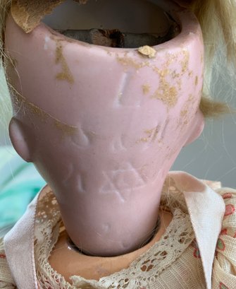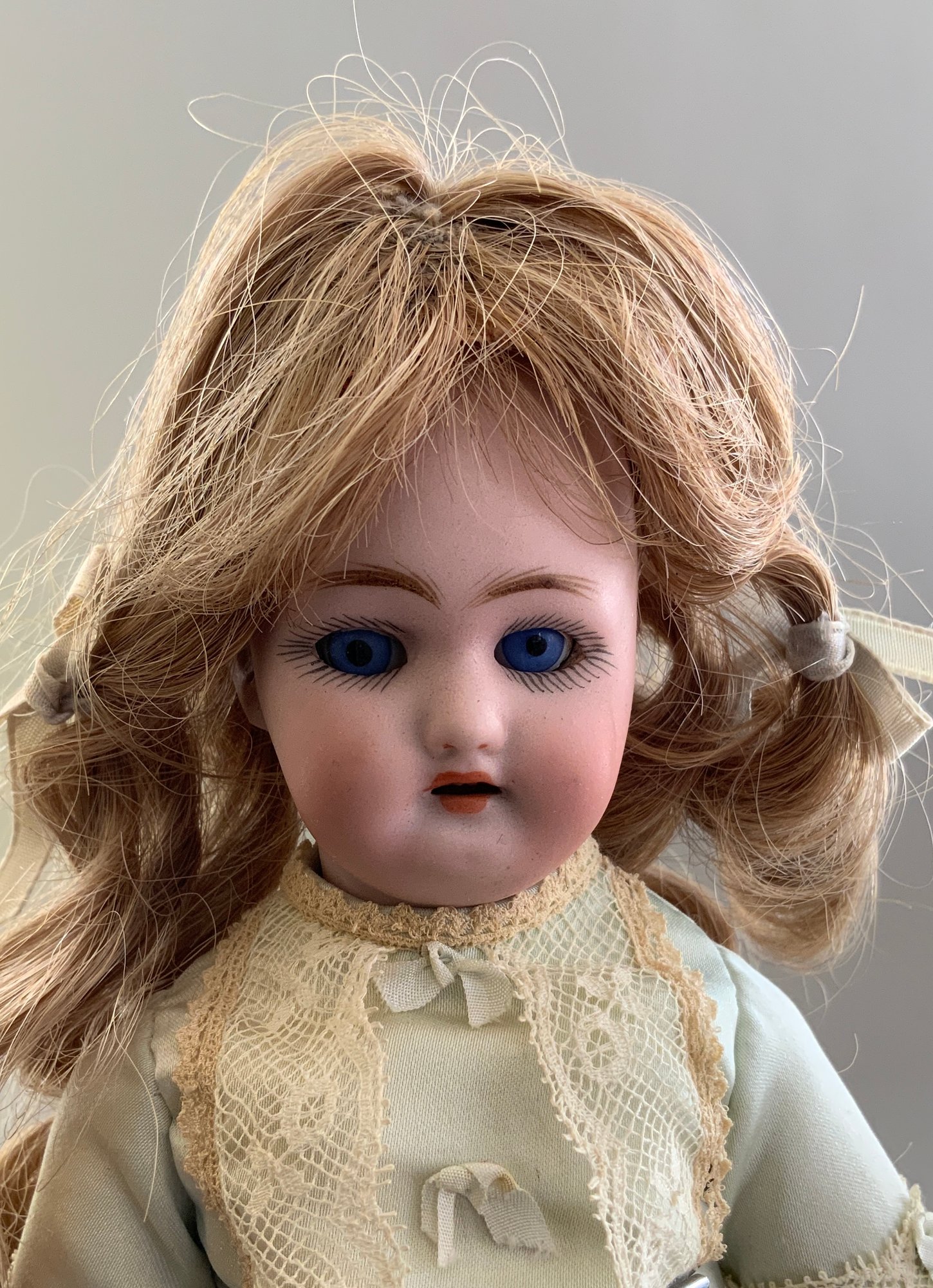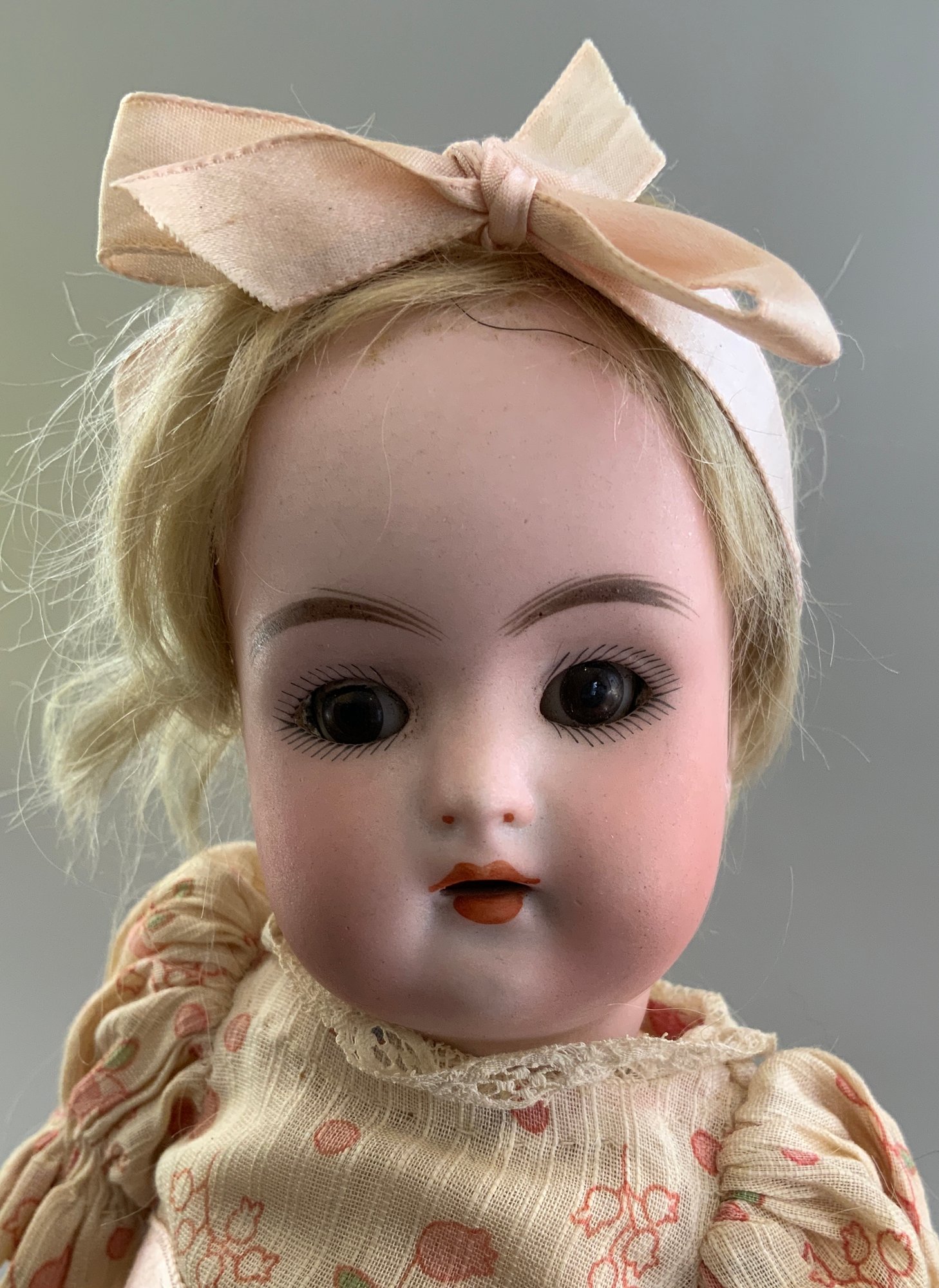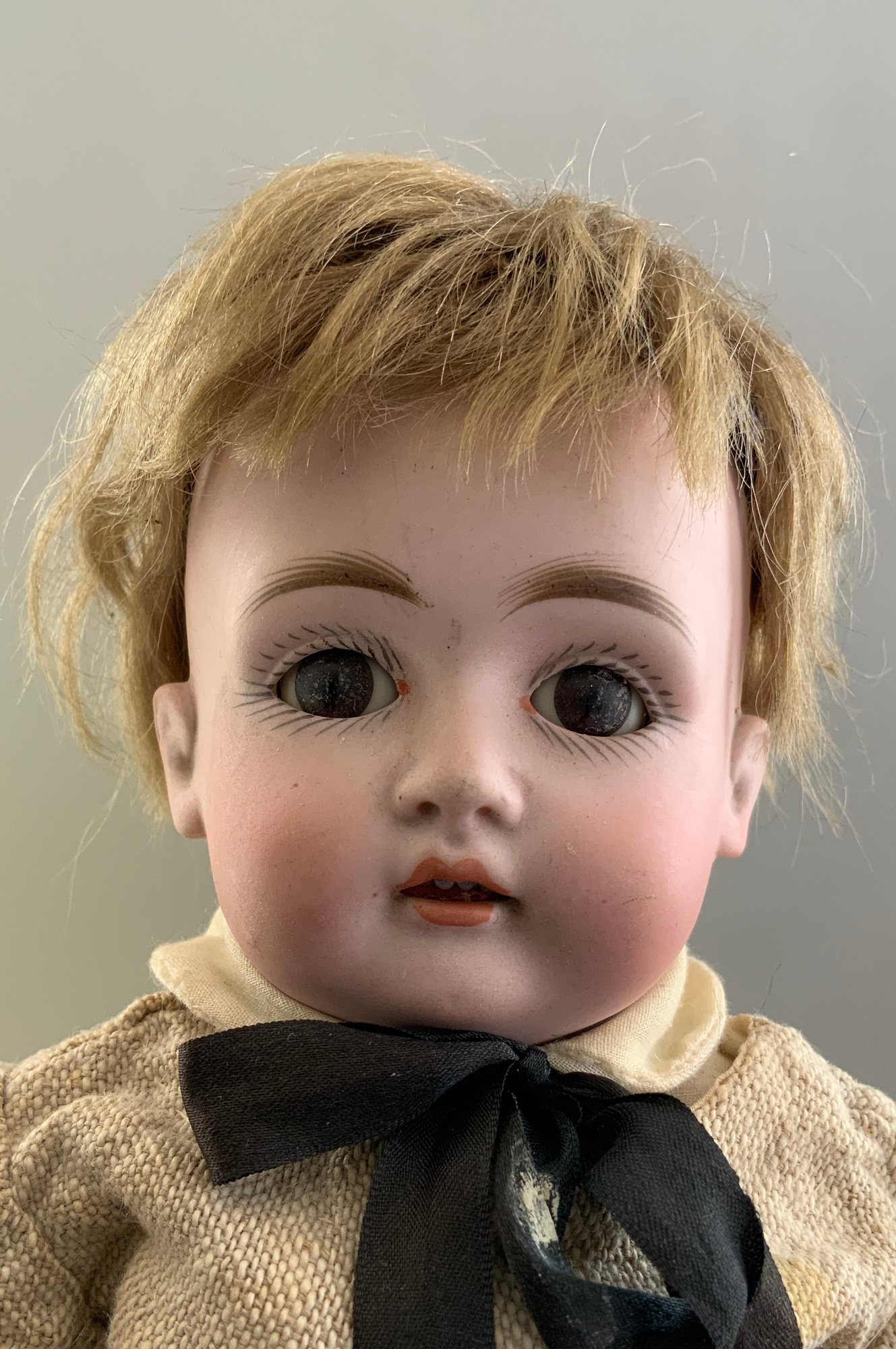3 – Small bisque dolls, 1 – 9 ½” S&H 1078, blue glass sleep eyes, OM with teeth, blonde mohair wig, straight wrist compo body, green dress, 1 – 11” K*R S&H 1, brown glass sleep eyes, OM with teeth, blonde mohair wig, PE, straight wrist compo body, floral dress, painted sock & shoes & 1 – 13” Kestner 167 boy, brown glass sleep eyes, OM with teeth, blonde mohair wig, BJCB, tan linen suit